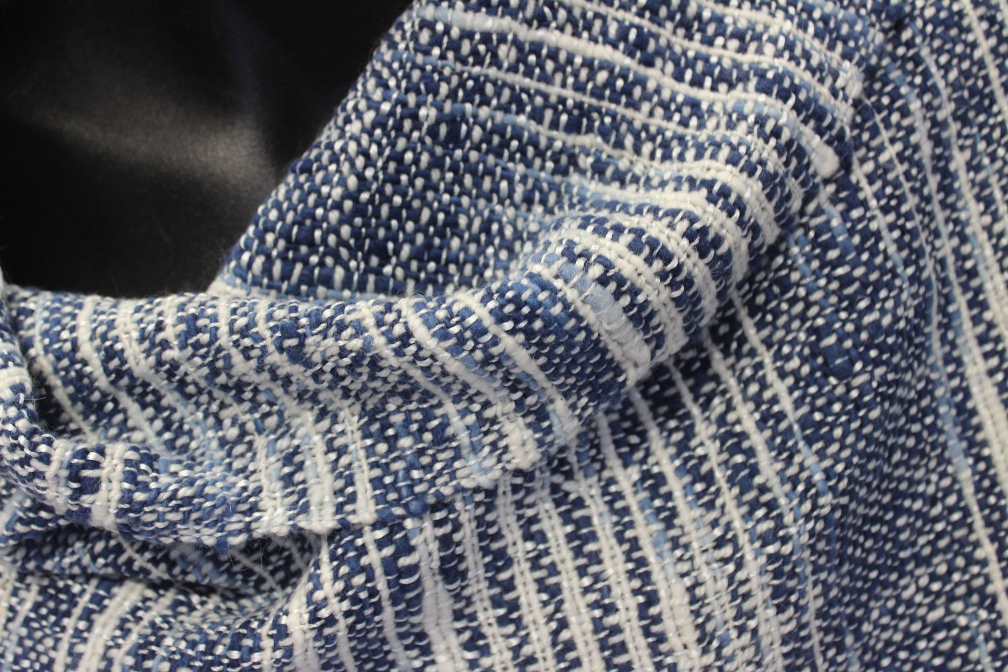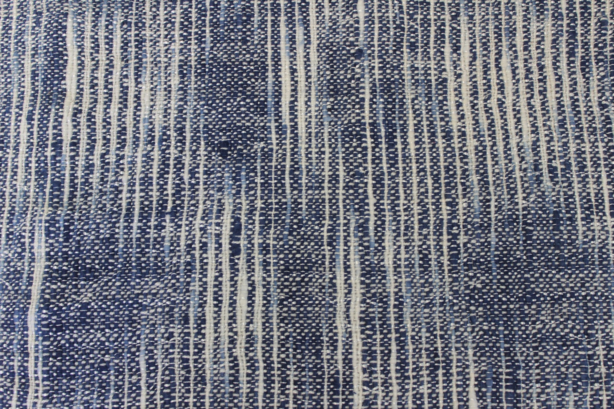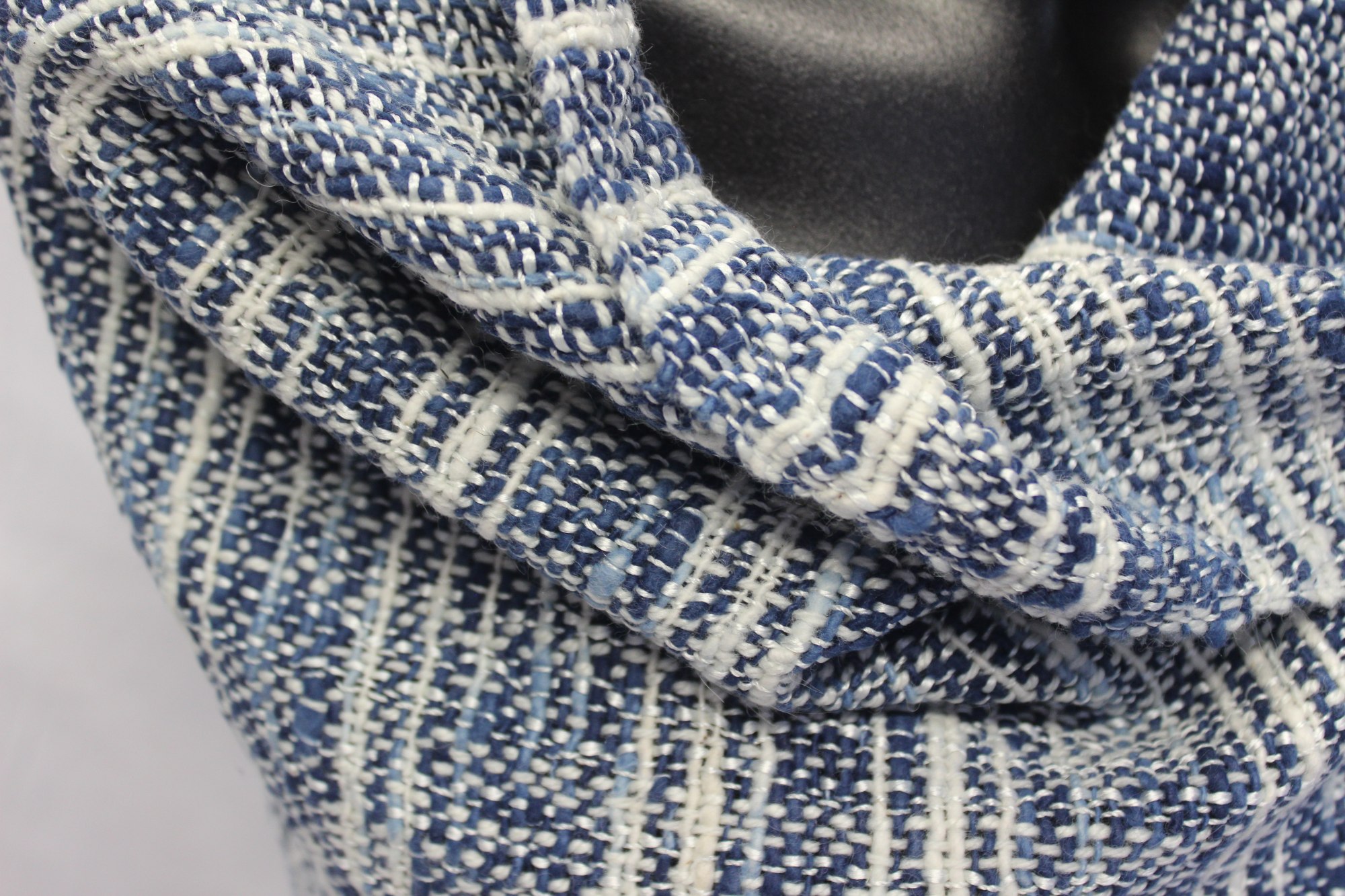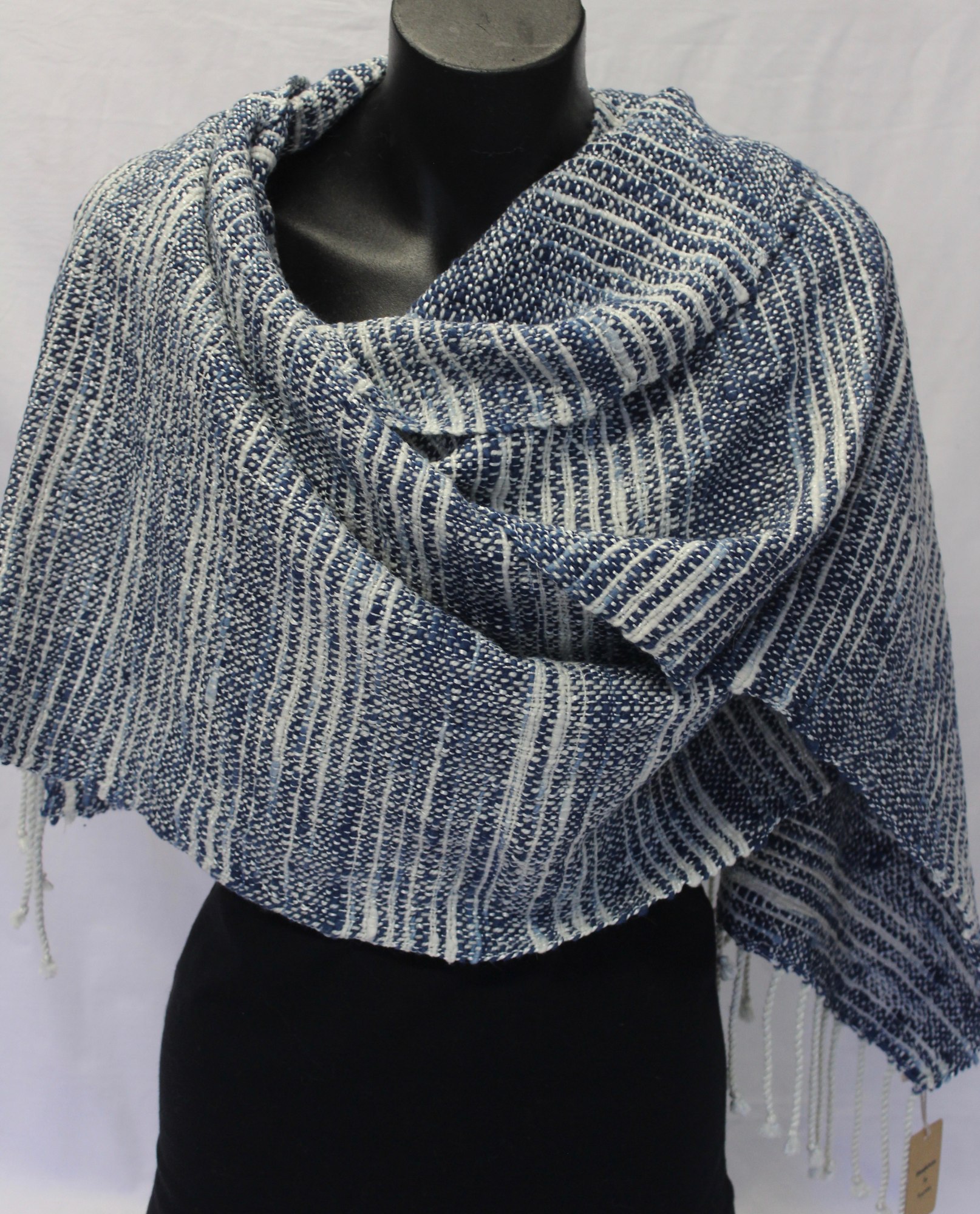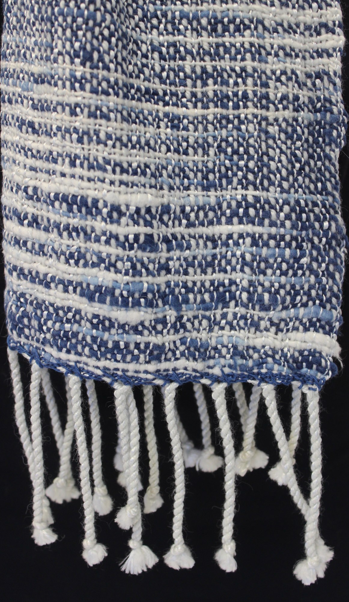 Handwoven shawl made from white merino, silk, angora and alpaca warp, with blue cotton weft.