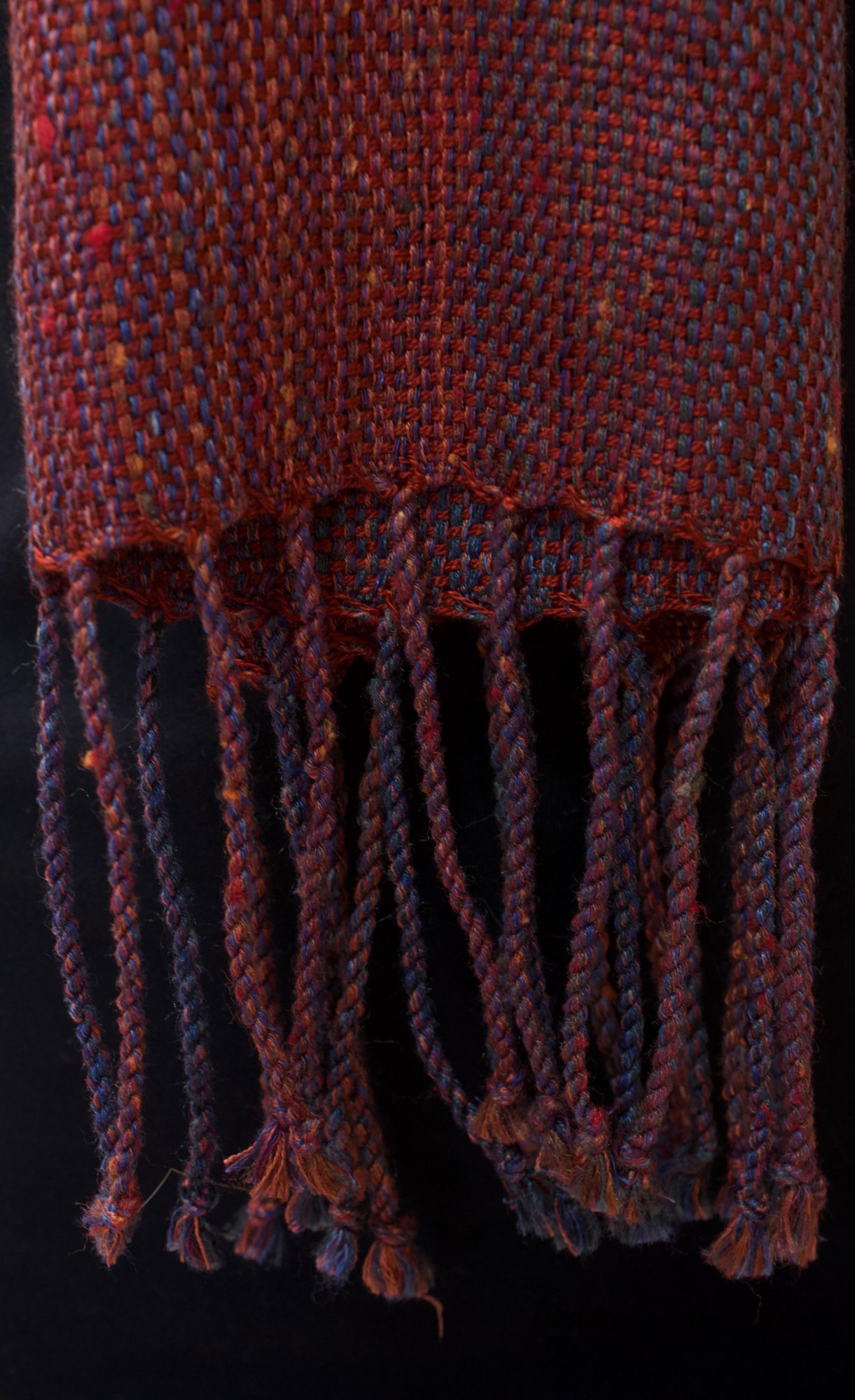 Shawl made from red and blue linen, silk, cotton and tencel.
