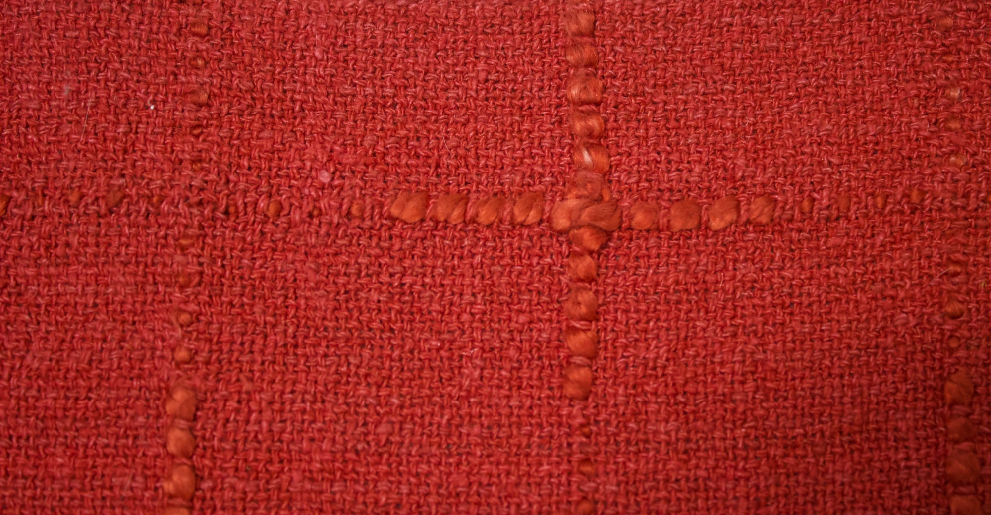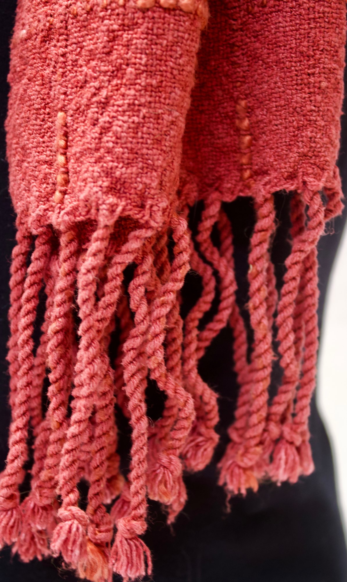 Shawl made from red noil and mulberry silk. Plain weave with supplementary warp and weft.