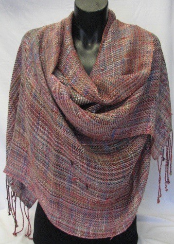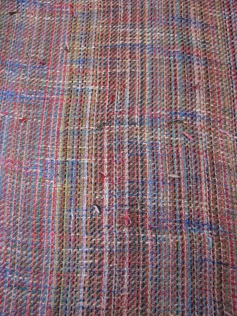 Shawl made from multi coloured thrums in linen, cotton, tencel, silk and wool warp and linen/silk weft.