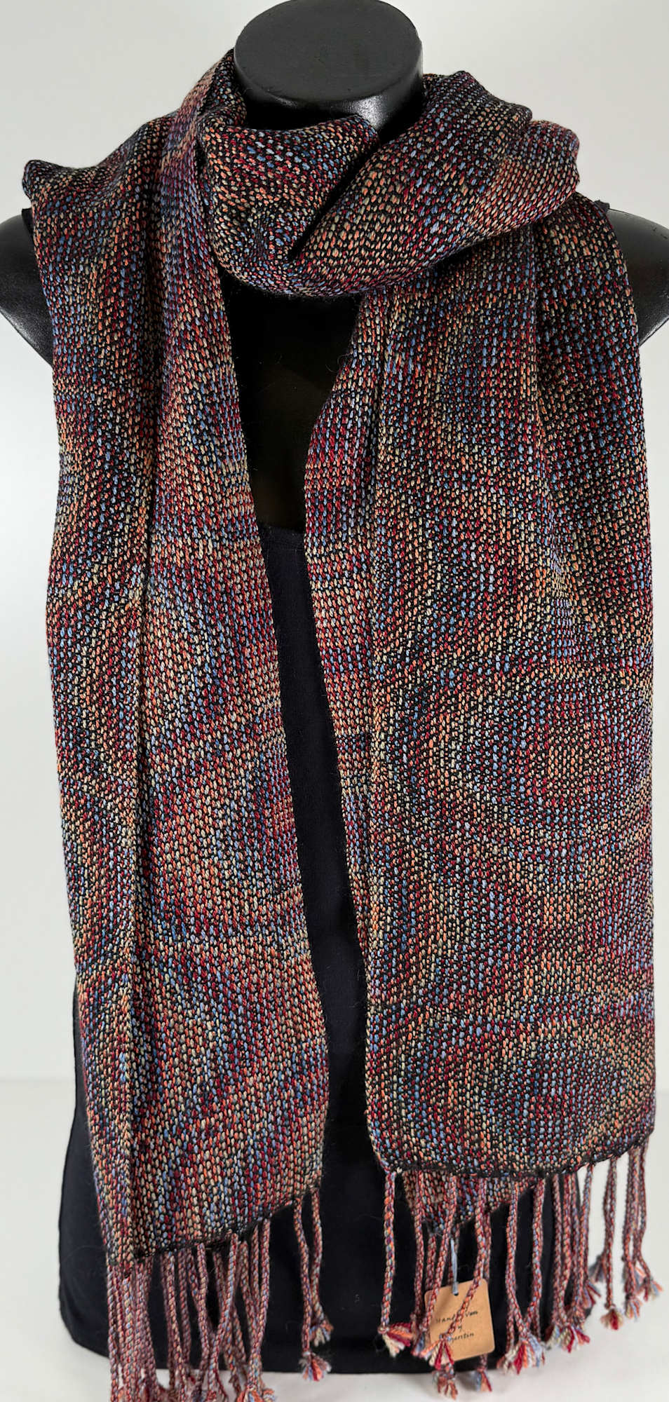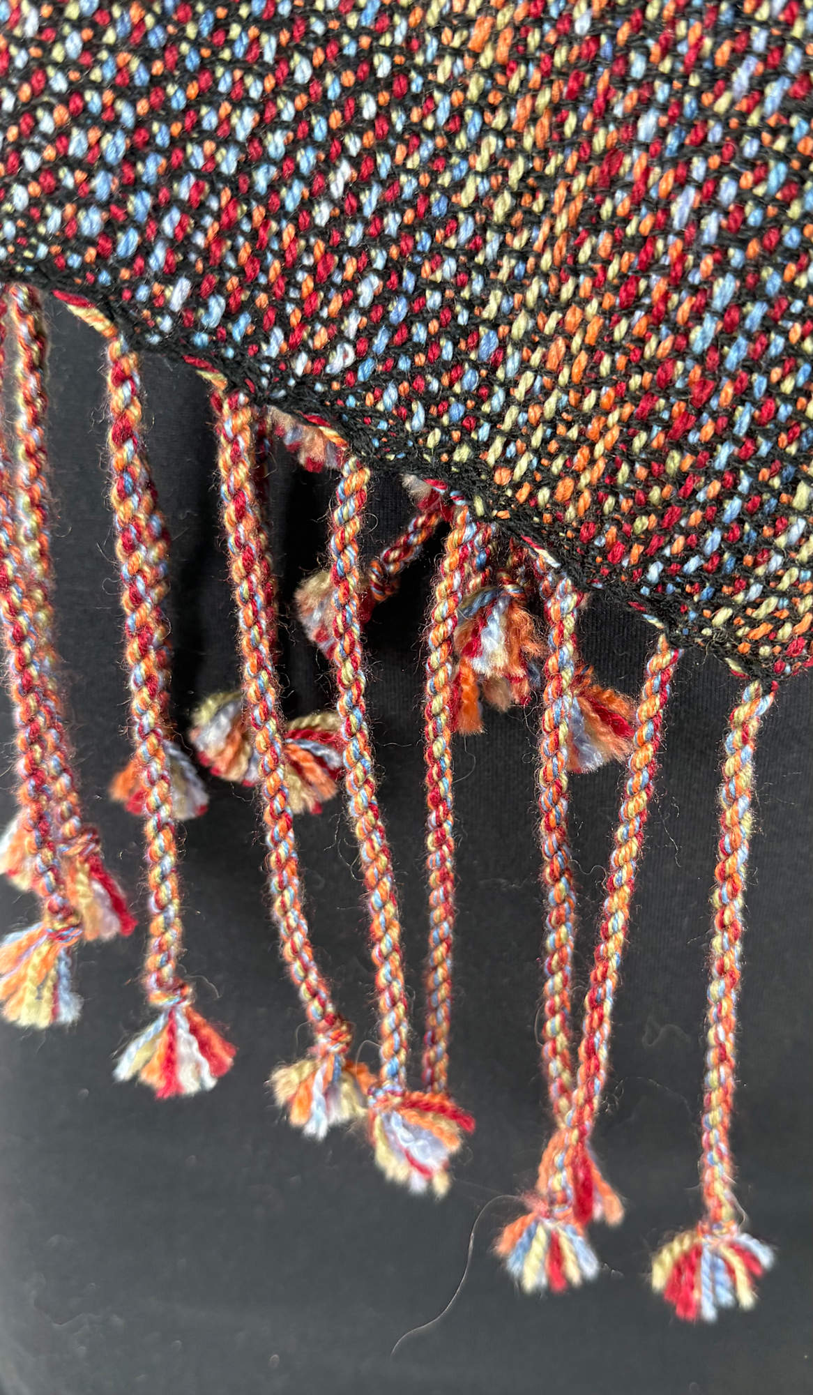 Shawl made from wool and silk in blue, red, orange and green. Shadow weave with a black weft.