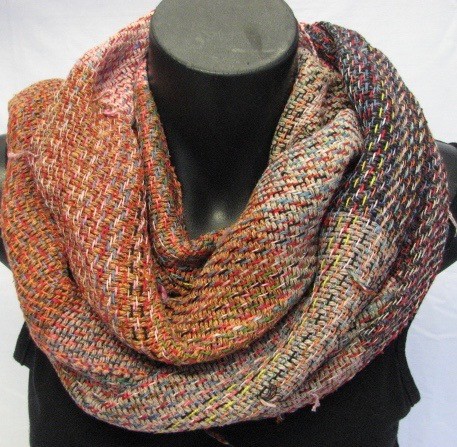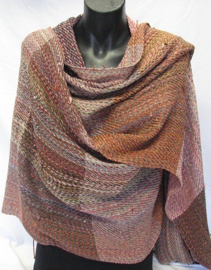 Shawl made from multi coloured thrums in linen, cotton, tencel, silk and wool warp and noil silk weft.