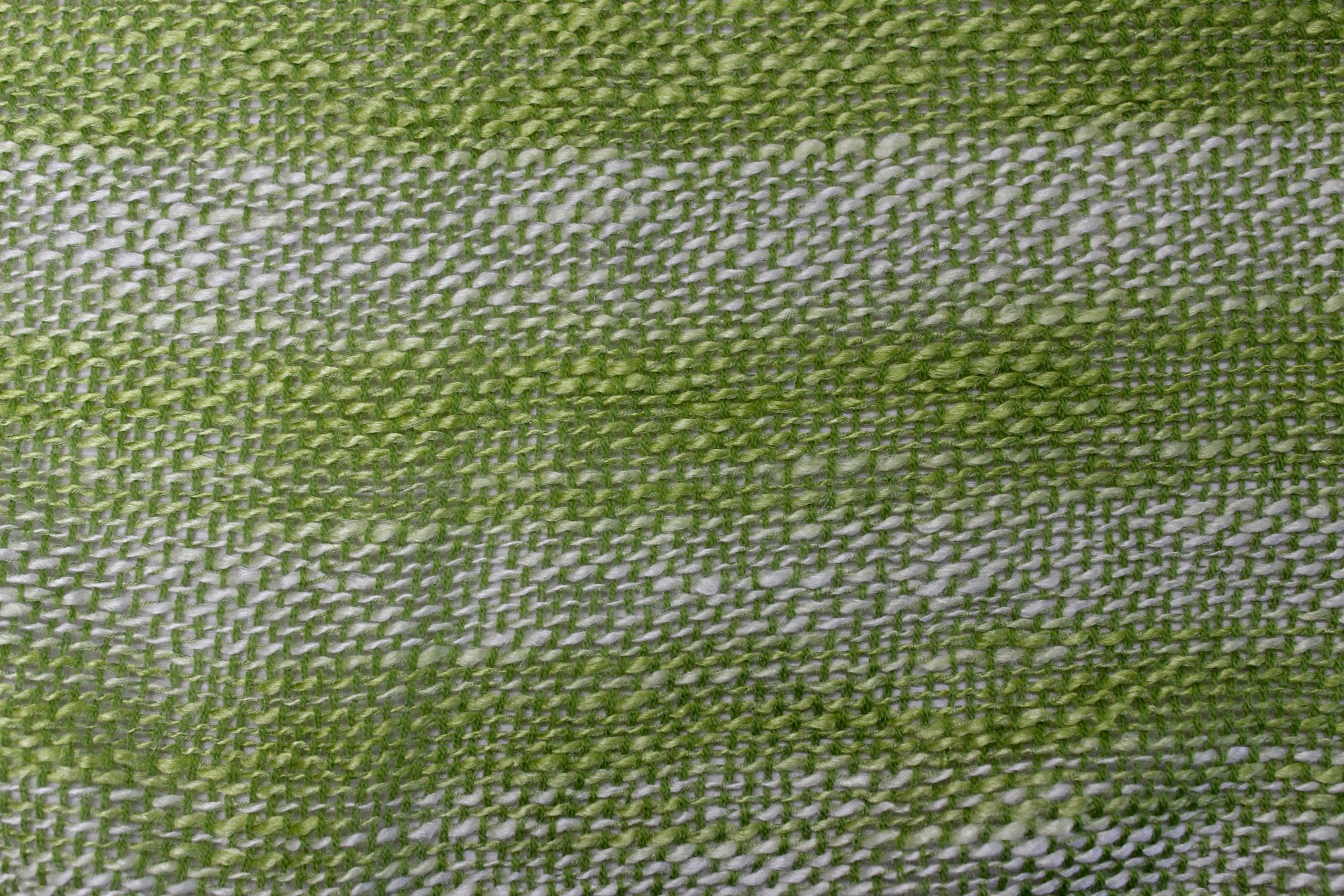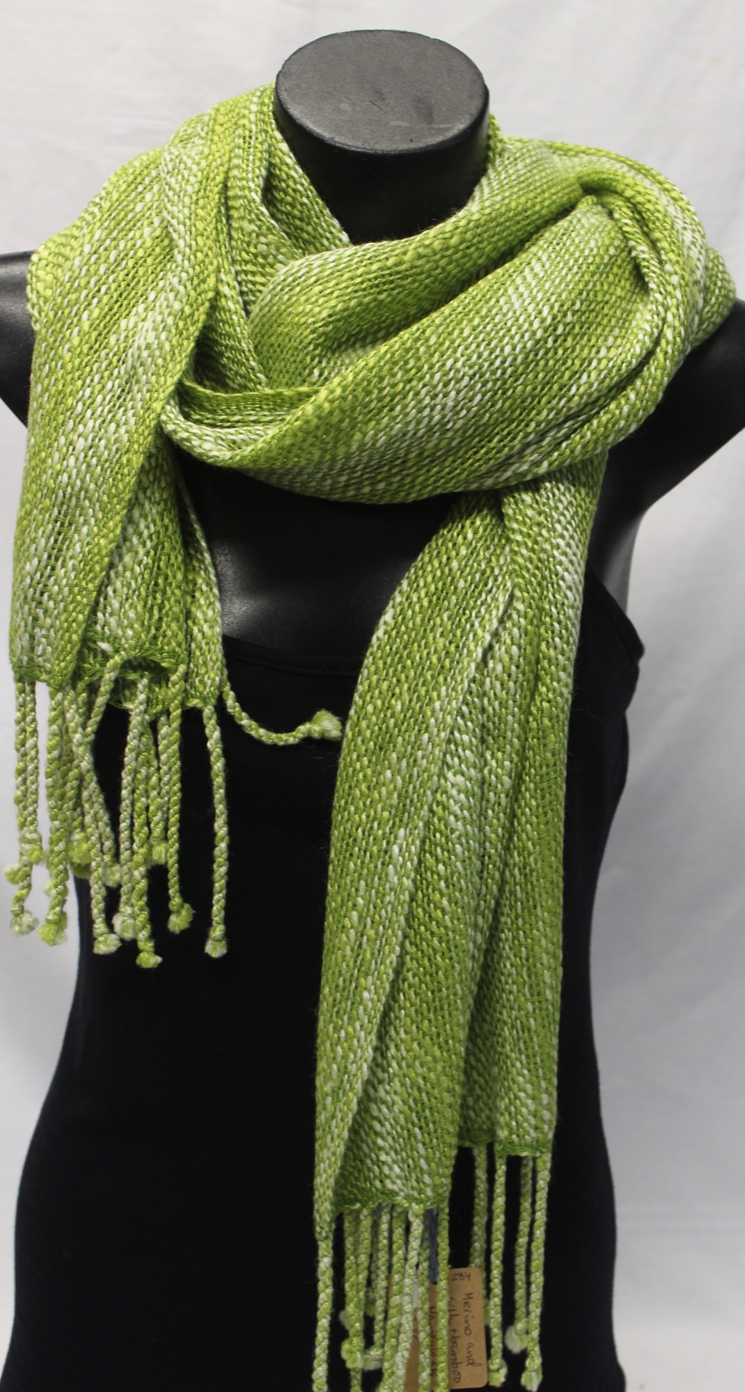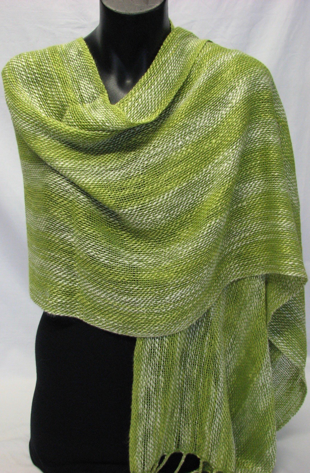 Shawl made from hand spun silk/merino, plied with bamboo warp and merino weft. All in green. Plain weave.
