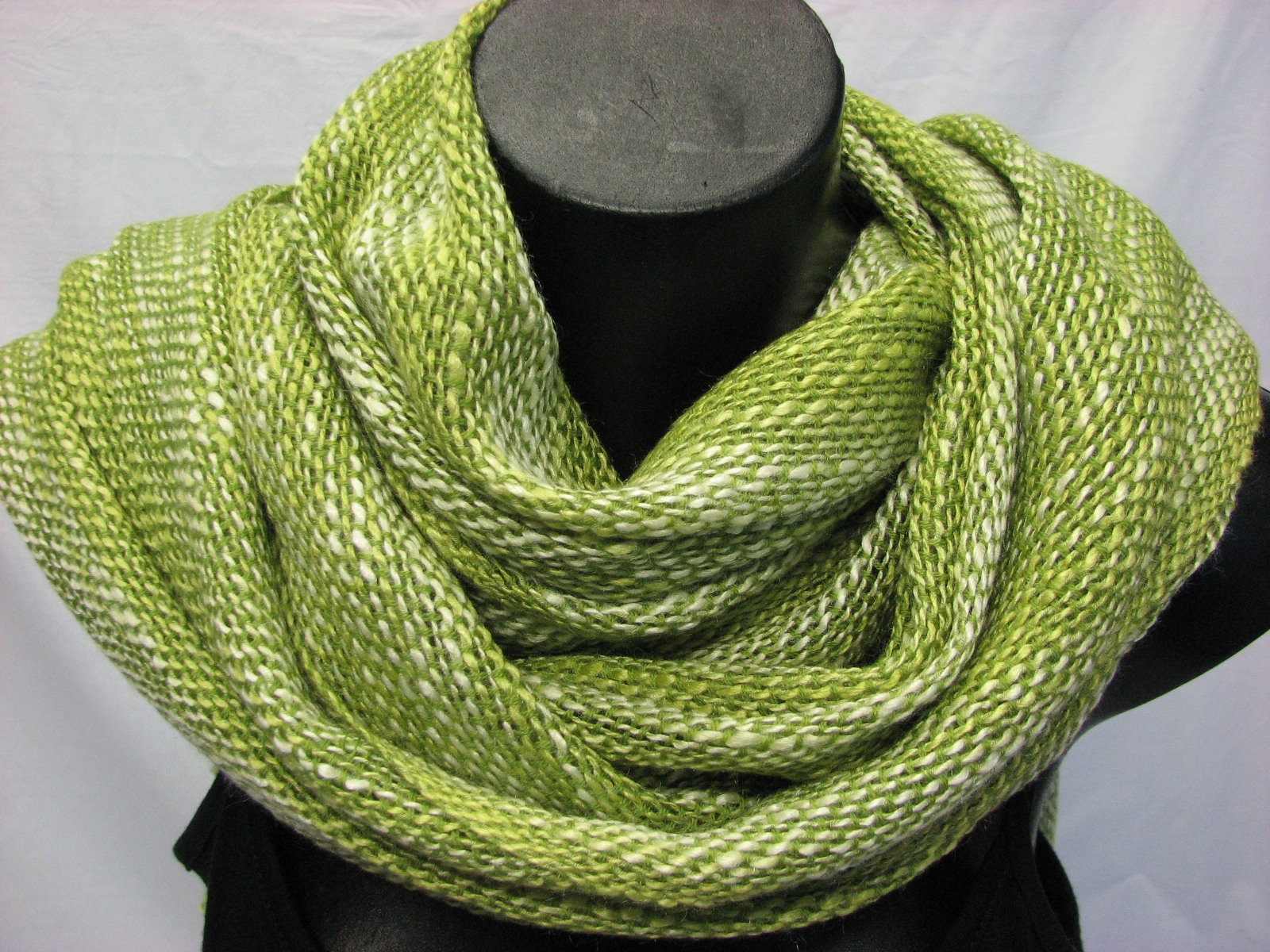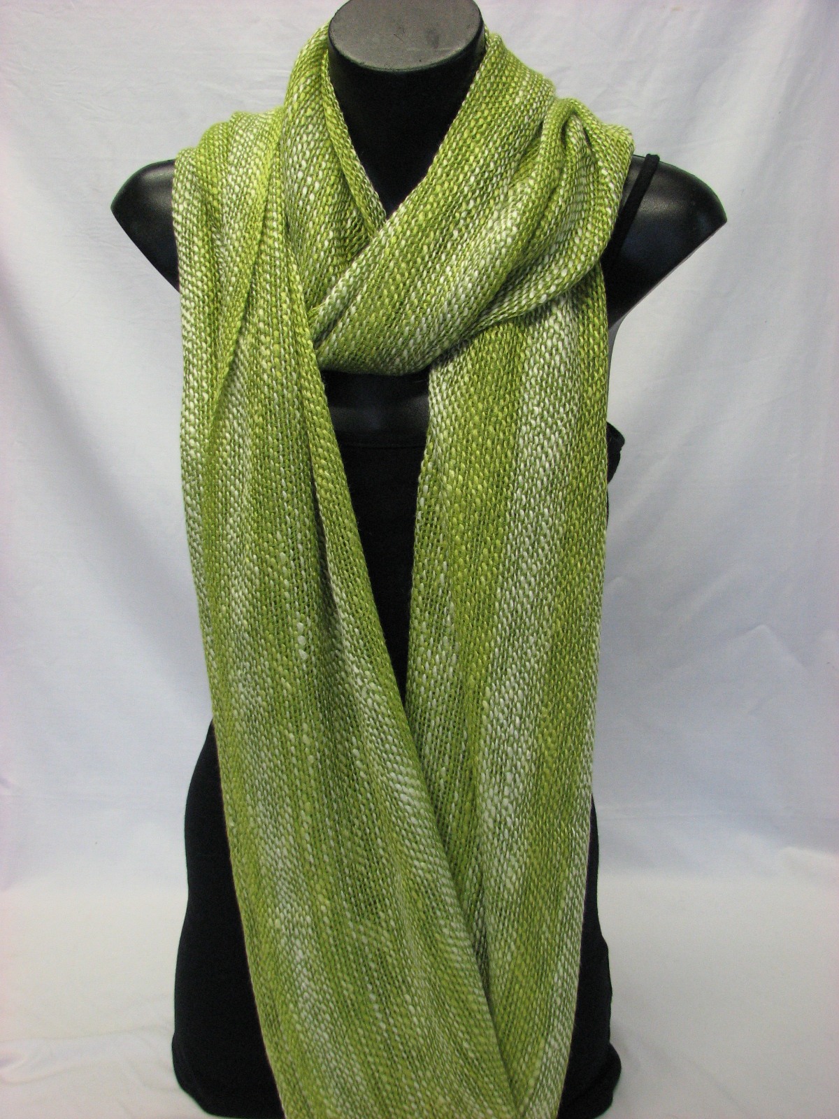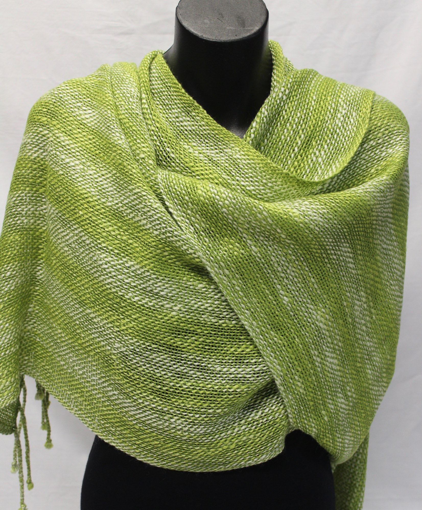 Shawl made from hand spun silk/merino, plied with bamboo warp and merino weft. All in green. Plain weave.