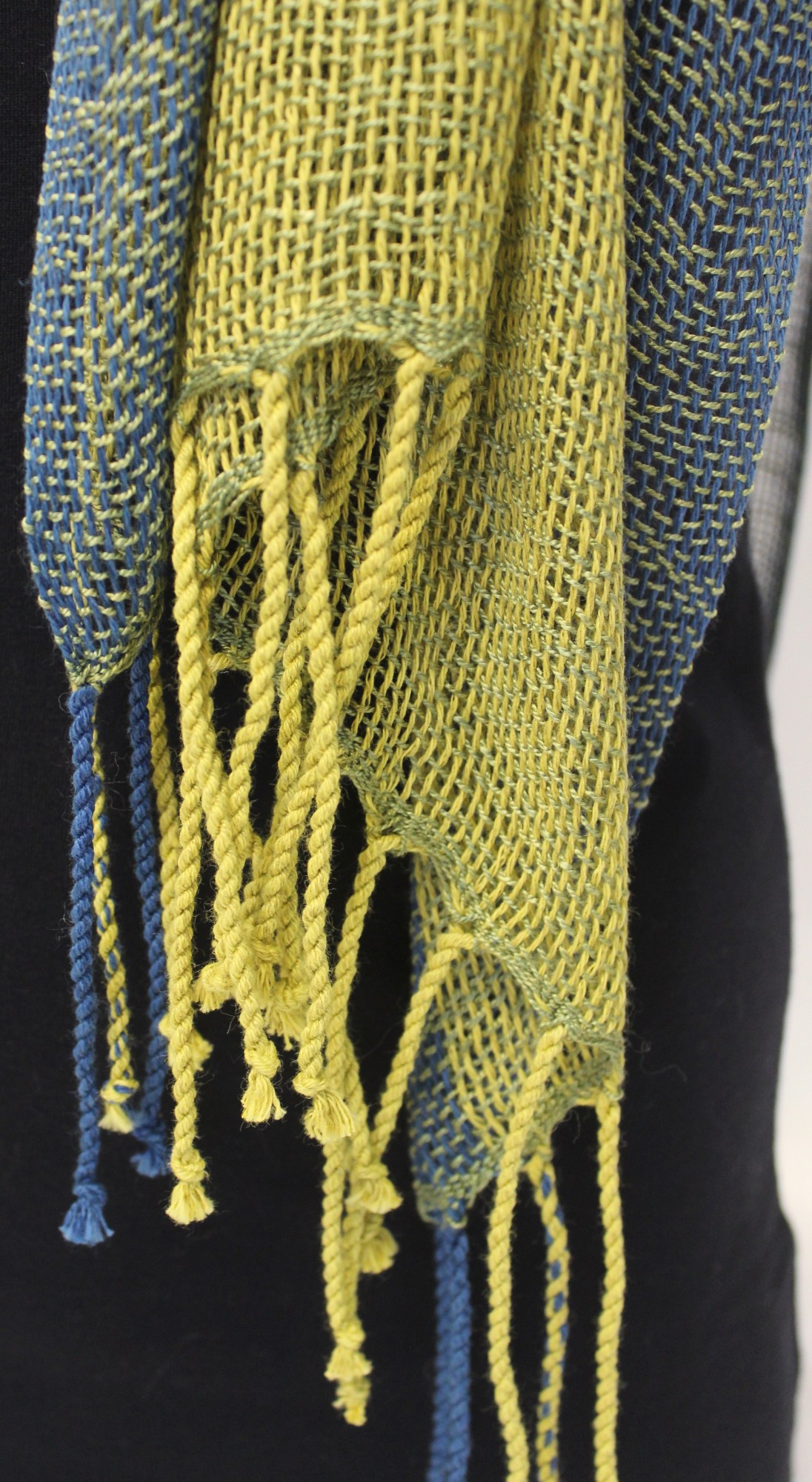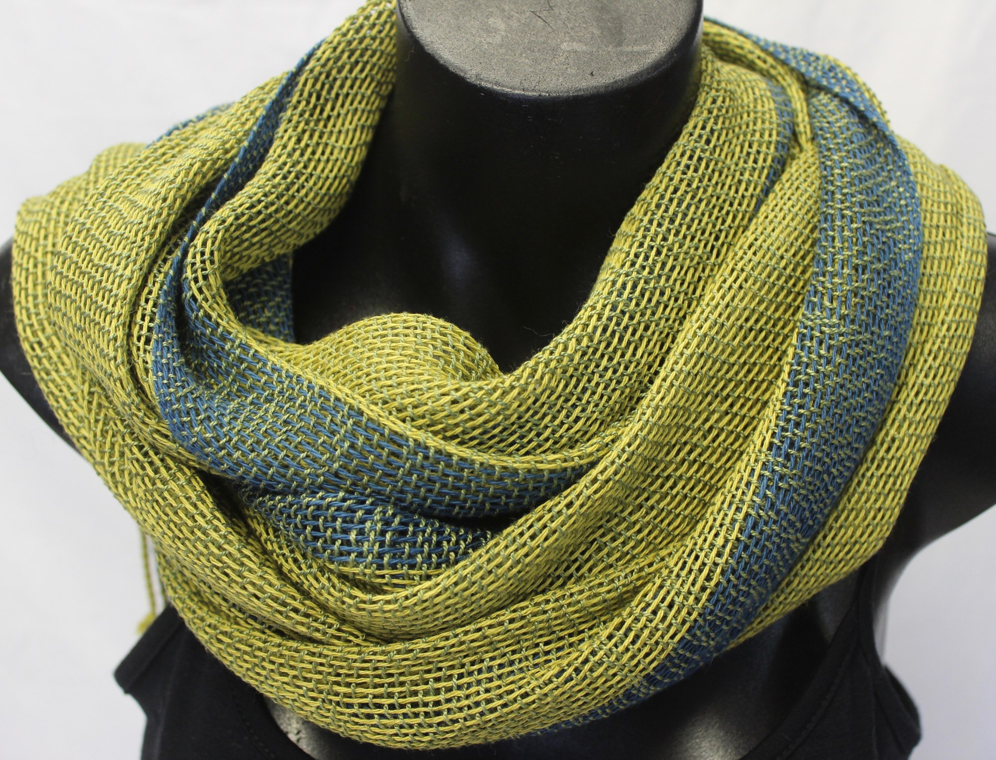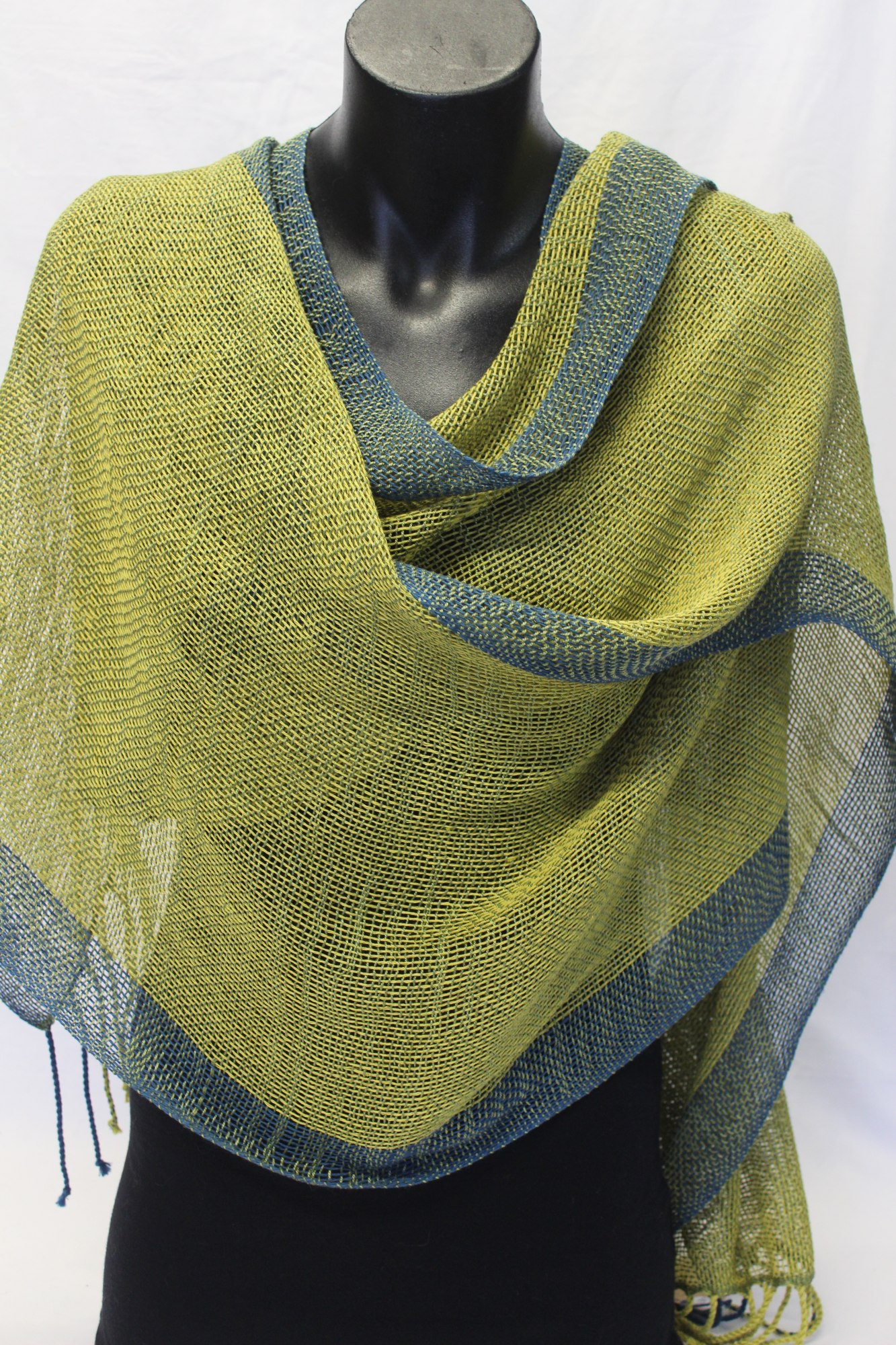 Shawl made from blue and green cotton/linen warp and green silk weft.