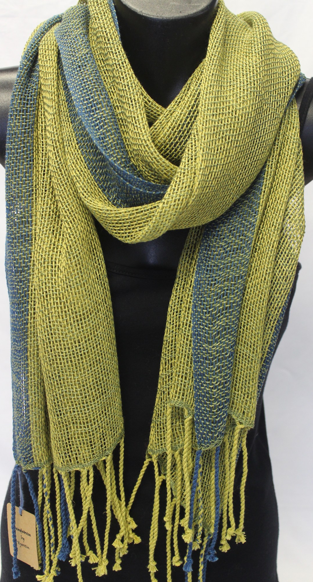 Shawl made from blue and green cotton/linen warp and green silk weft. Plain, open weave.