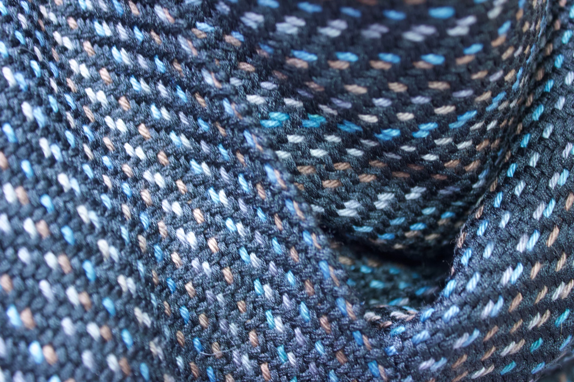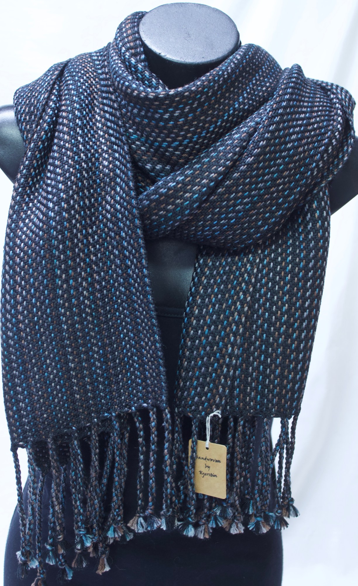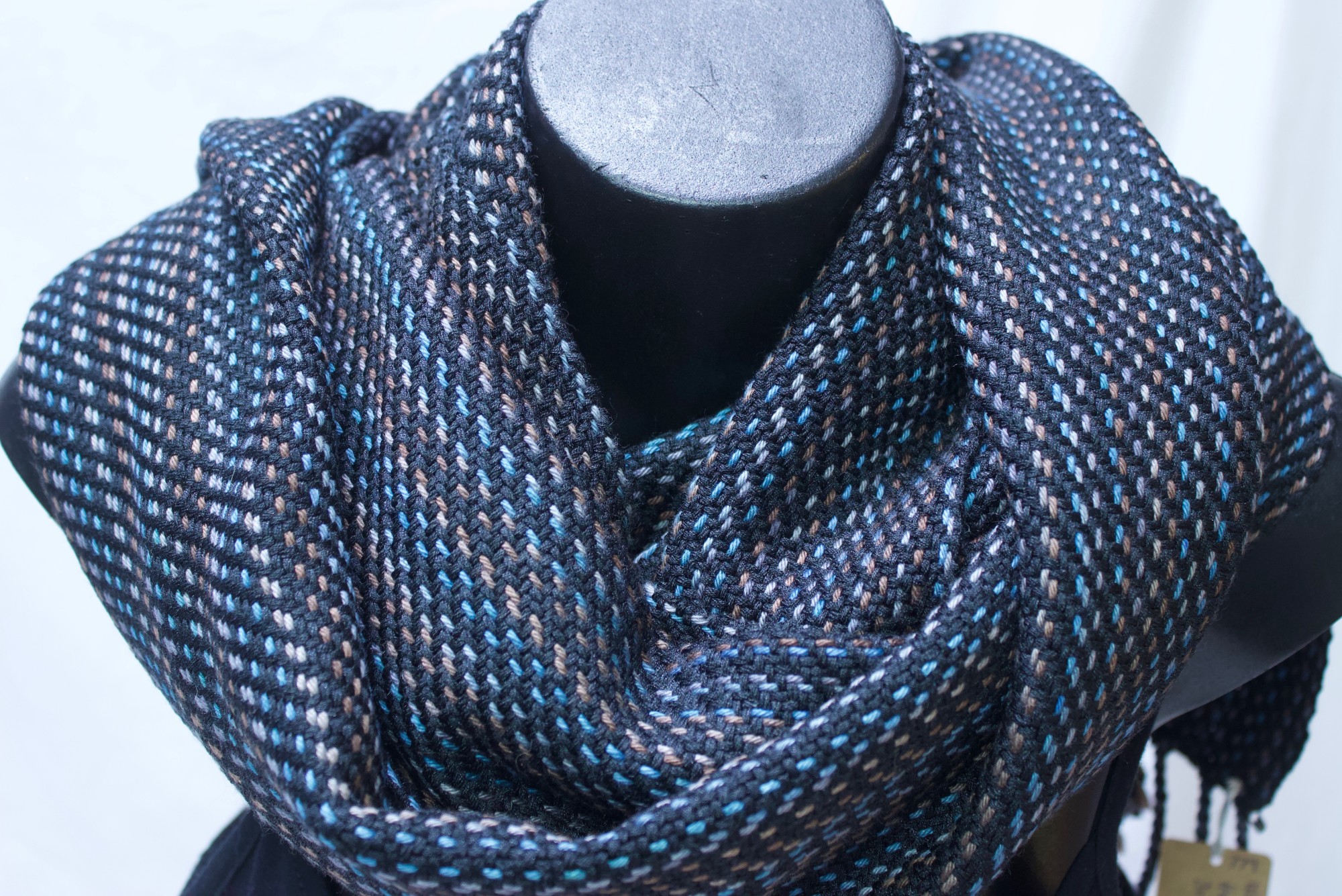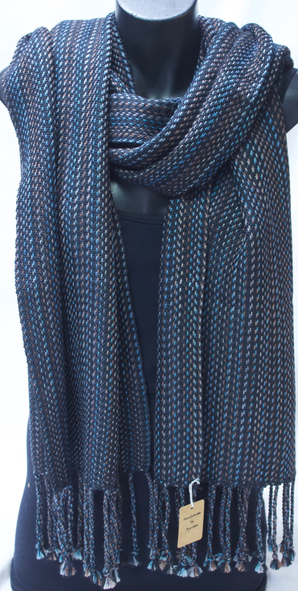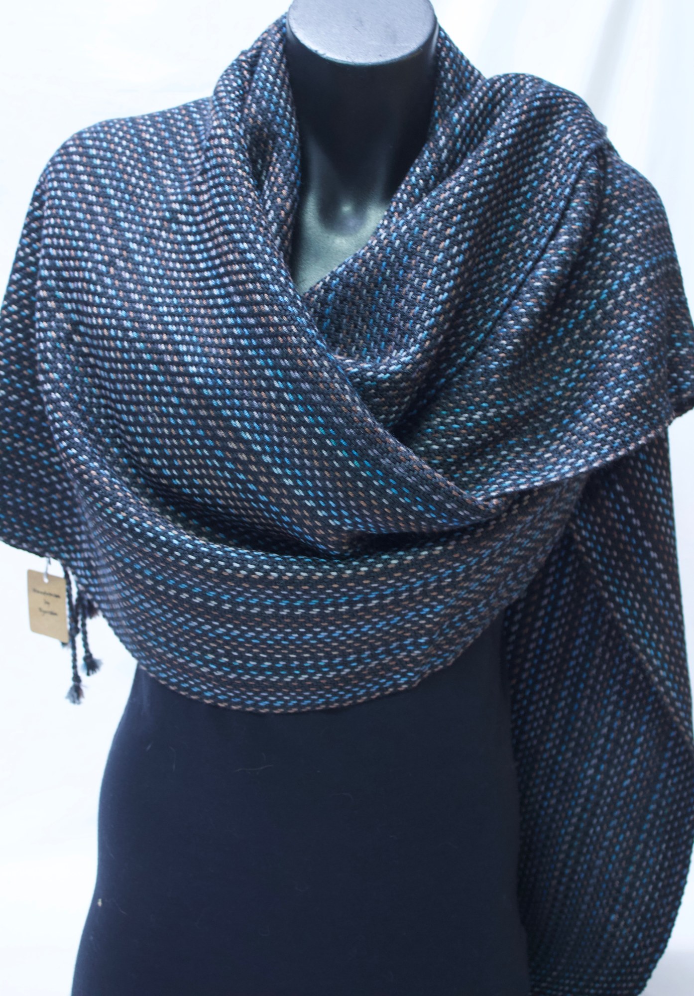 Shawl made from black, blue, grey and brown wool/silk.