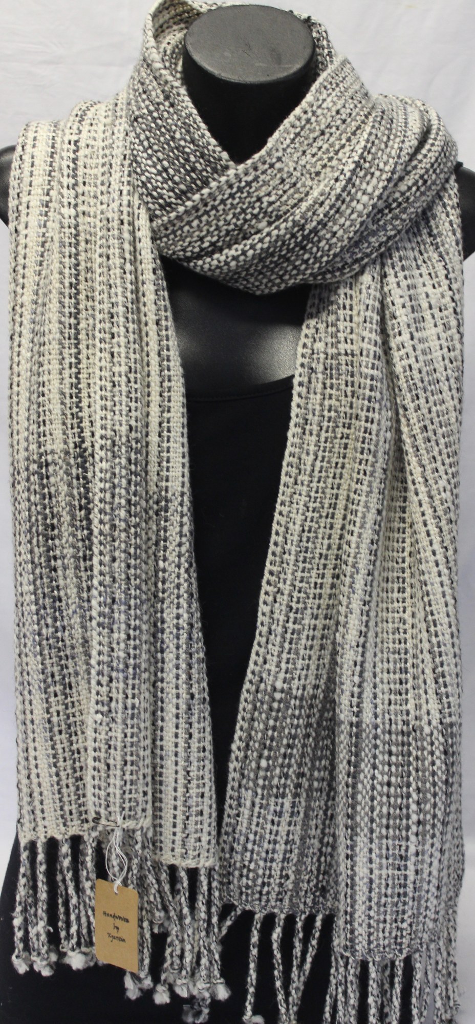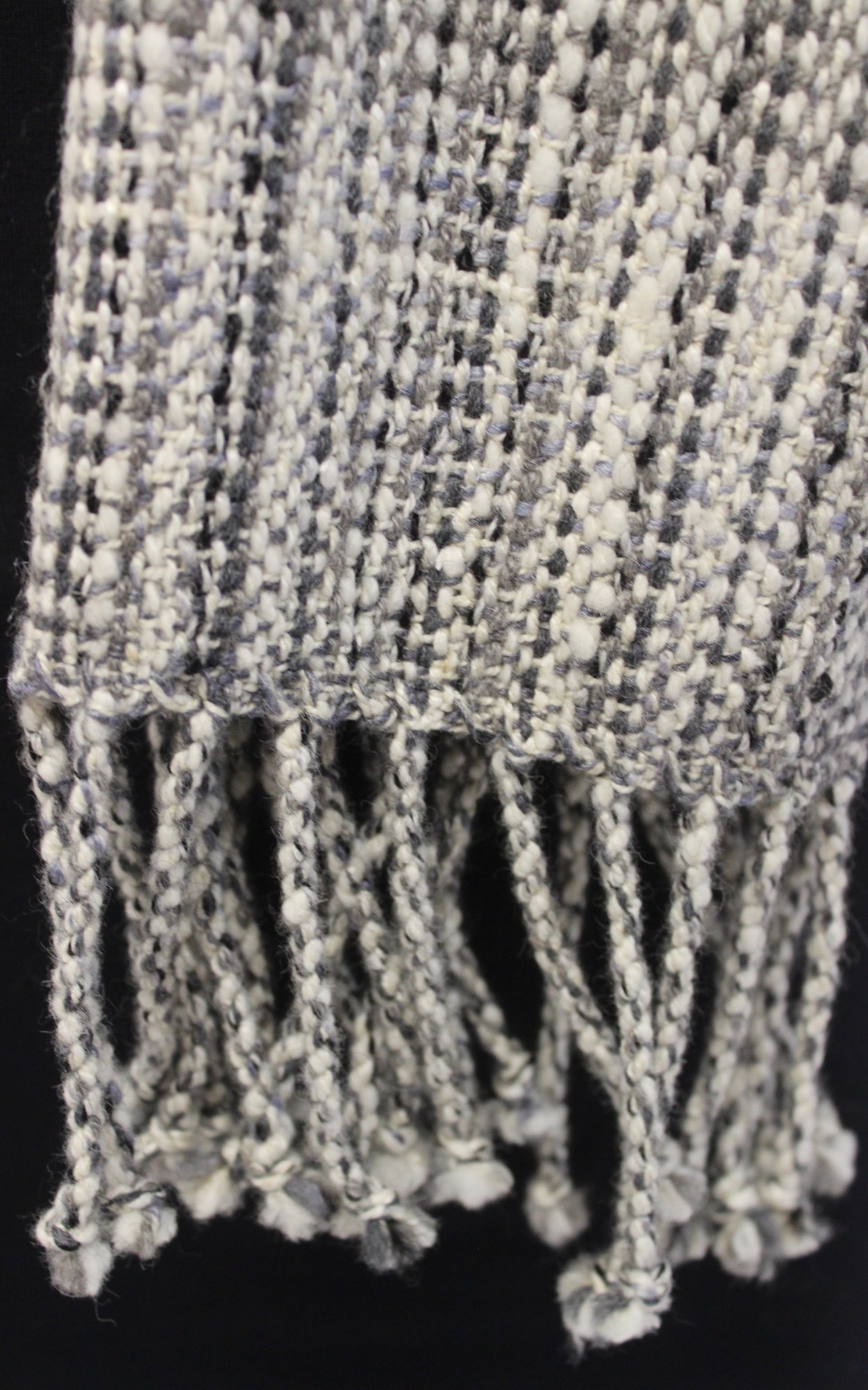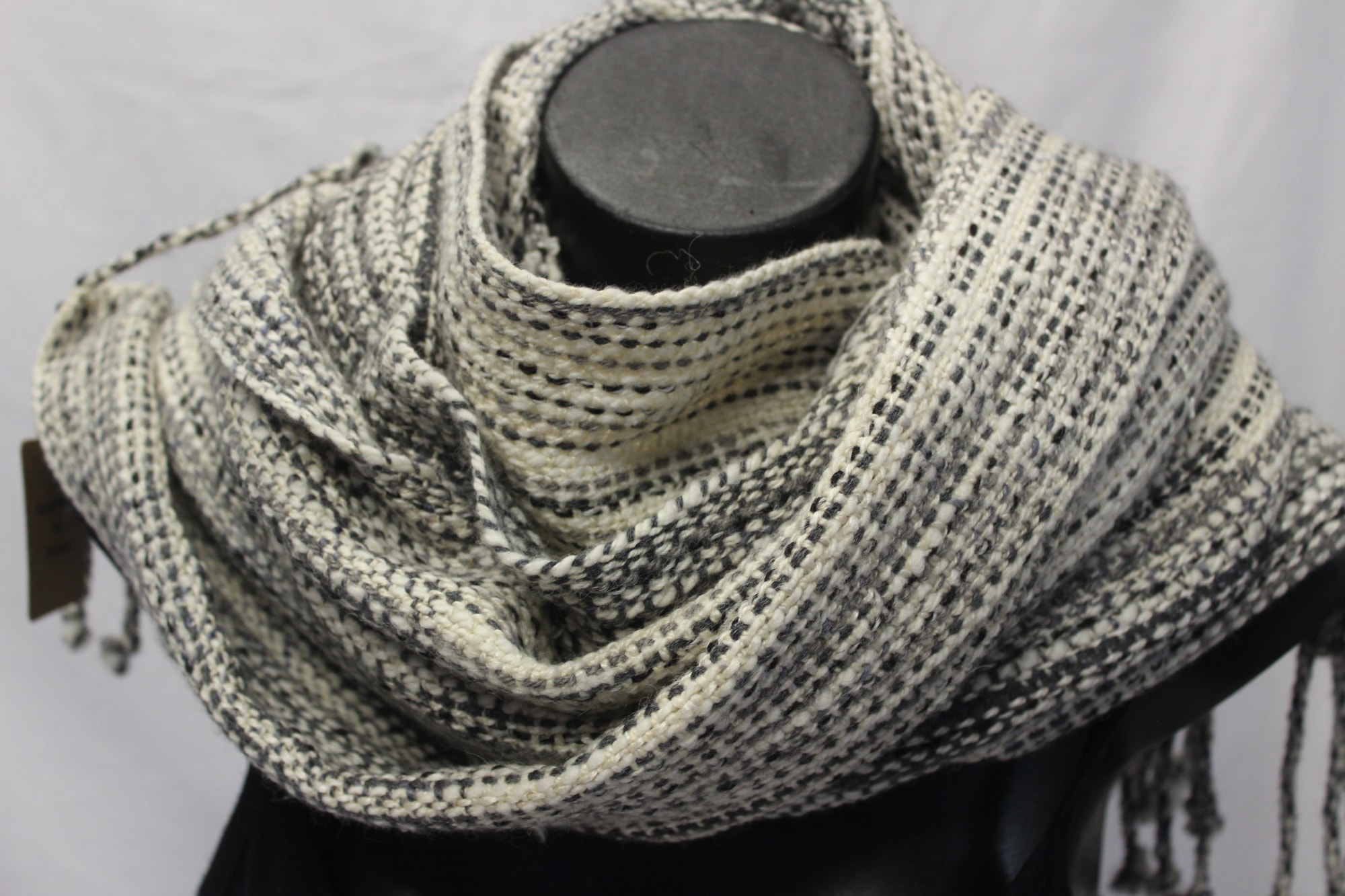 Shawl made from white, grey and black wool, silk and alpaca, some hand spun.