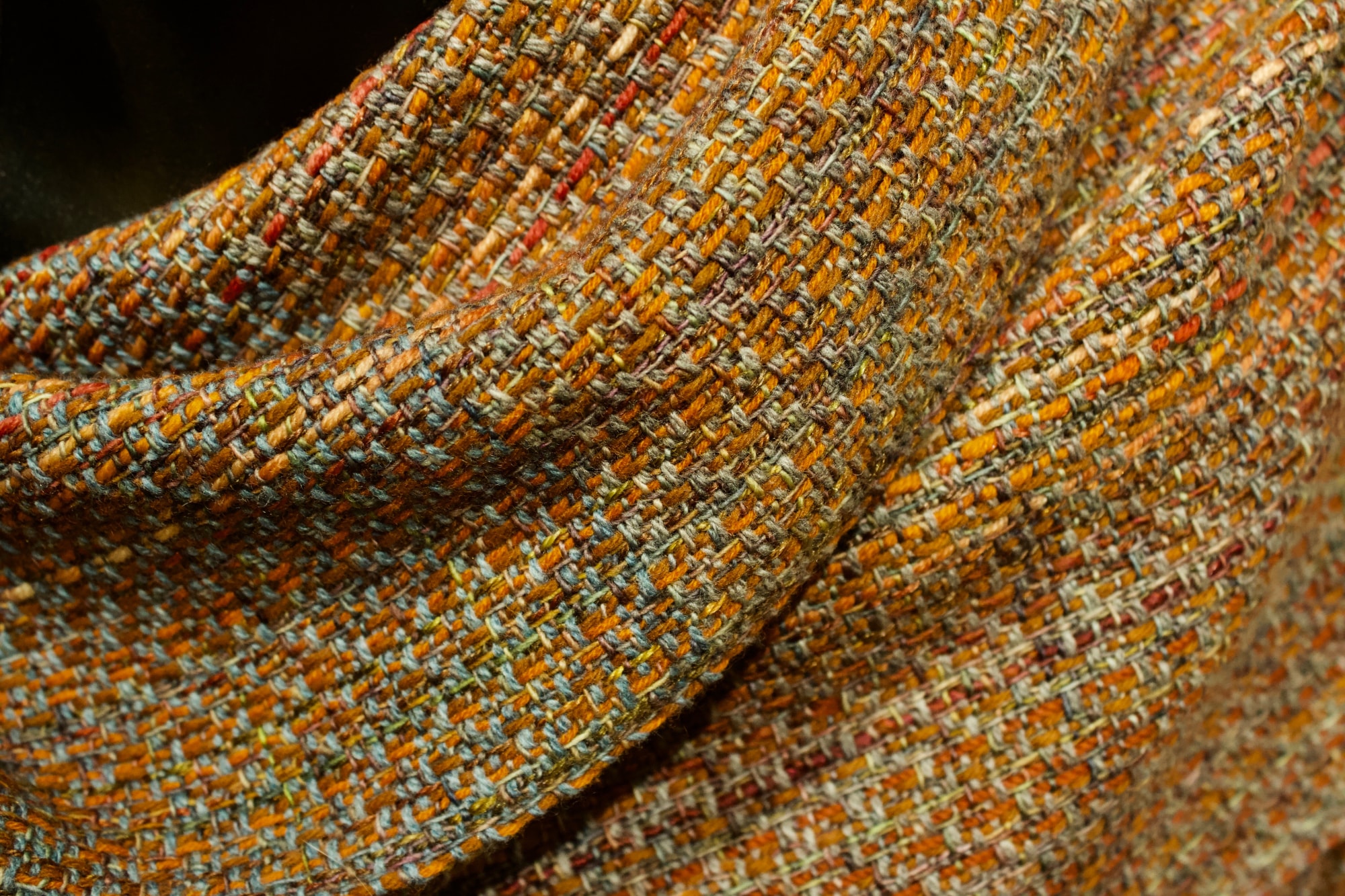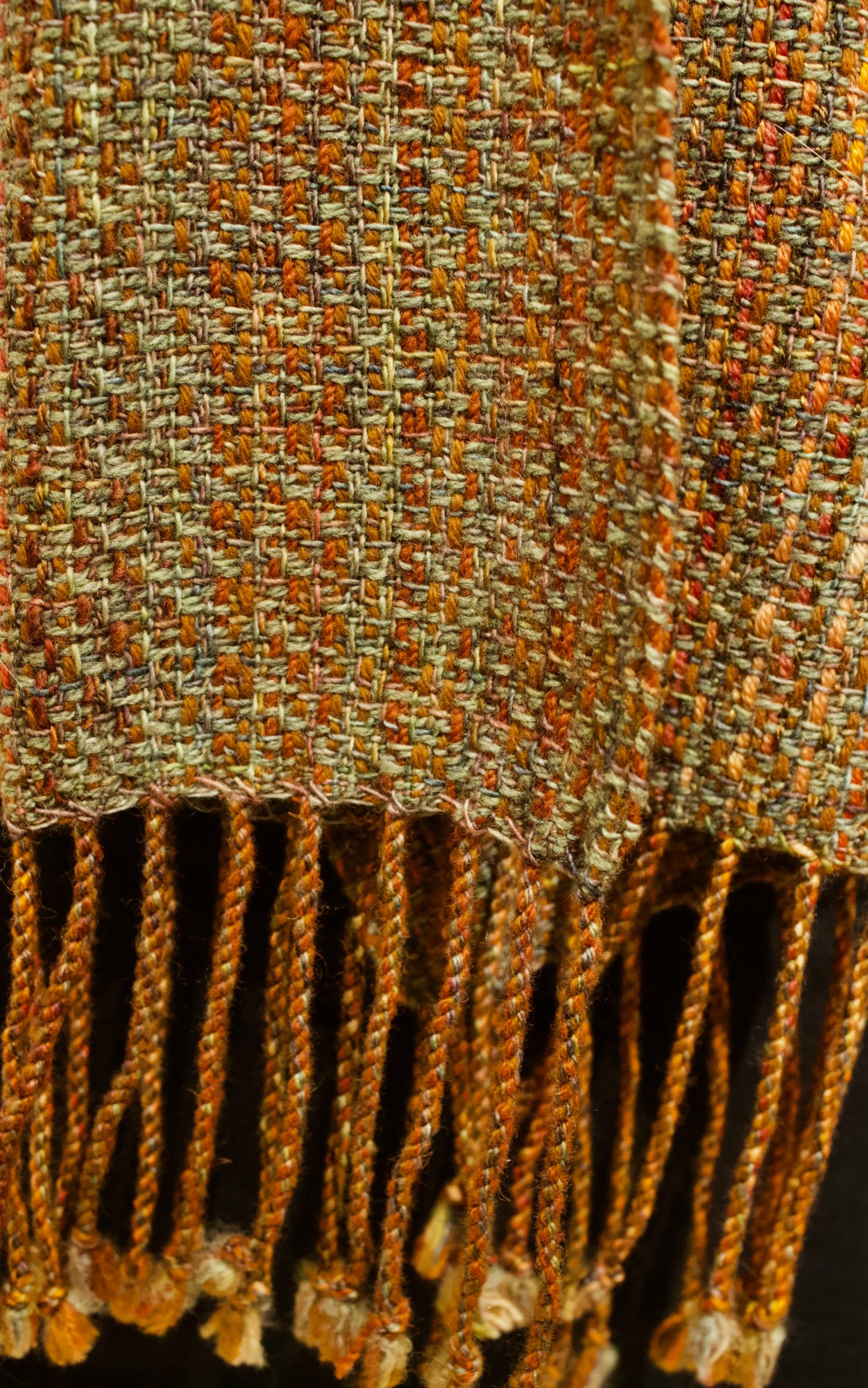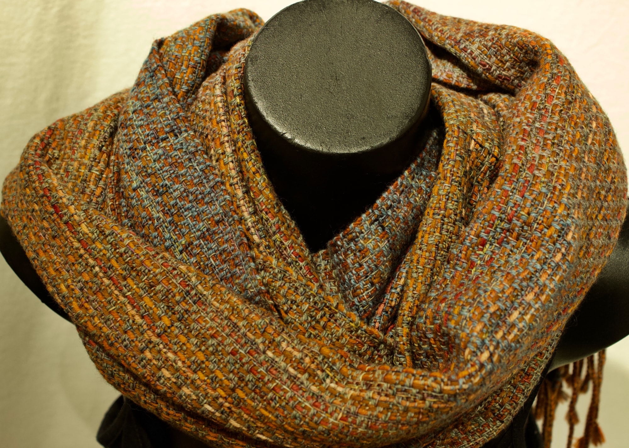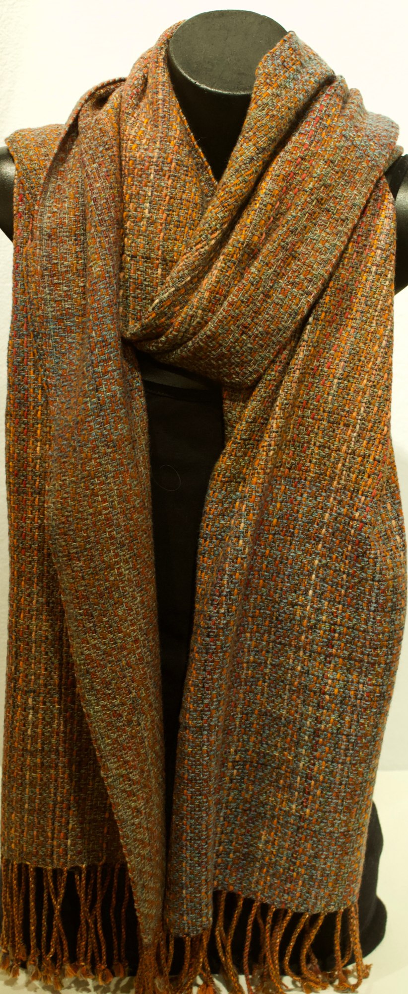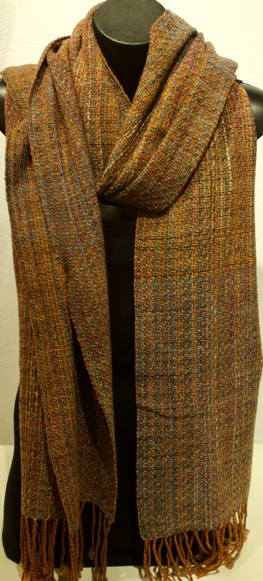 Shawl made from rust, orange, grey/green and blue wool and silk.