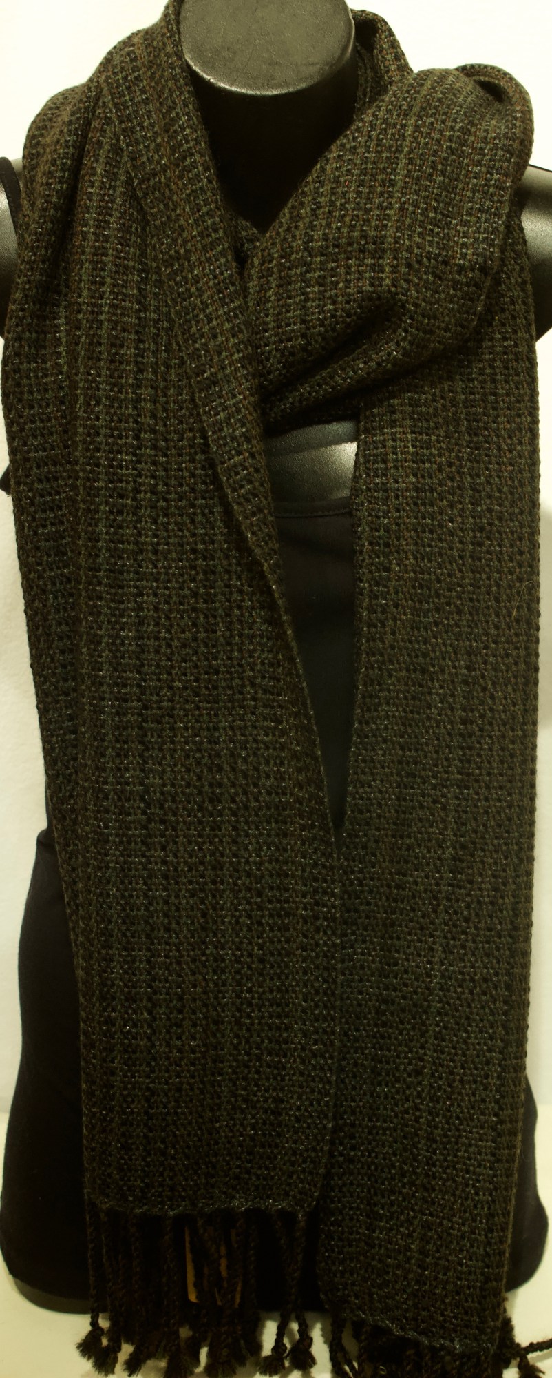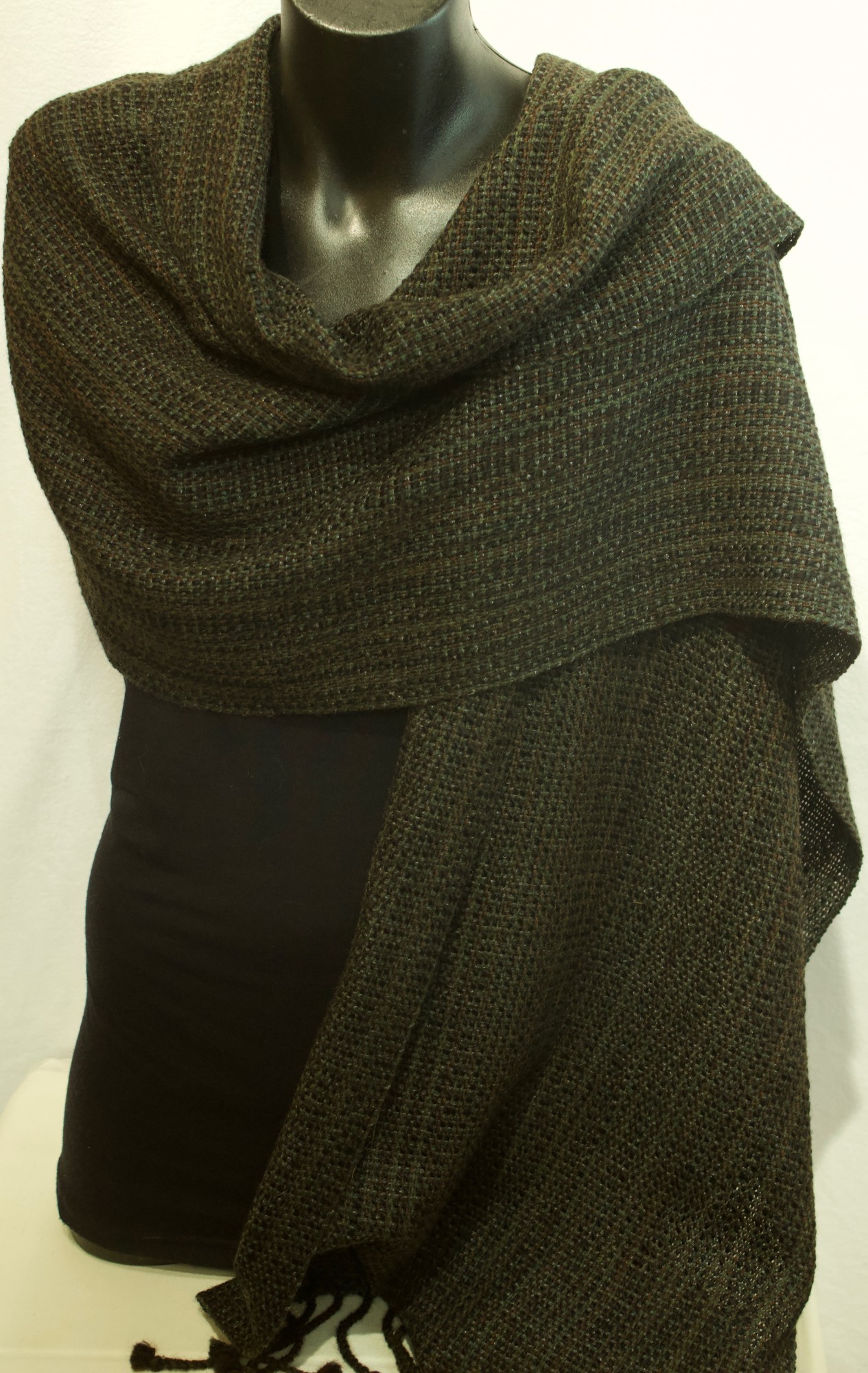 Shawl made from brown and green wool and silk with hand spun black alpaca. Plain weave.