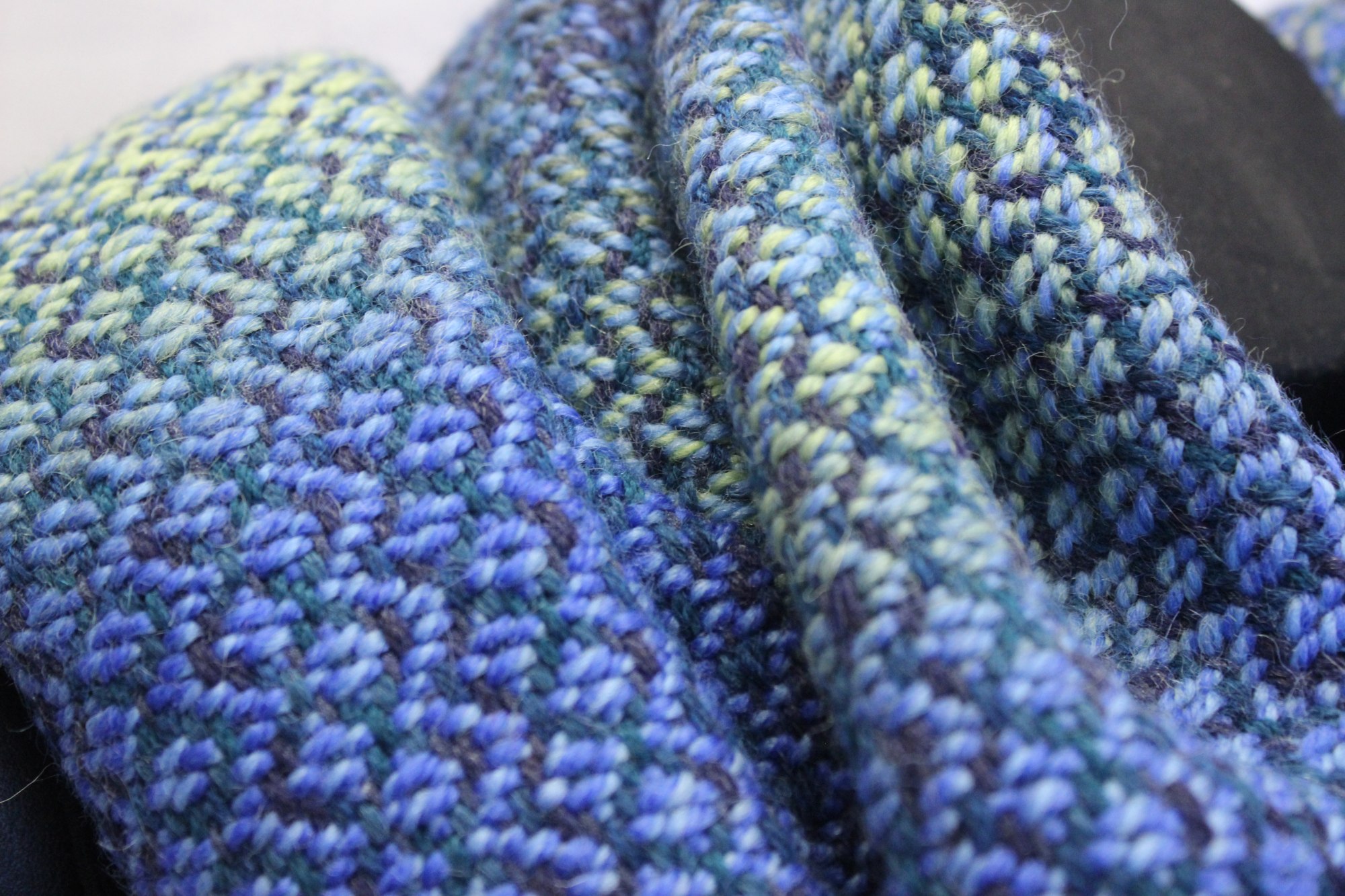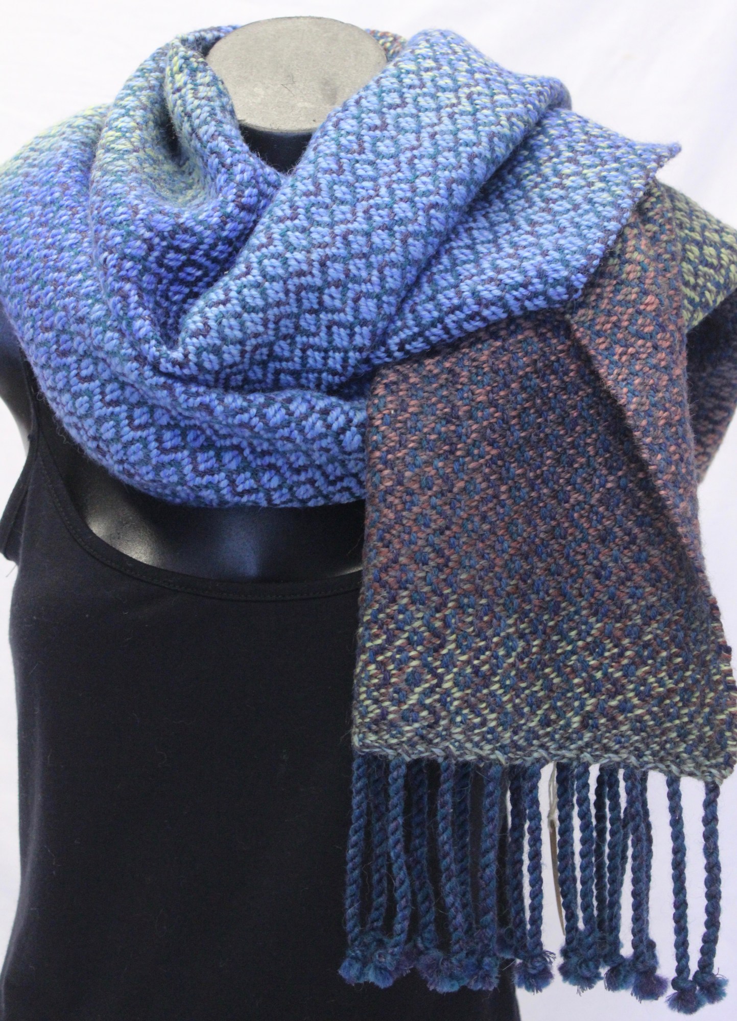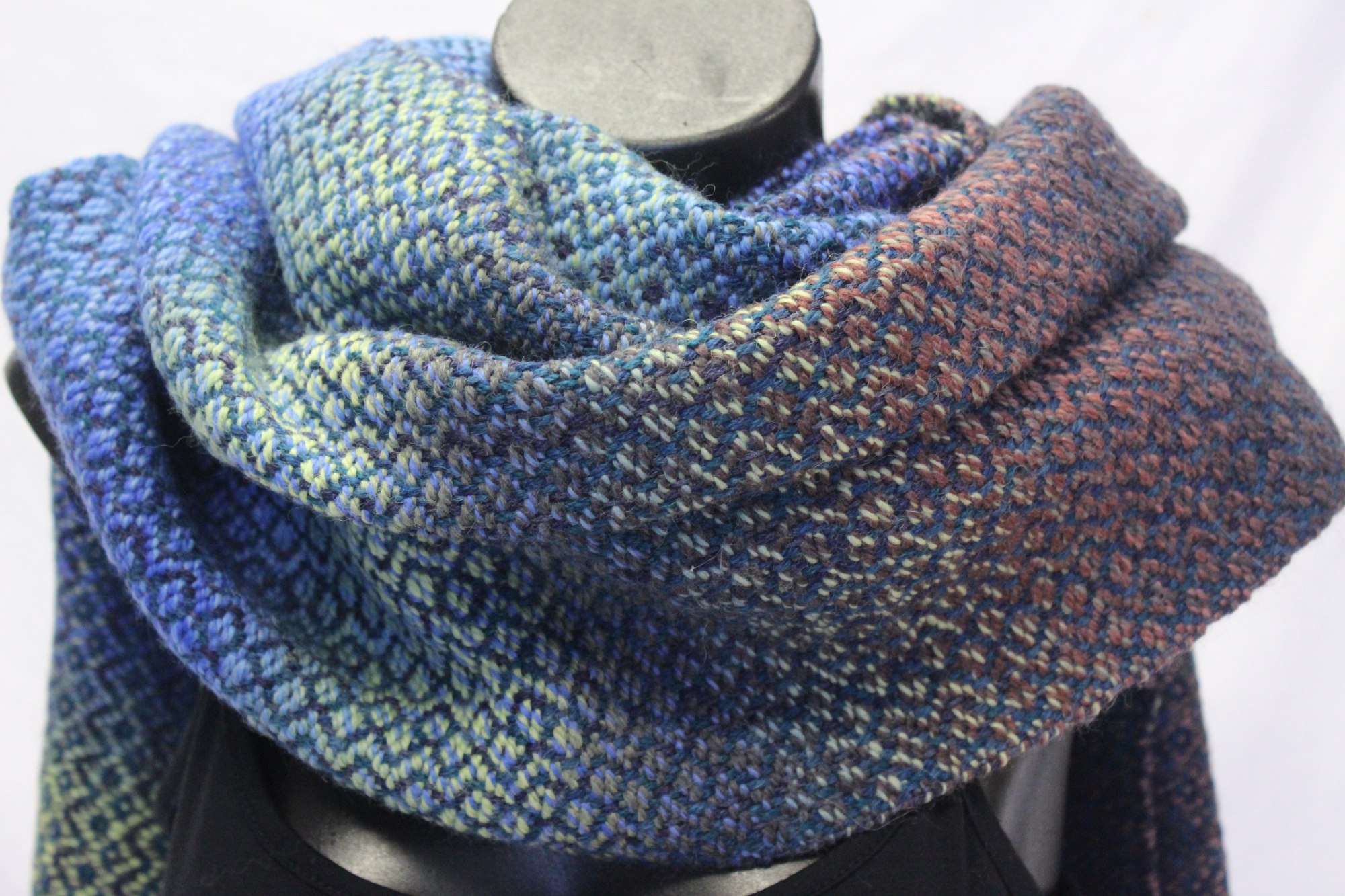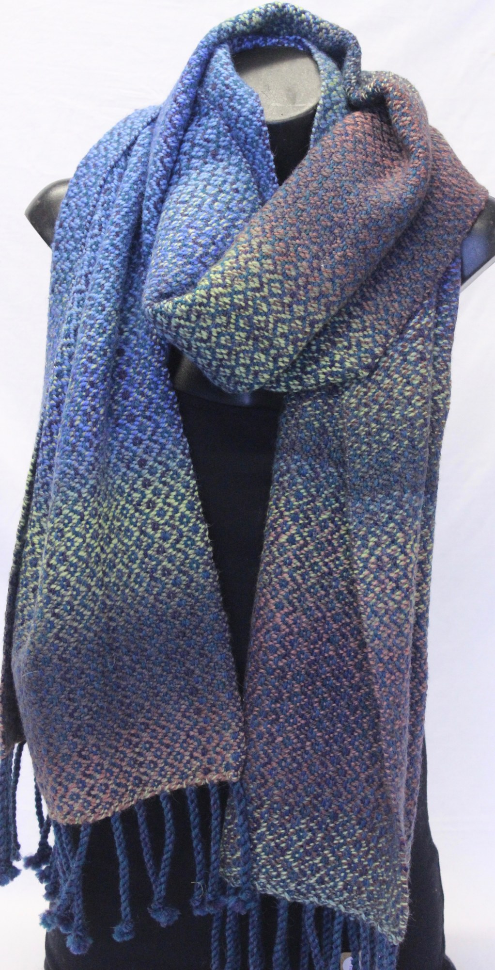 Shawl made from blue wool and silk in the warp and multicoloured wool in the weft.