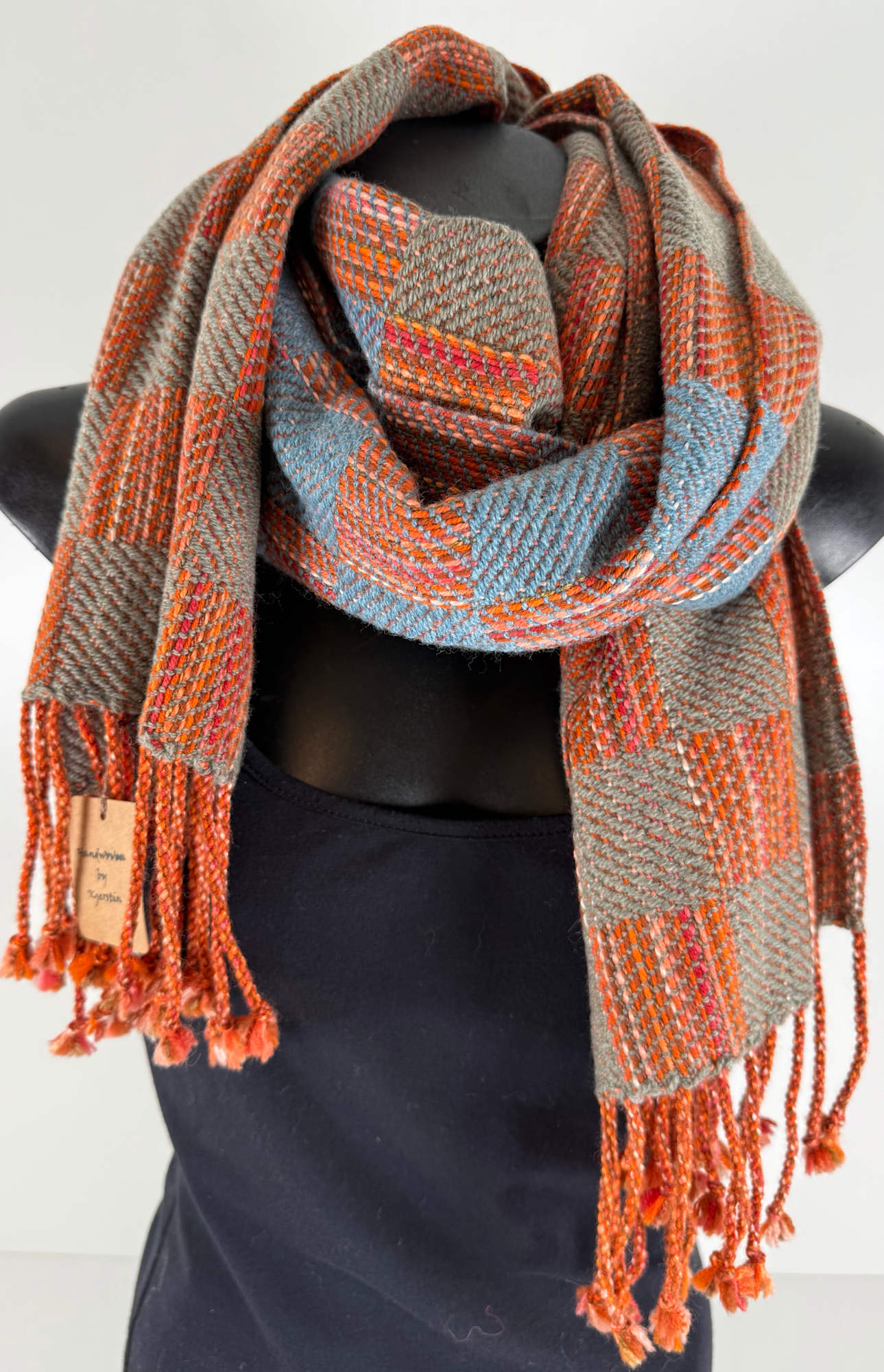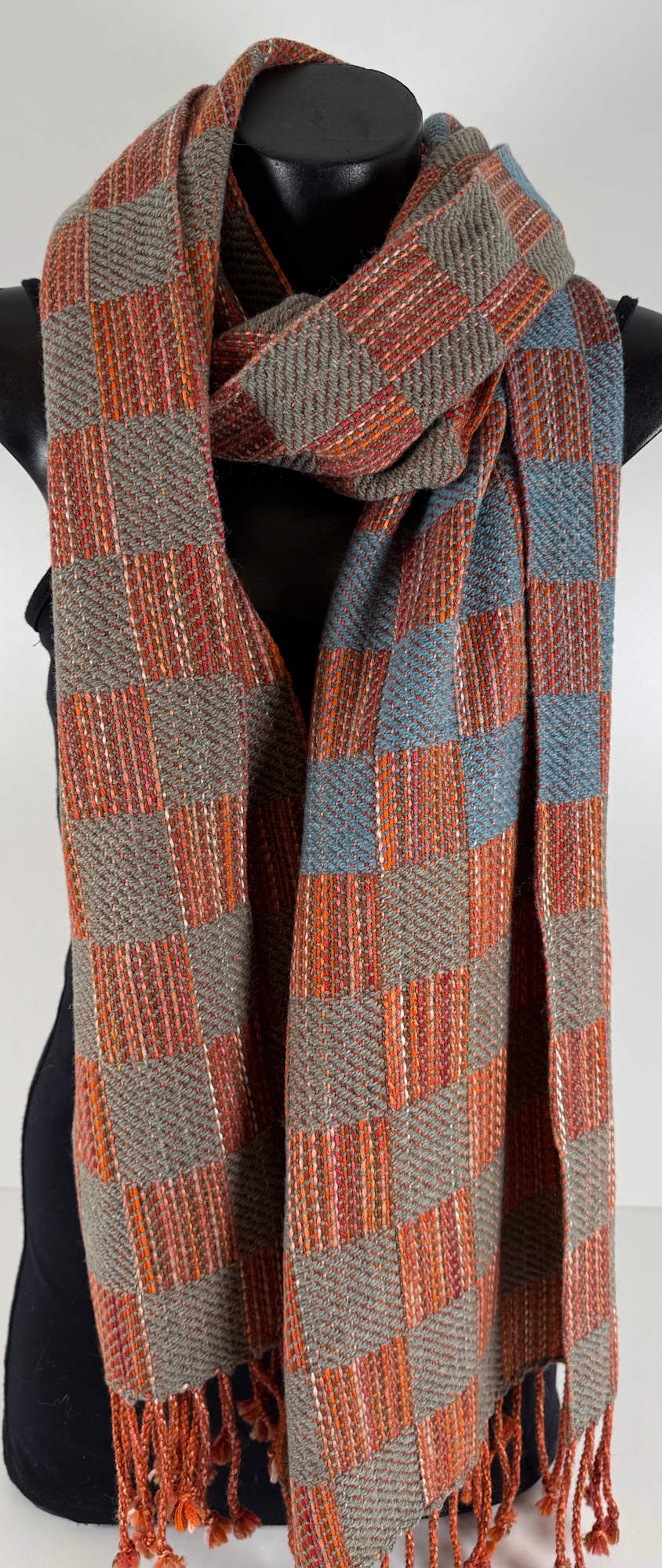 Shawl made from wool and silk in rust, orange, grey/green and blue.