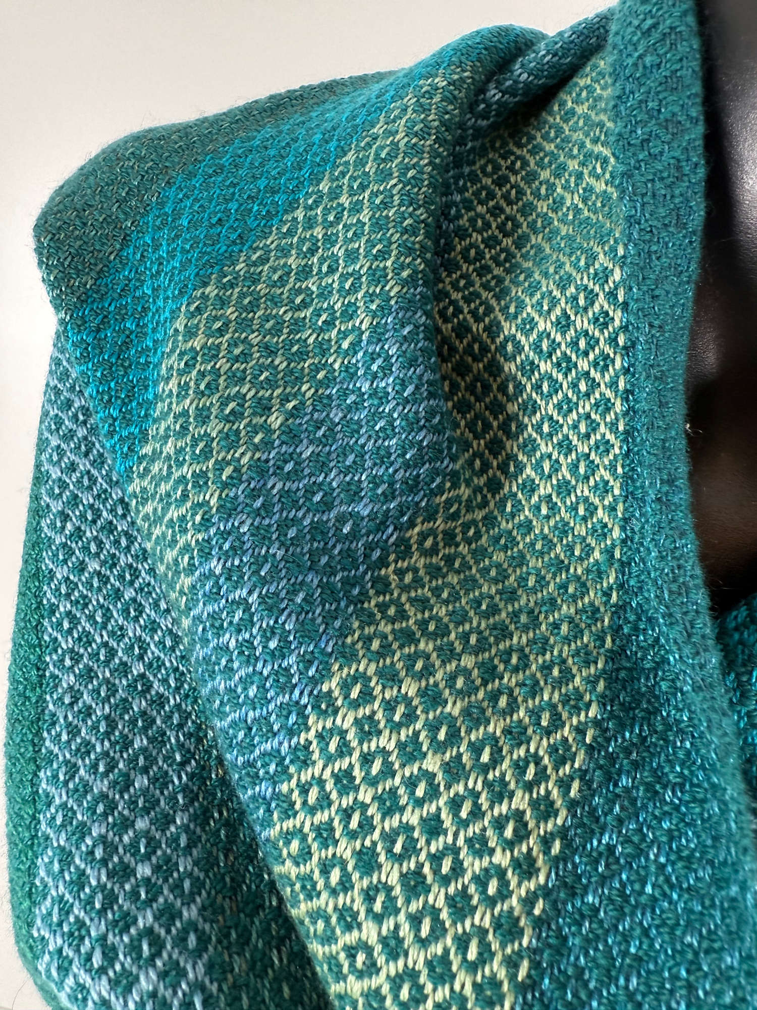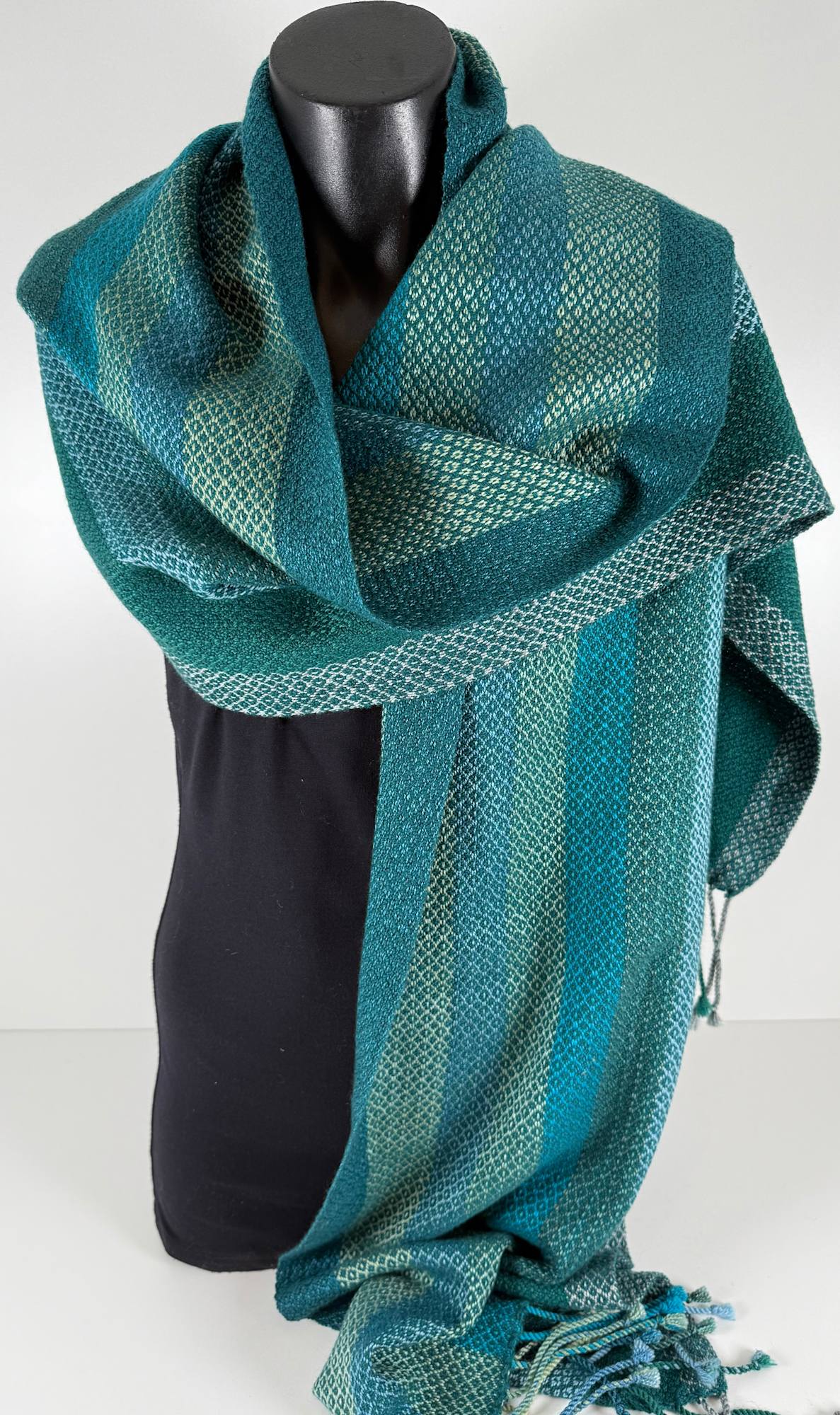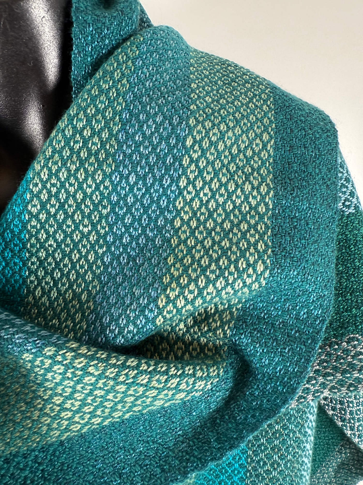 Shawl made from wool, silk and cashmere in blue, green, and grey.