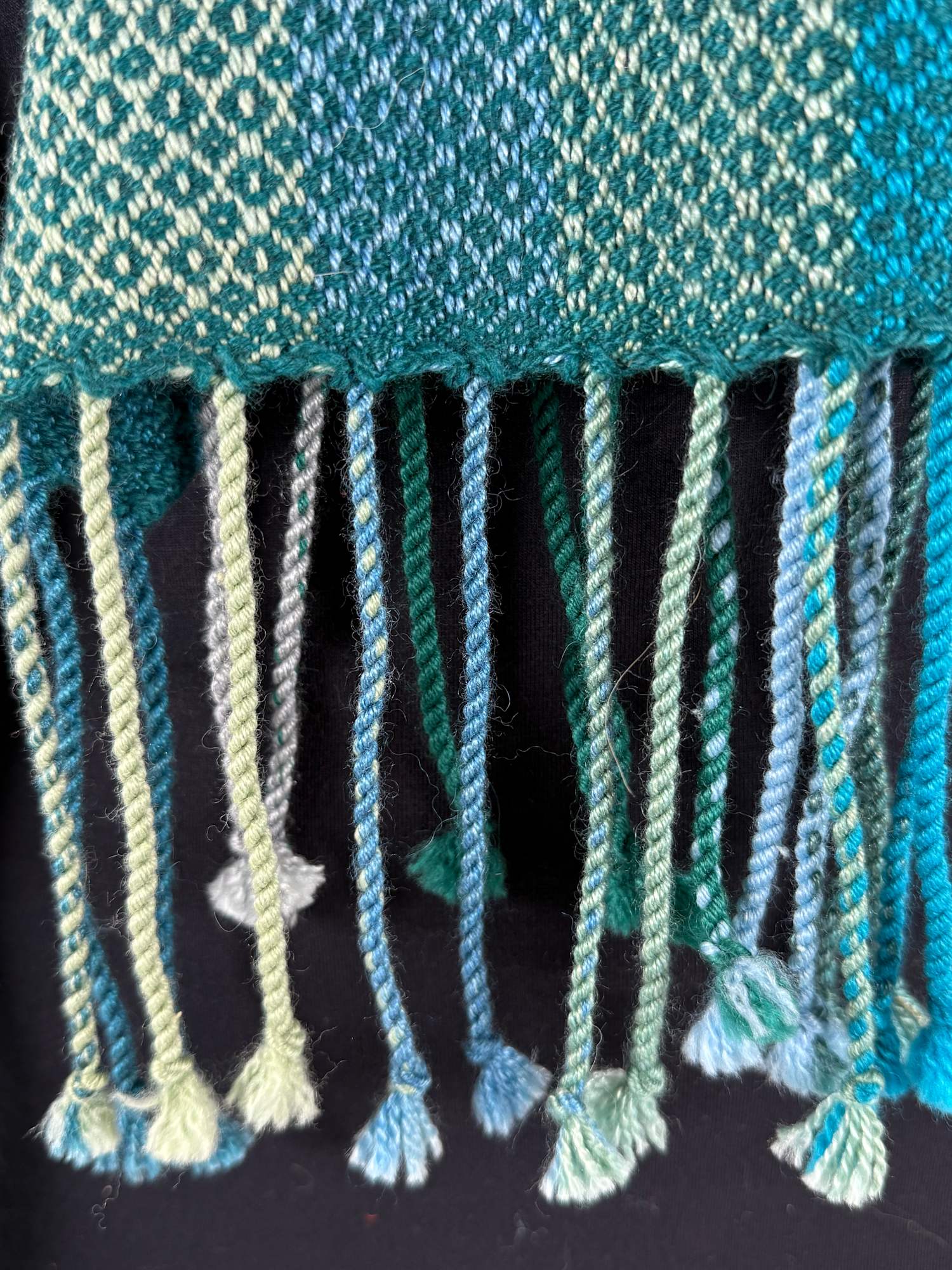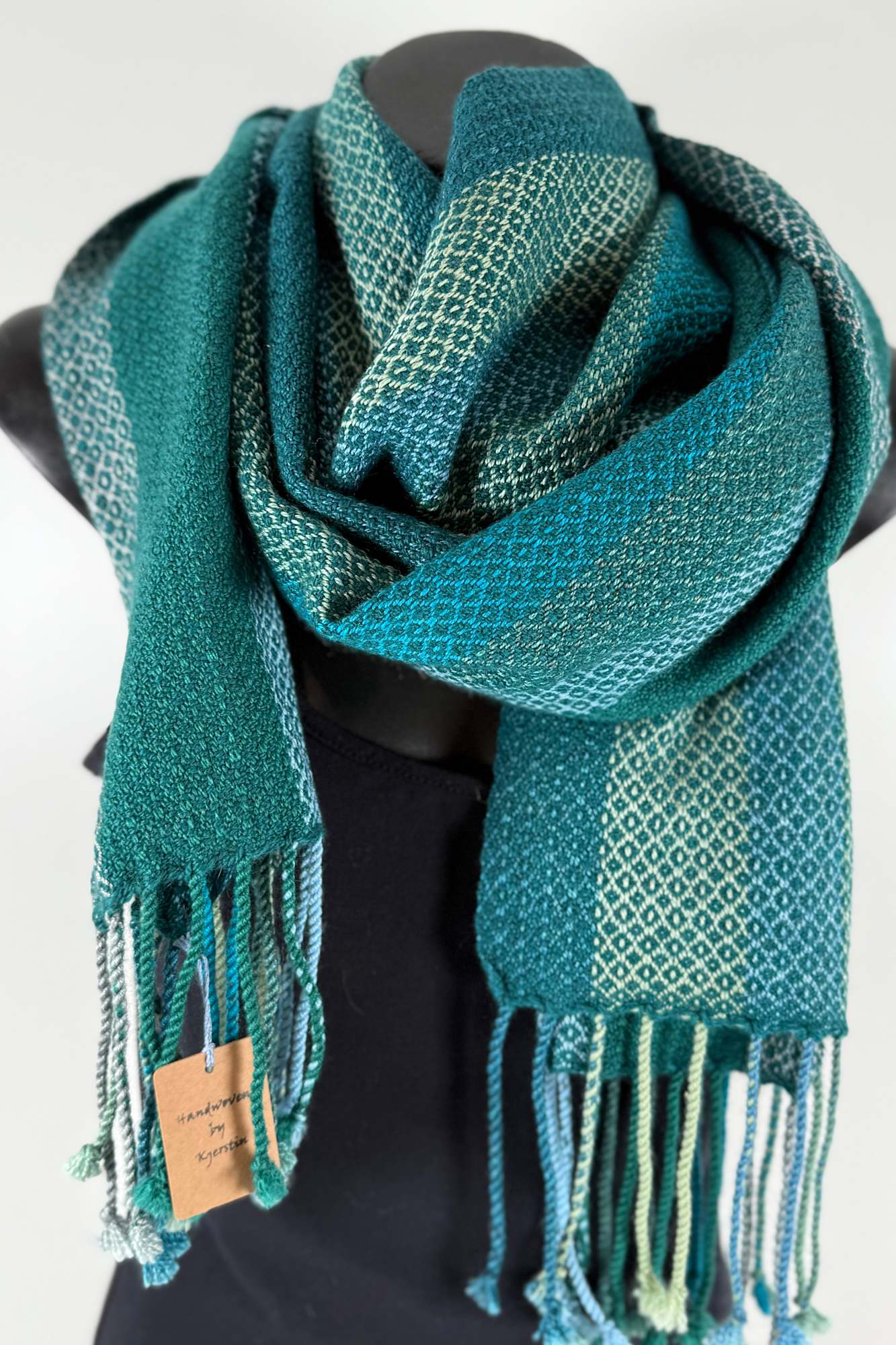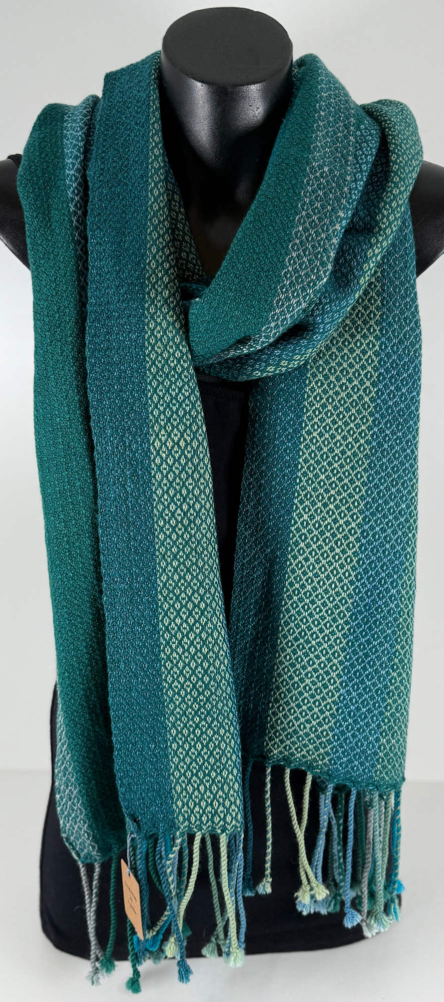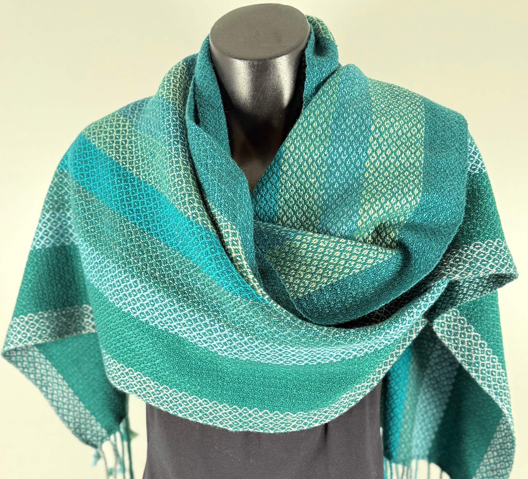 Shawl made from wool, silk and cashmere in blue, green, and grey.
