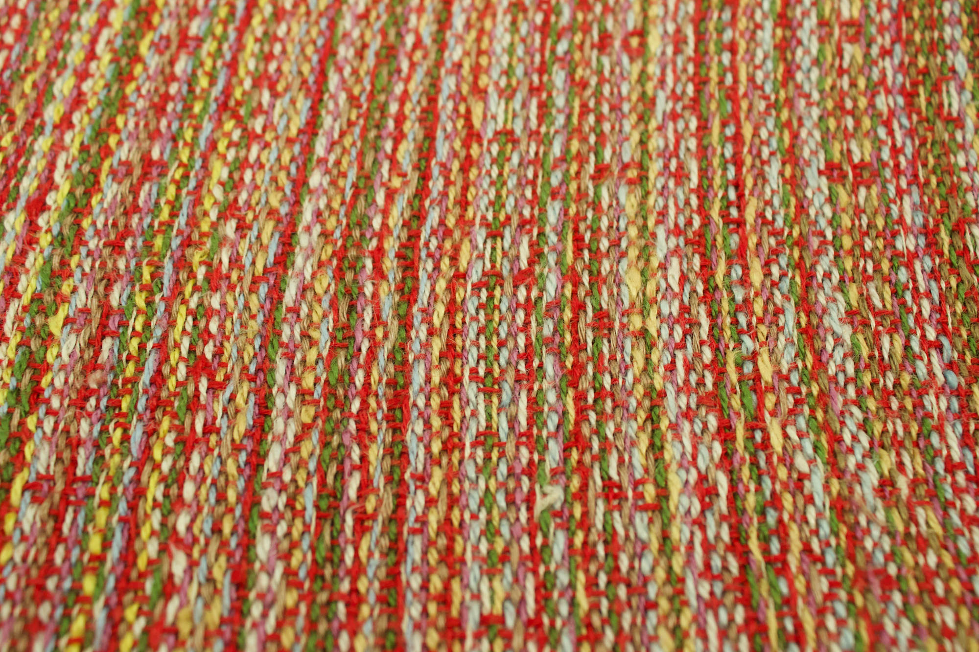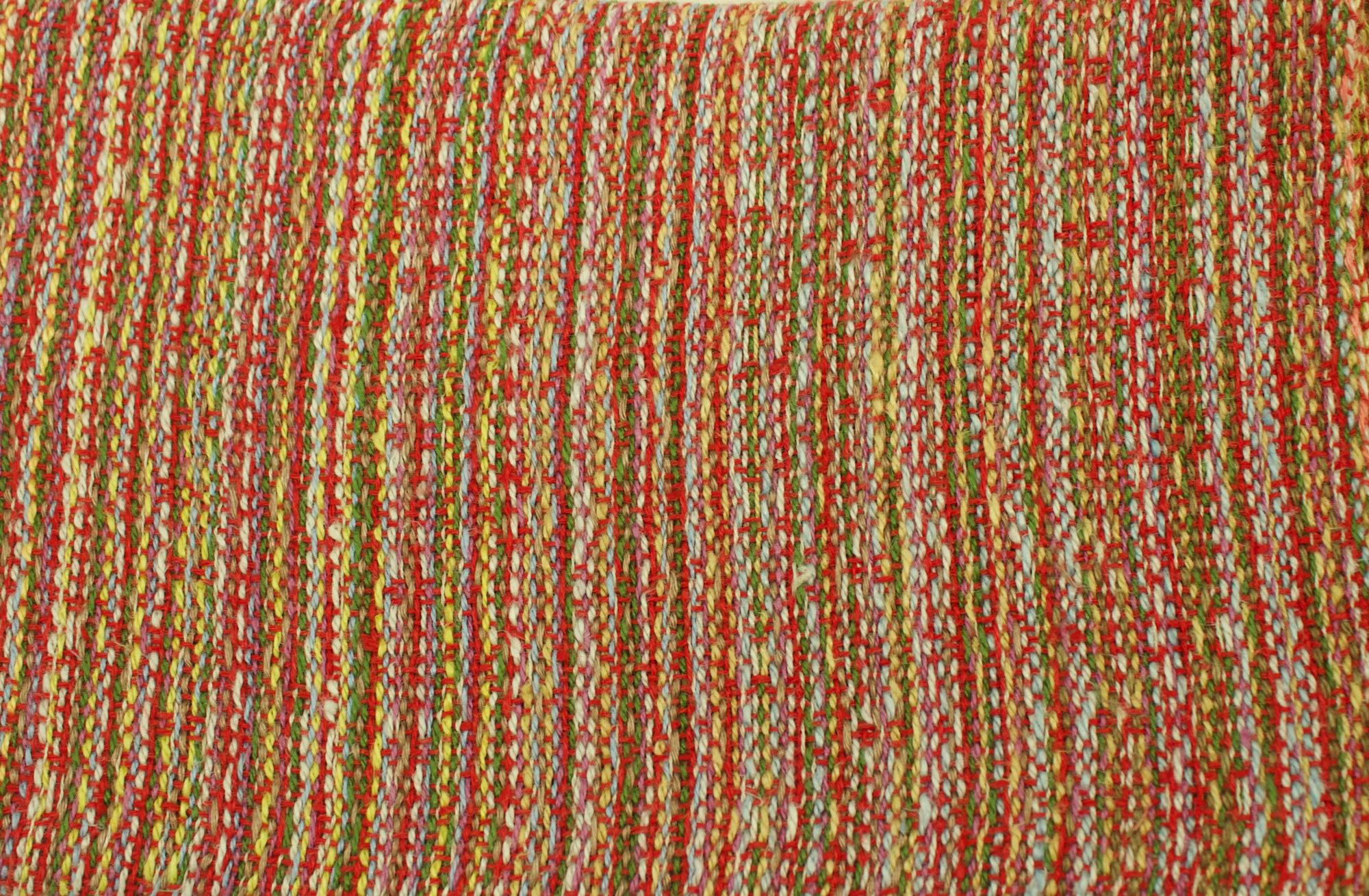 Tea towel made from multicoloured linen warp and red linen weft. M and W twill pattern.