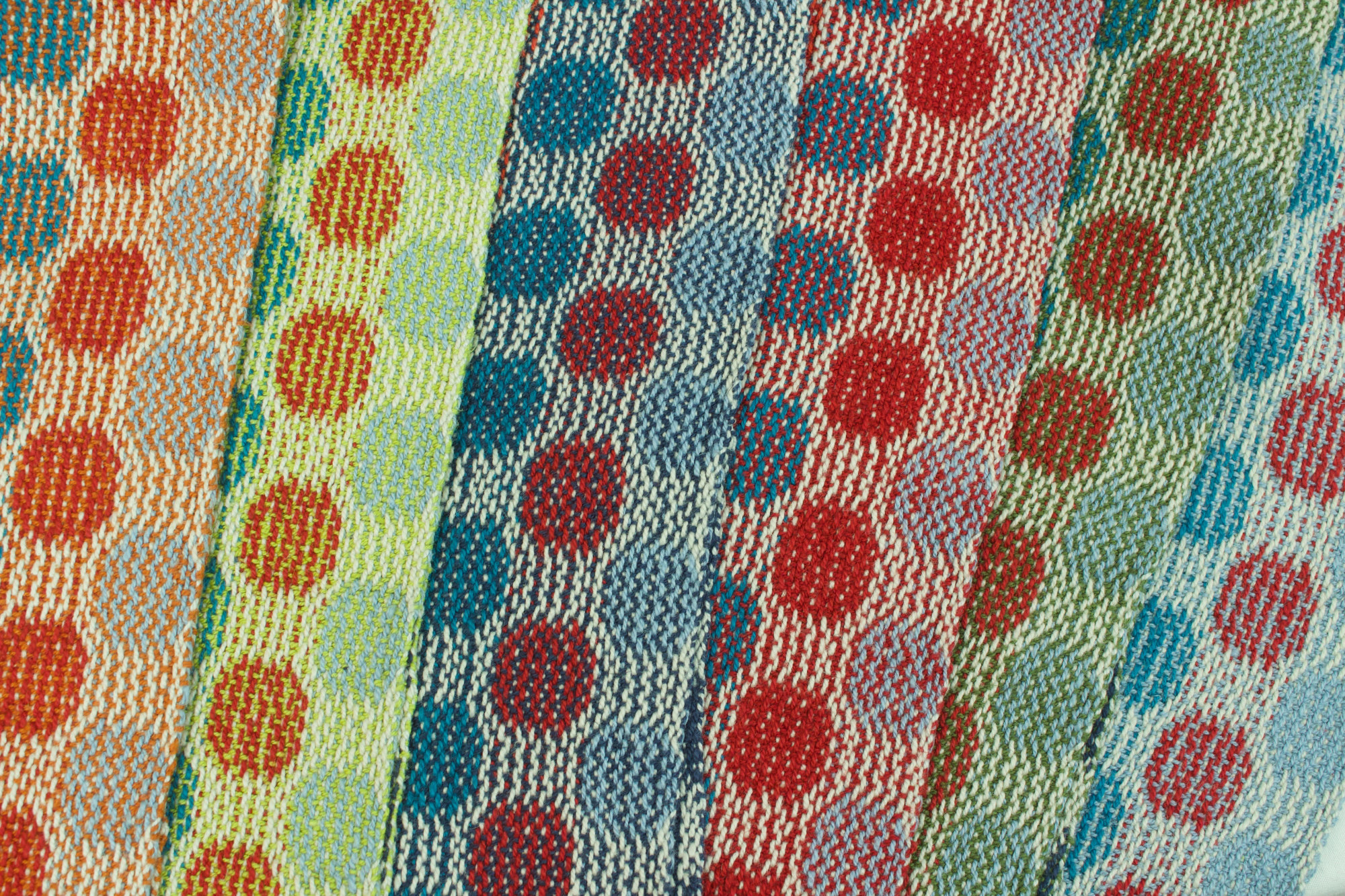 Tea towel made from blue, grey, red, rust and green cottolin. Turned taquete pattern.