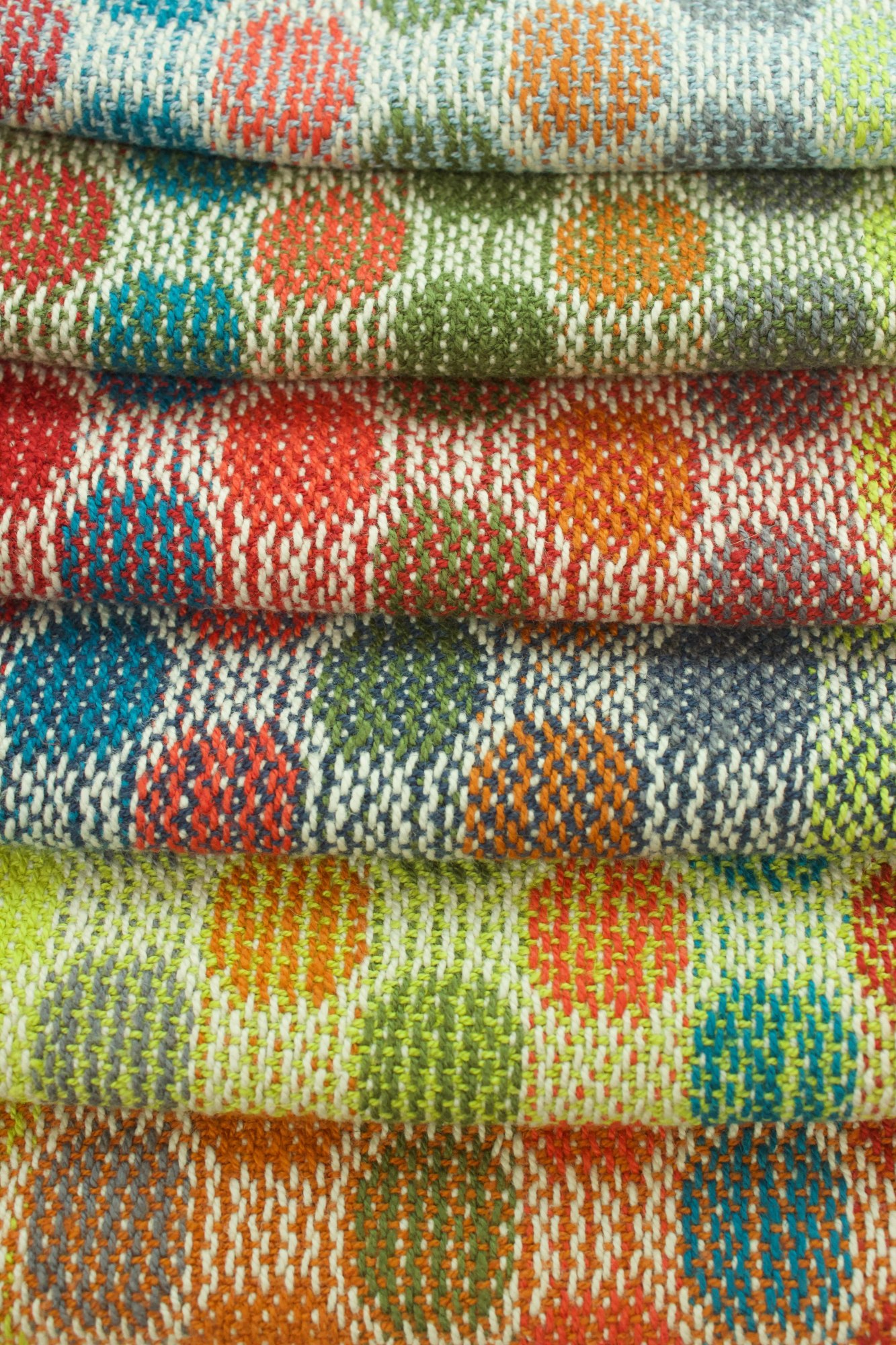 Tea towel made from blue, grey, red, rust and green cottolin.
