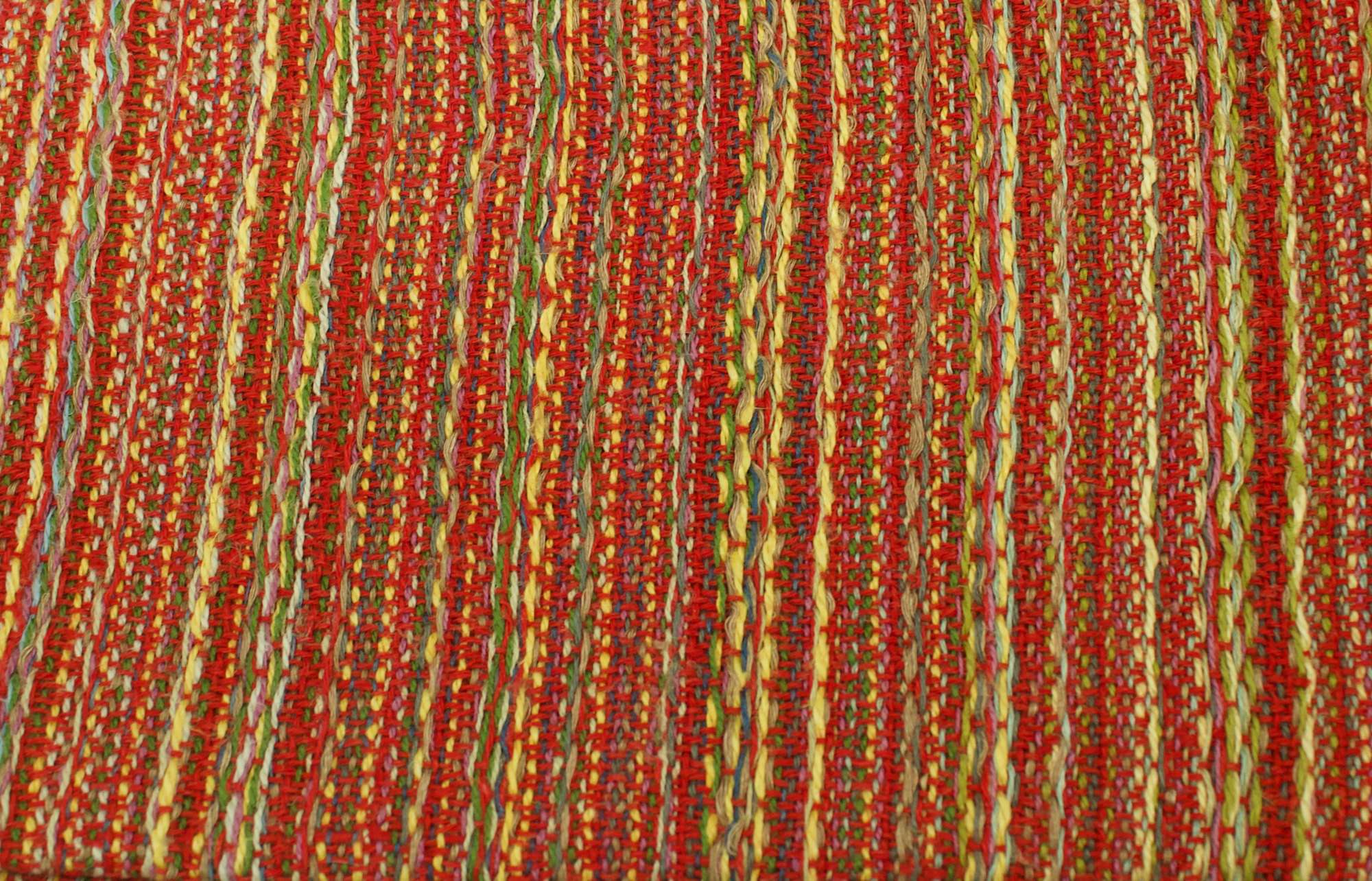 Tea towel made from multicoloured linen warp and red linen weft. M and W twill pattern.