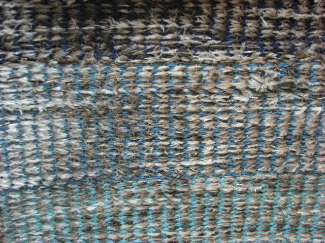 Small wall hanging made from cotton warp with wool and emu feathers weft in a krokbragd pattern.