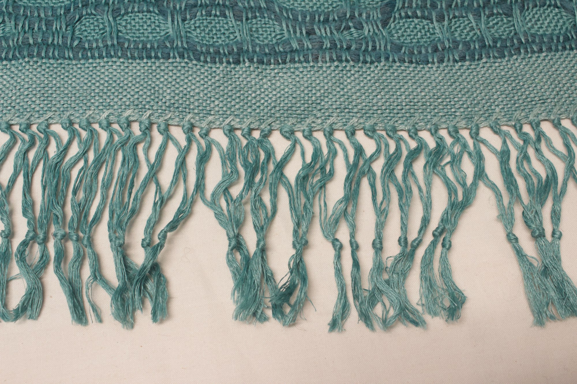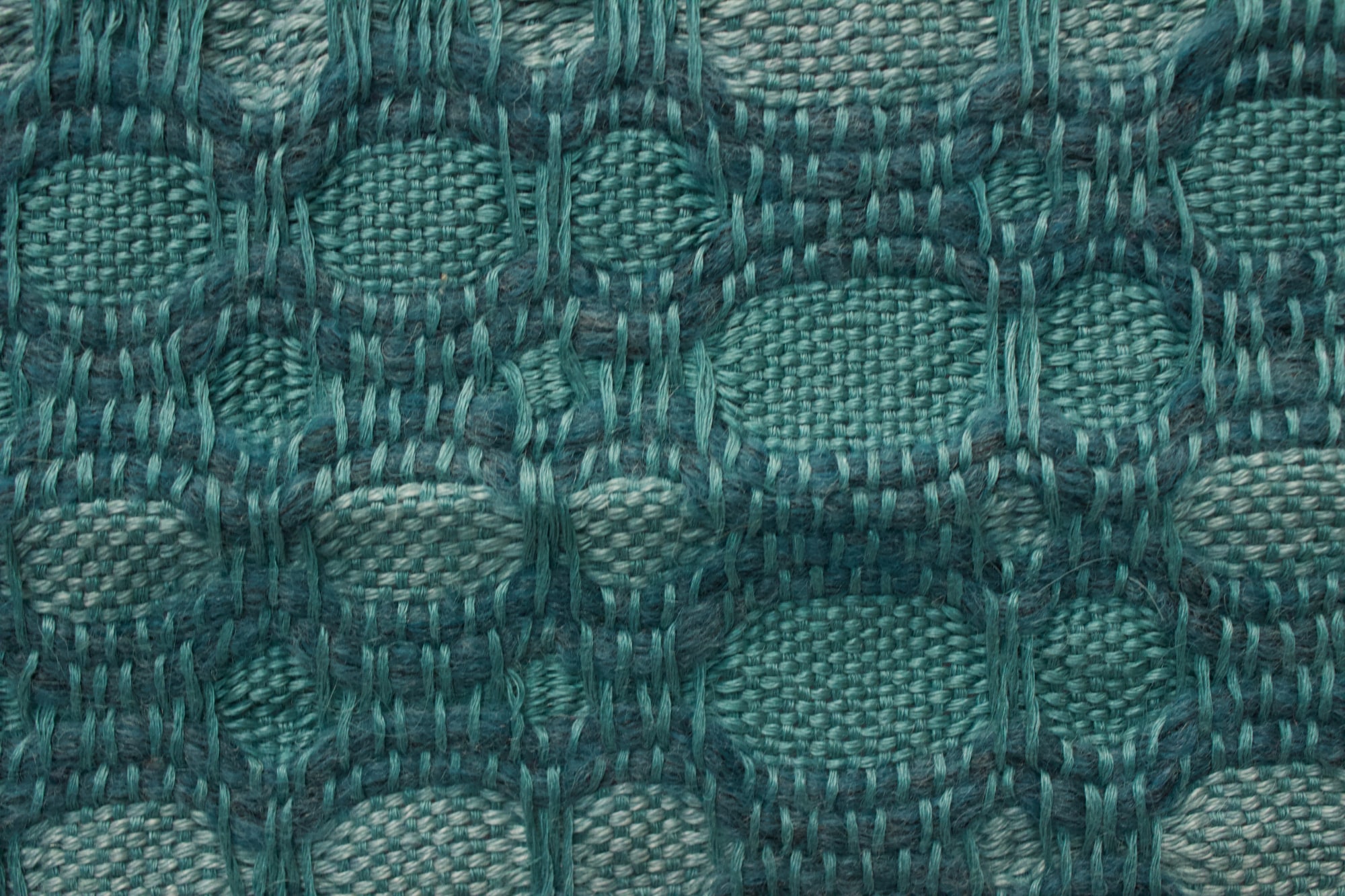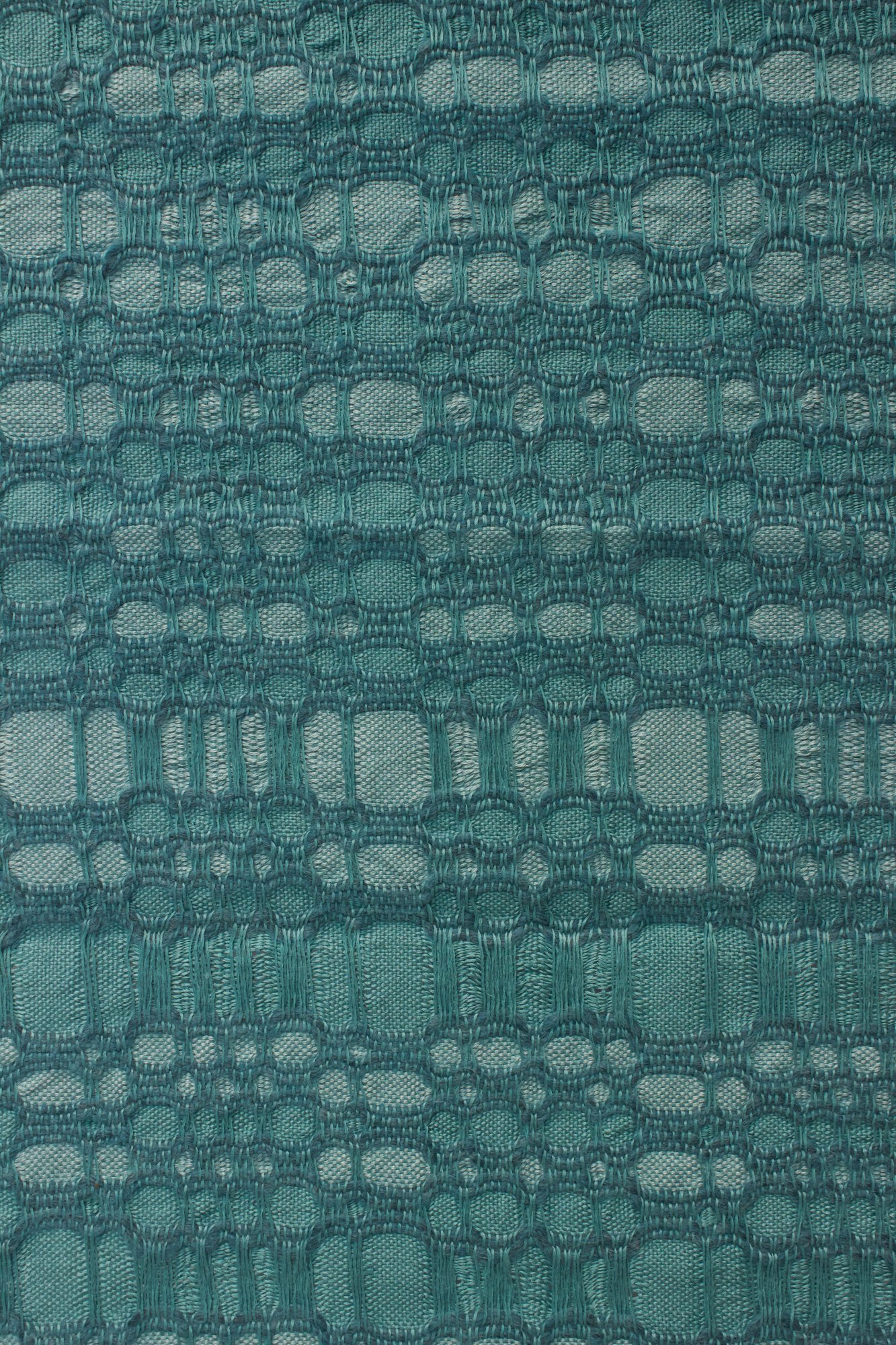 Wall hanging made from linen and rug yarn in verdigris.