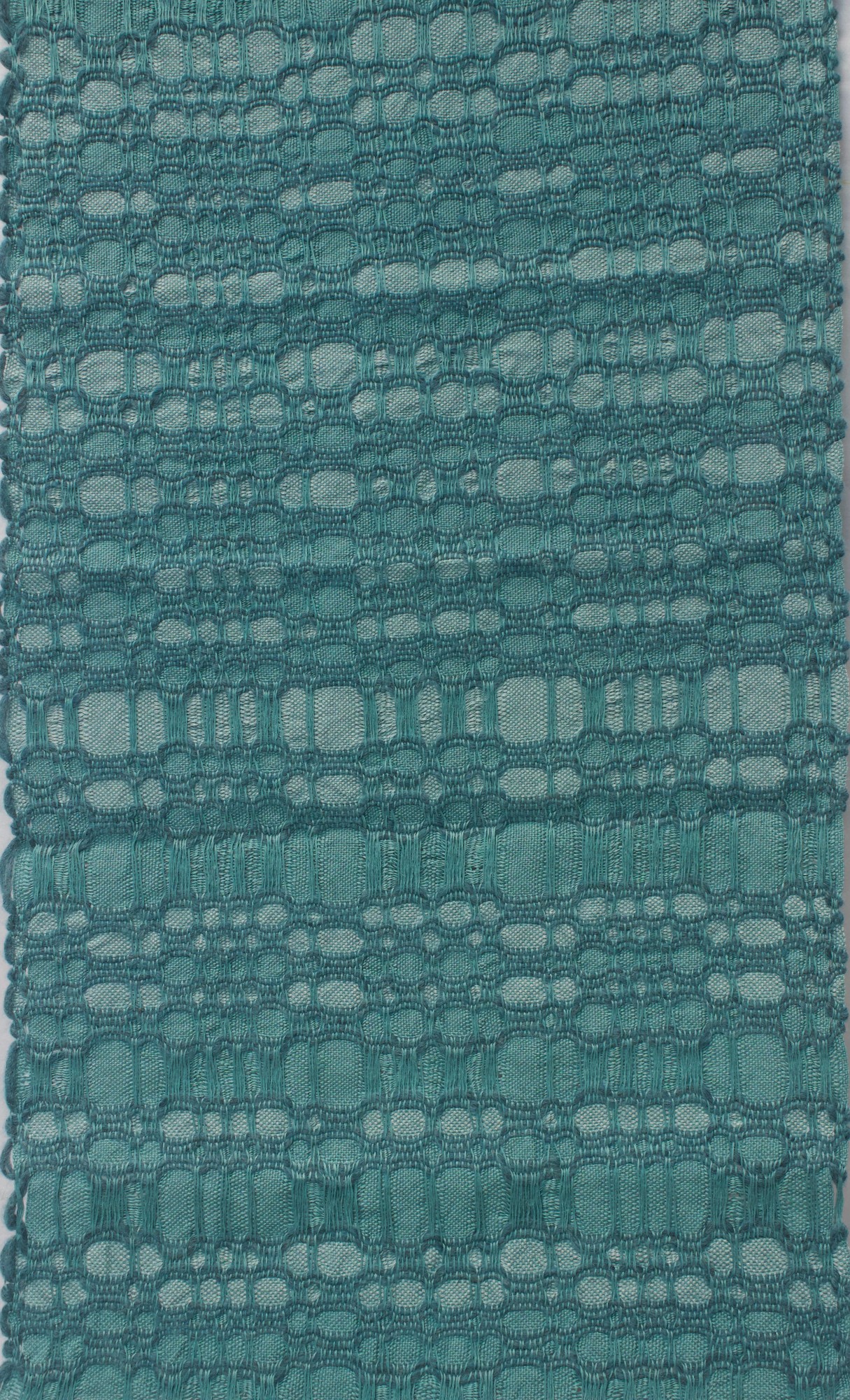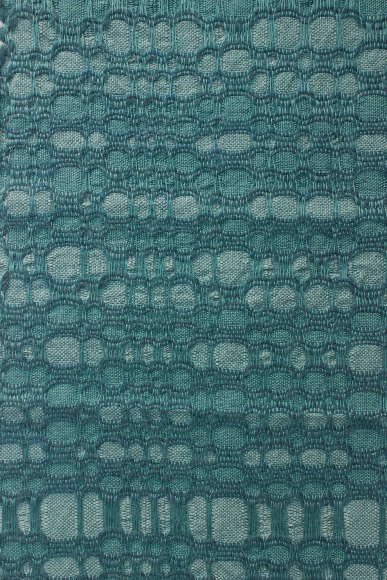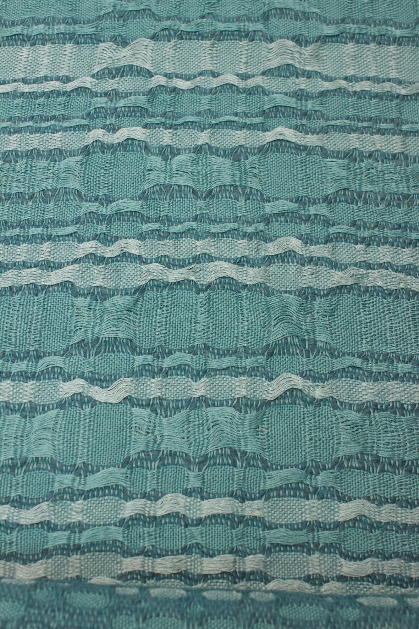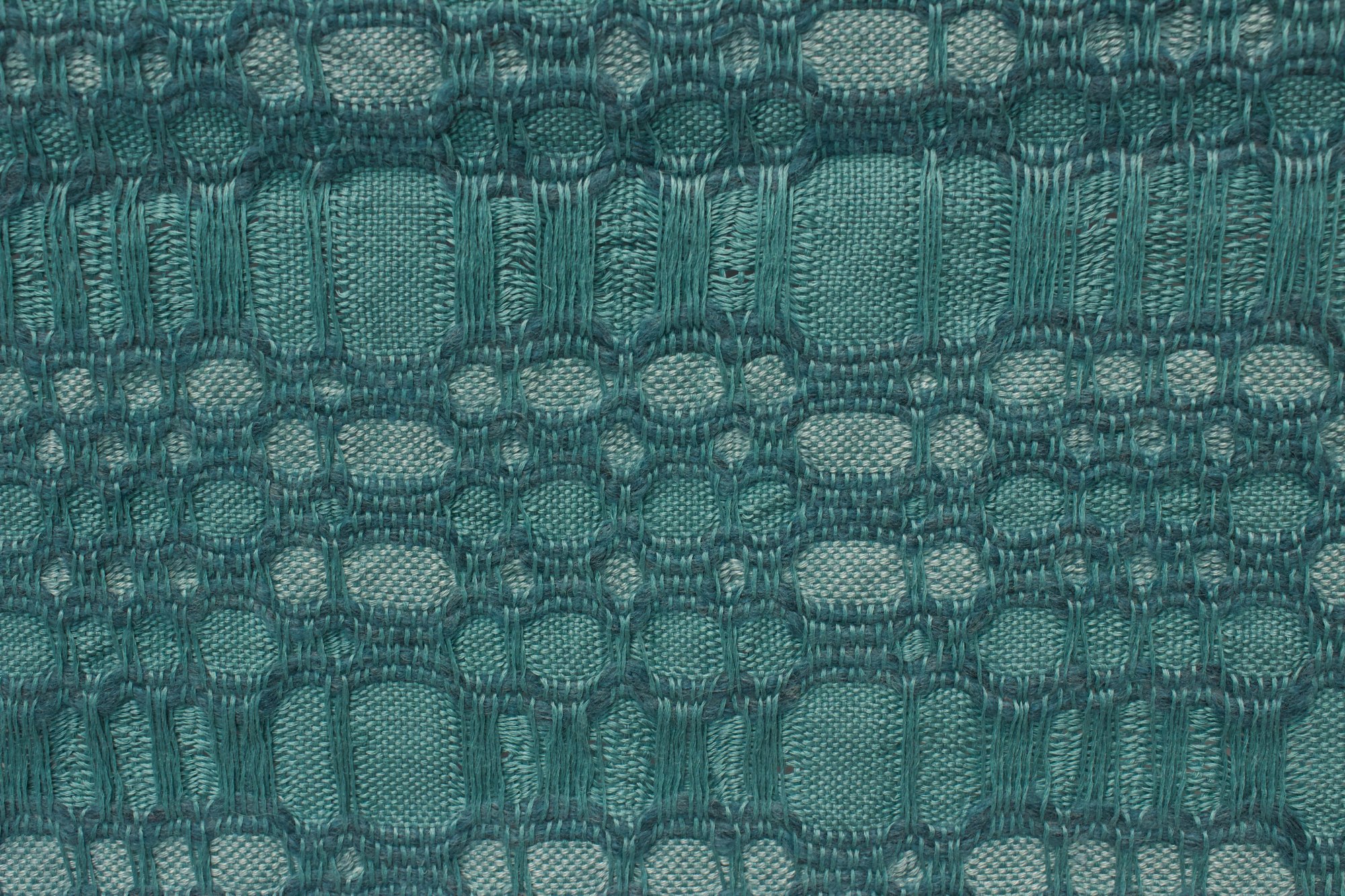 Wall hanging made from linen and rug yarn in verdigris.