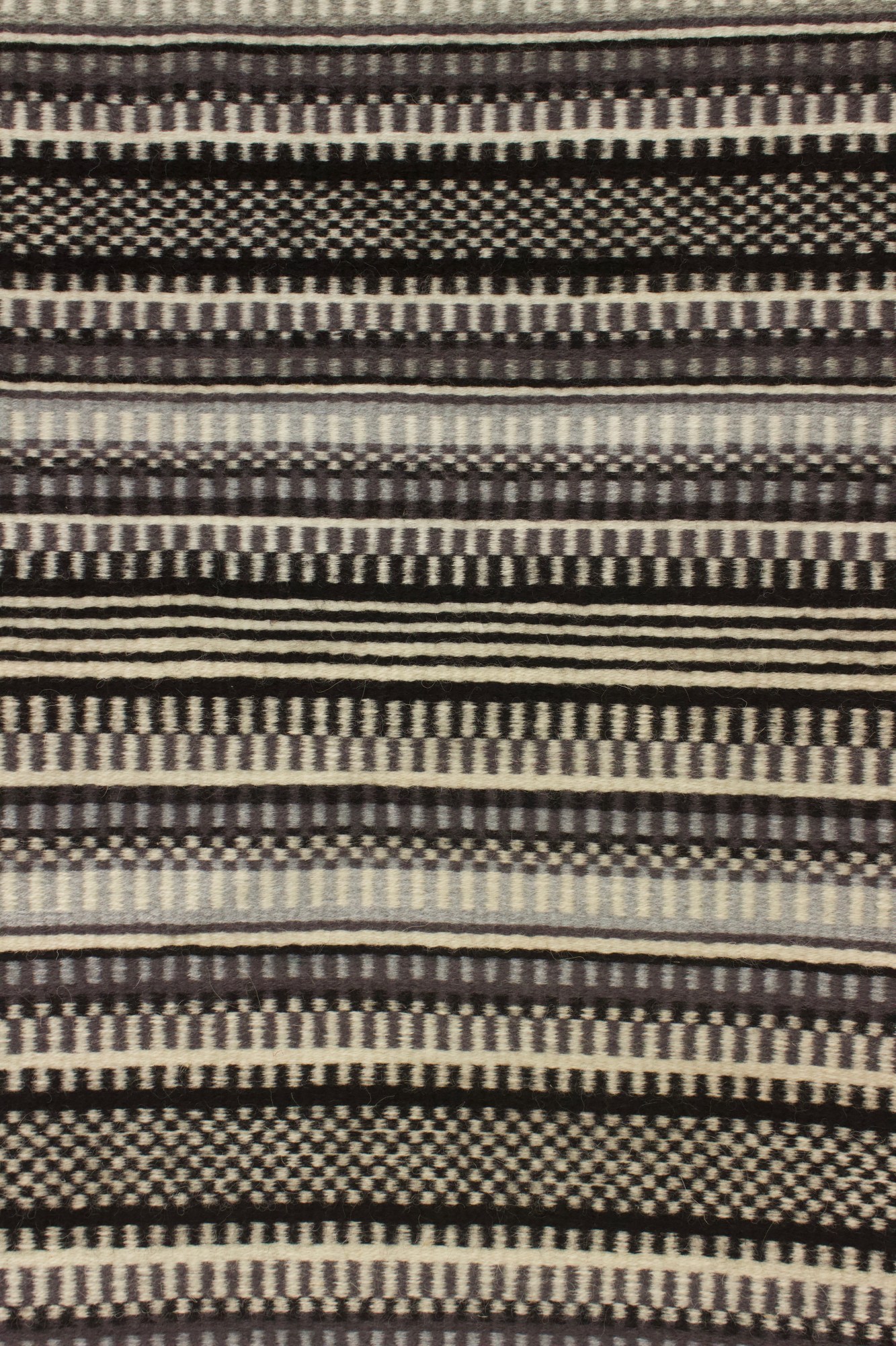 Wall hanging made from wool and cotton in white, black and grey. Kjerringtann pattern.