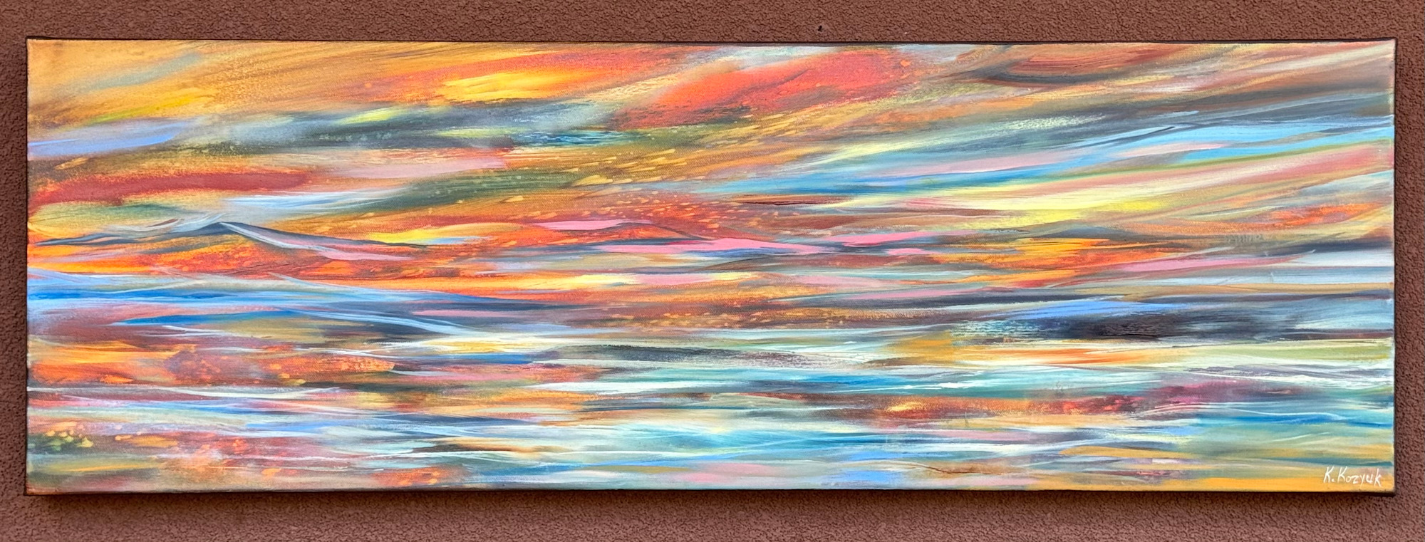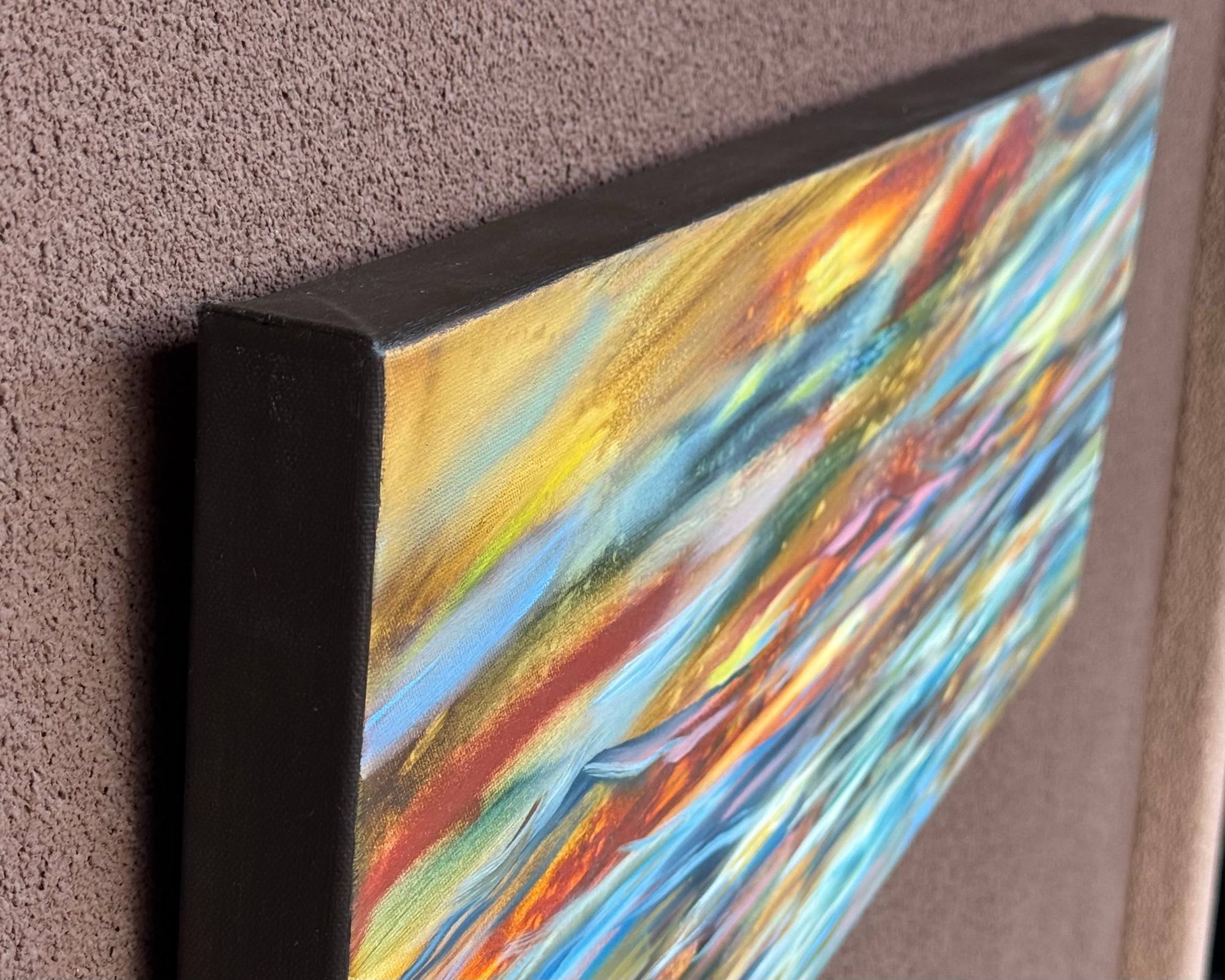 This piece balances warmth and coolness, offering a luminous, abstract vision of a horizon both earthly and celestial. A radiant field of orange fills the background where layered blue and pink horizontal marks stretch across the canvas like shifting skies. At the center, textured forms rise subtly, evoking the crest of distant mountains emerging from the glow.