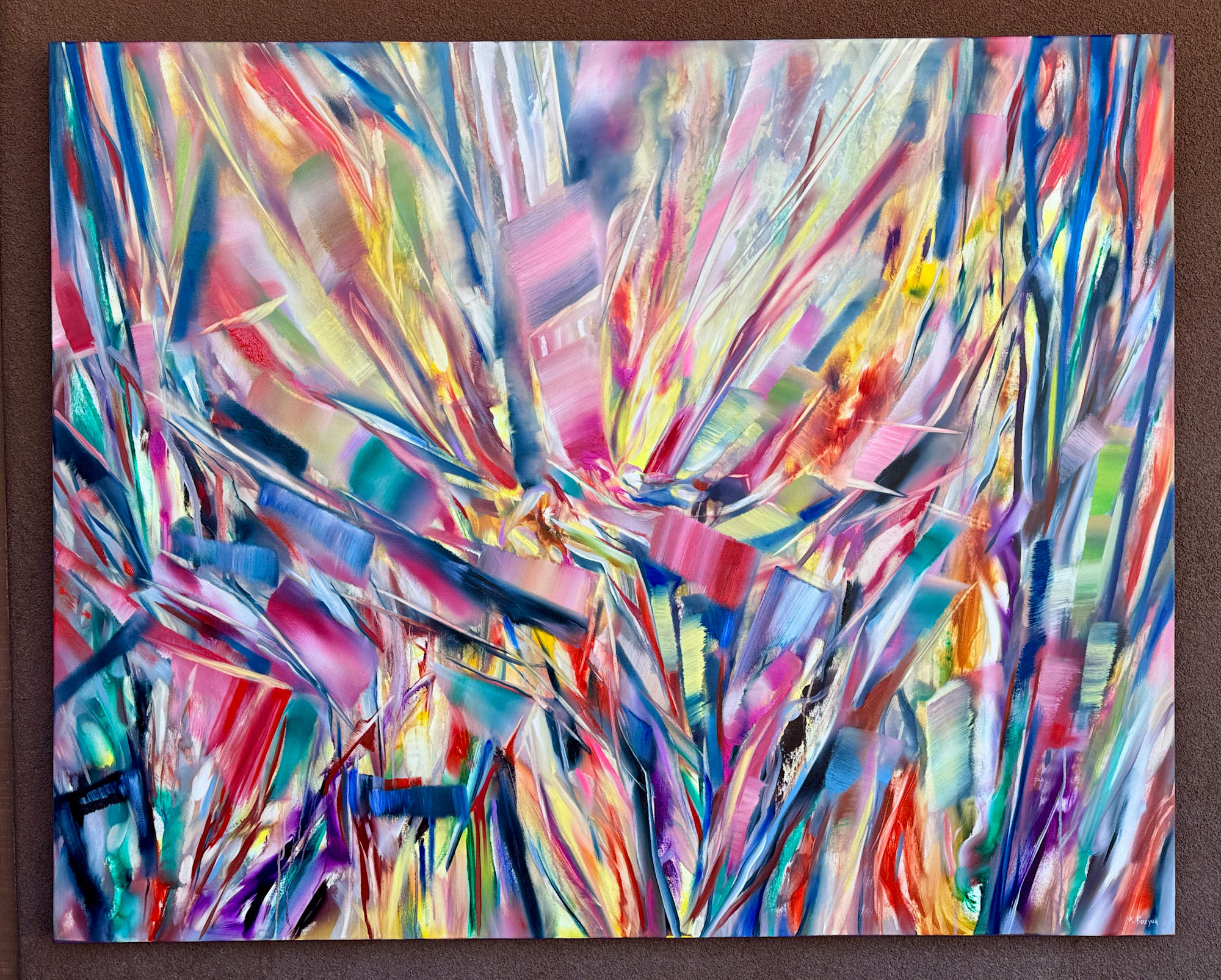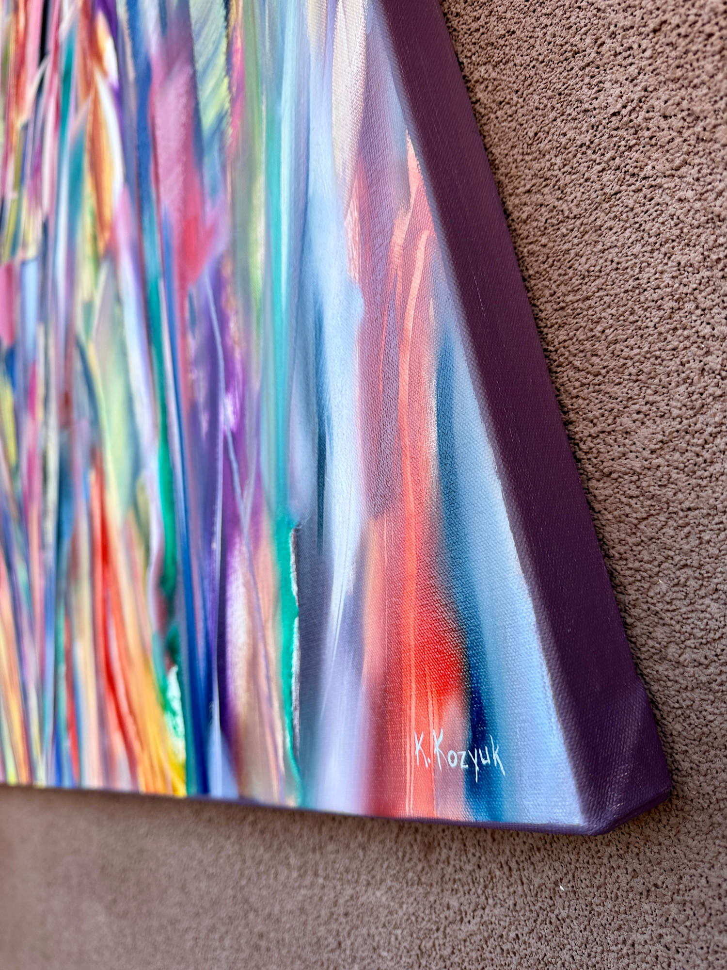 Vibrant color fields rise and intersect, creating a sense of upward momentum and transformation. Built through multiple layers of diluted oil paint, the surface reveals depth, texture, and rhythm, allowing colors to emerge gradually and organically. The work reflects a moment of transition where chaos resolves into clarity, and motion becomes meaning. The painting is inviting the viewer to move through the painting rather than simply observe it.