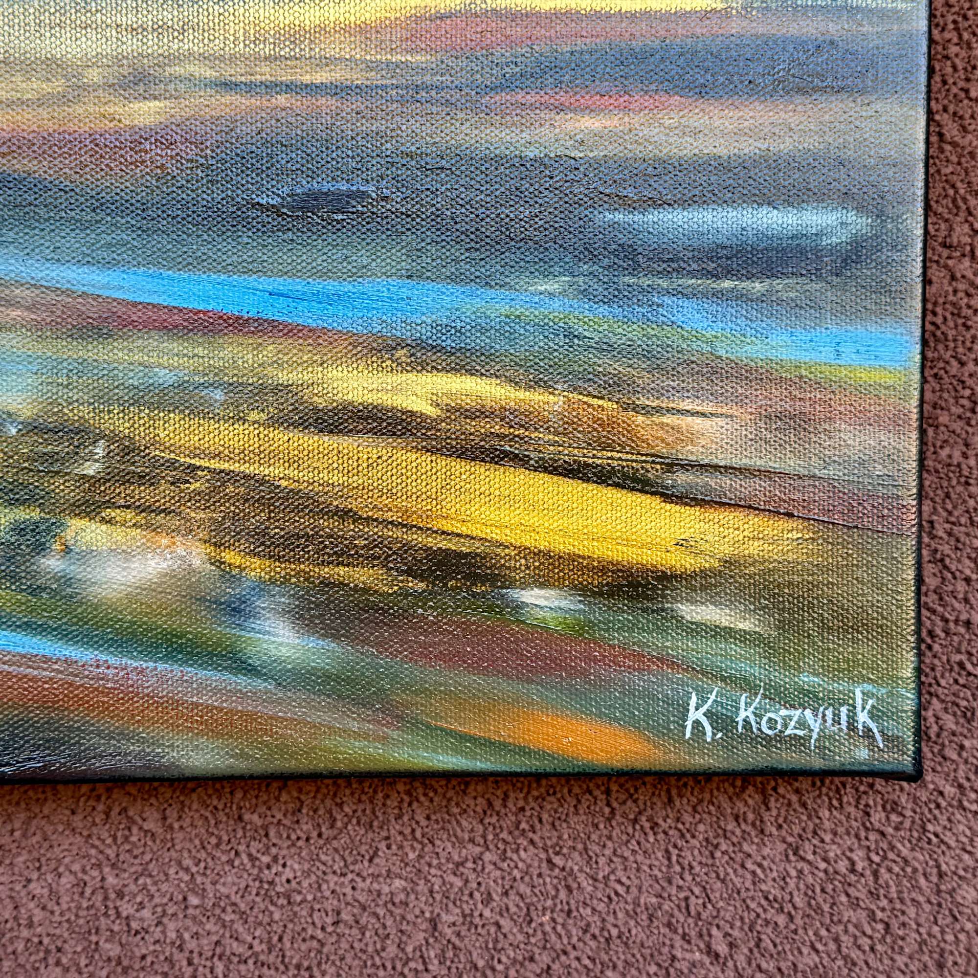 Orb Adrift is a painting that balances stillness and motion, creating an otherworldly, dreamlike atmosphere. It presents a near cosmic landscape with a single orange-hued orb floating central to the piece. The orb provides a focal point that appears to rise above a faint, almost mirage-like mountain landscape. Yellow streaks dart across the scene, add energy and movement, as though light is breaking through the expanse.