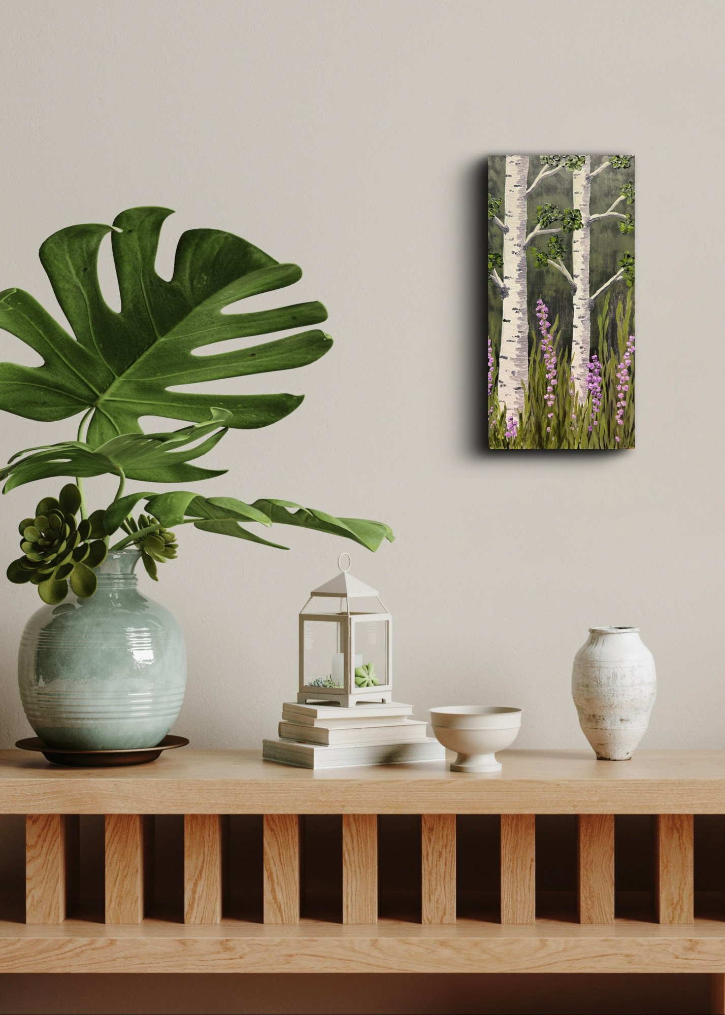 This painting was inspired by the wild flowers and trees that grow in the ravine behind my home in Calgary, Canada.