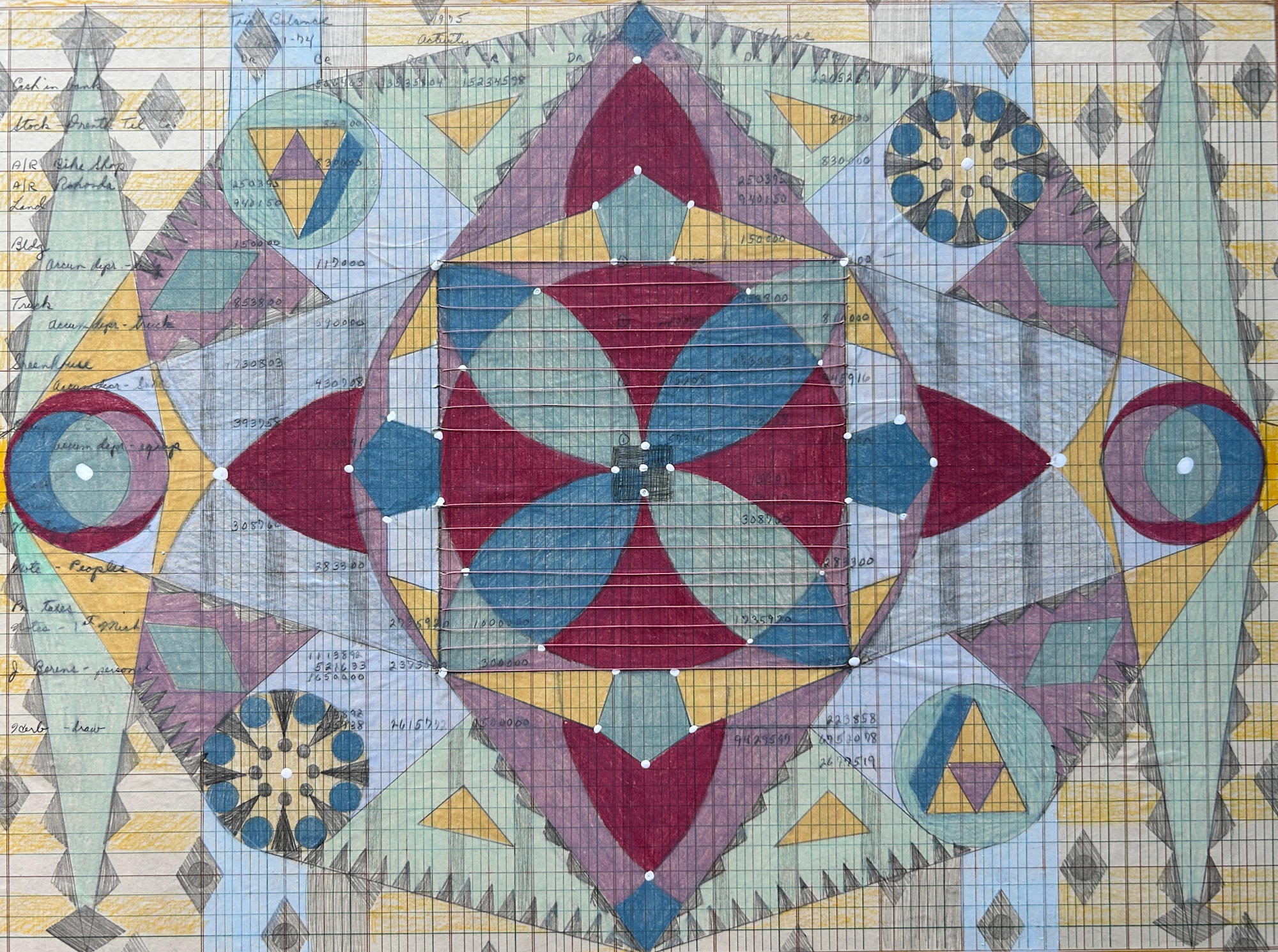 Color pencil + embroidery on vintage ledger paper + adhered to panel + sealed in cold wax