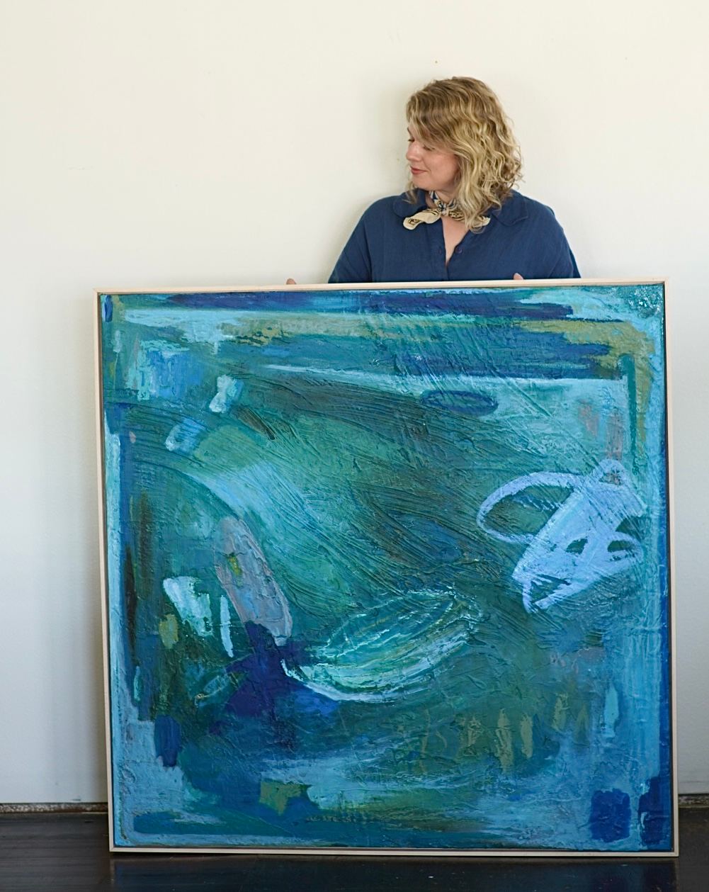 oil and mixed media on canvas framed in maple float frame