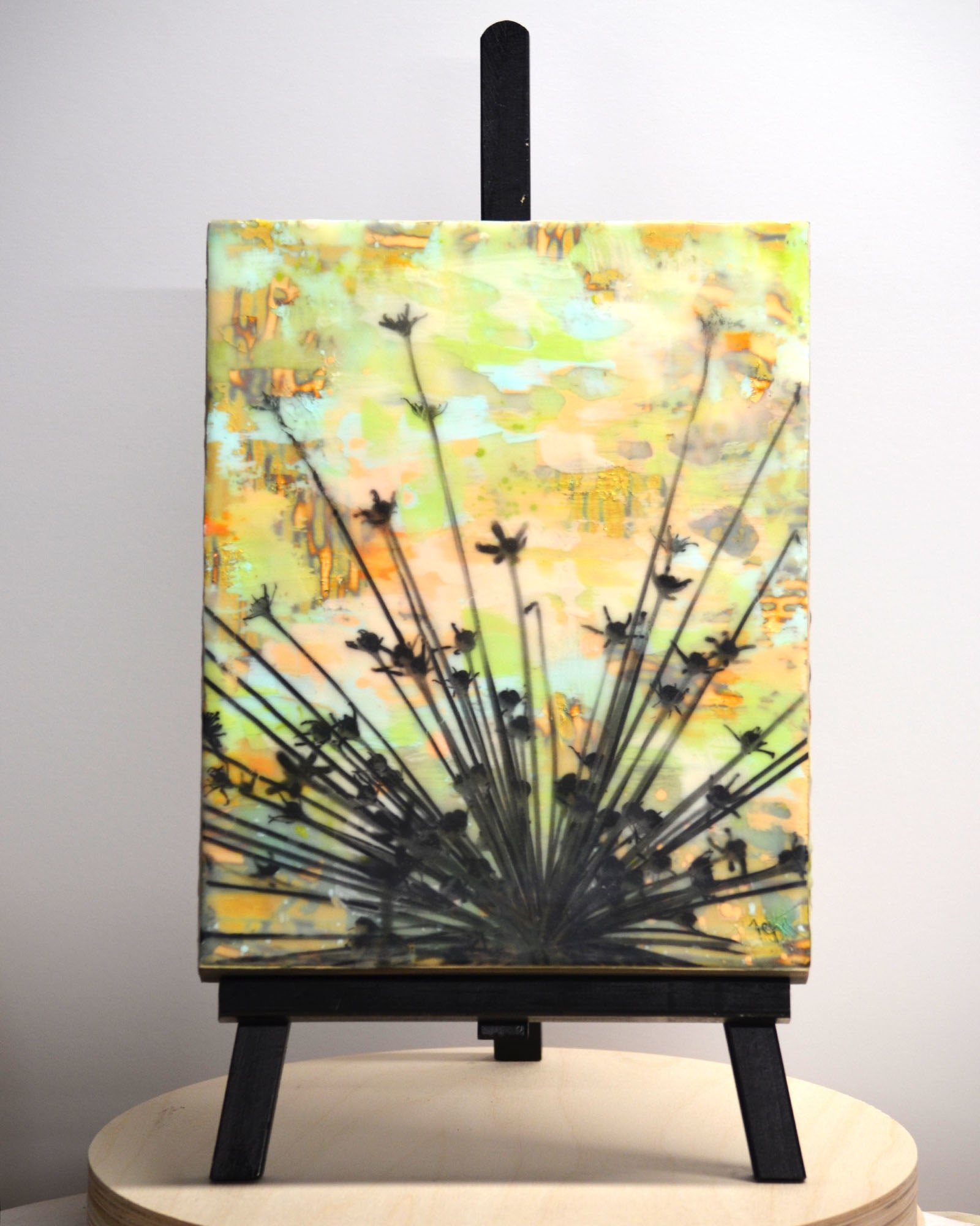 This artwork was created by torch fusing clear encaustic medium, various encaustic paints, oil pastels, and pan pastels. There are also several images burnished into different layers of wax. The image was taken at Dow Gardens in Midland, MI.