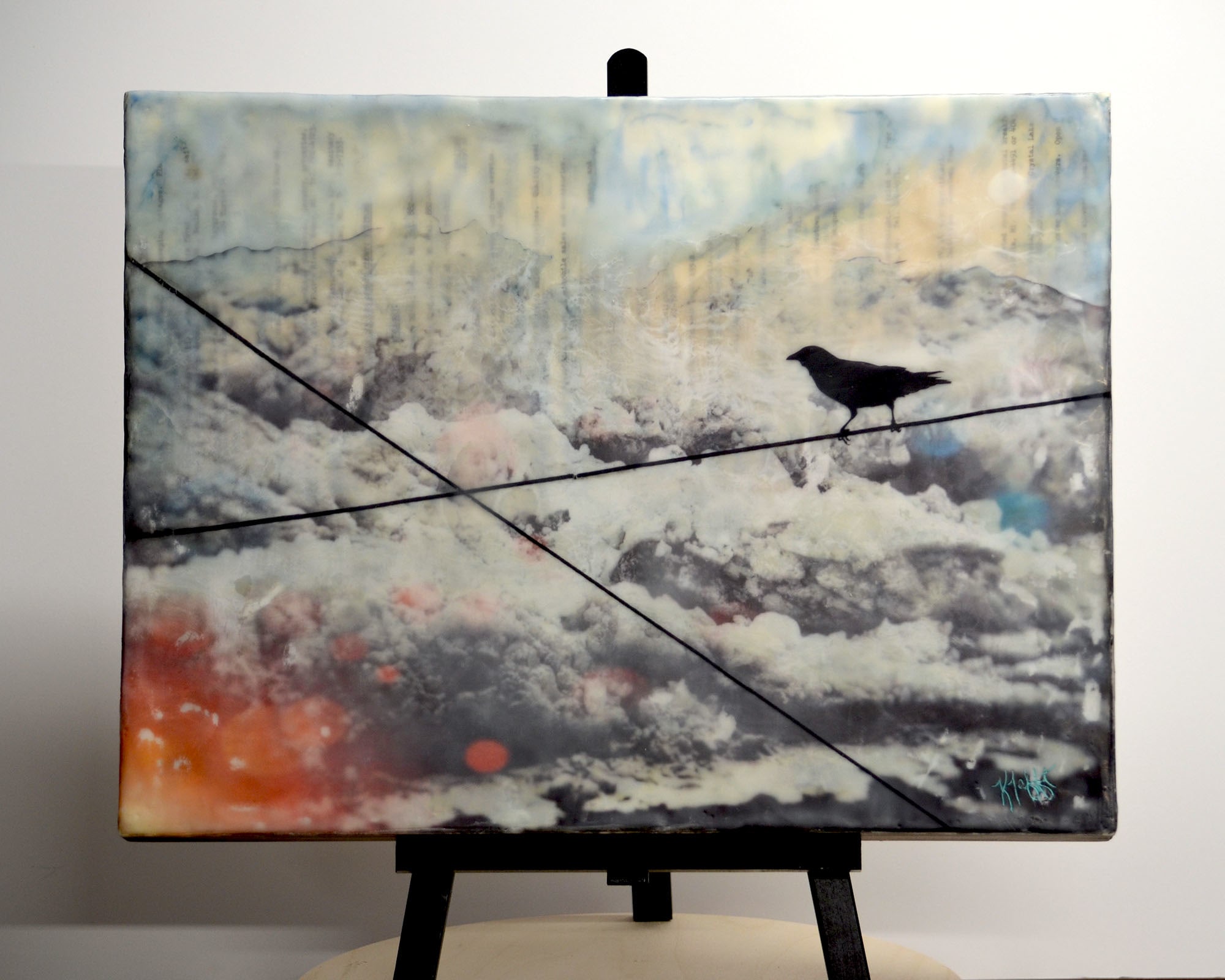 This piece was created with a photo of a dirty snowbank in a parking lot. My goal was to take a simple, unimpressive image and give it power. In this case, the dirty snow took on a power of its own and things got complicated. This artwork was created by torch fusing clear encaustic medium, white encaustic paint, oil pastels, then adding a digitally edited photo of a melting snowbank in late February.