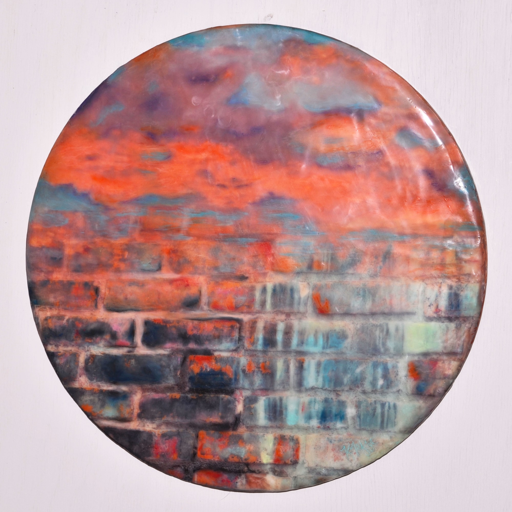 Left to its own devices, nature is a force to be reckoned with and will eventually take back what once was hers. This piece is a tribute to the melting point between man-made industrials and natural beauty. This artwork was created by torch fusing clear encaustic medium, white encaustic paint, oil pastels and by burnishing a photo of aging bricks taken in Bay City and a sunset image taken in Midland, MI.