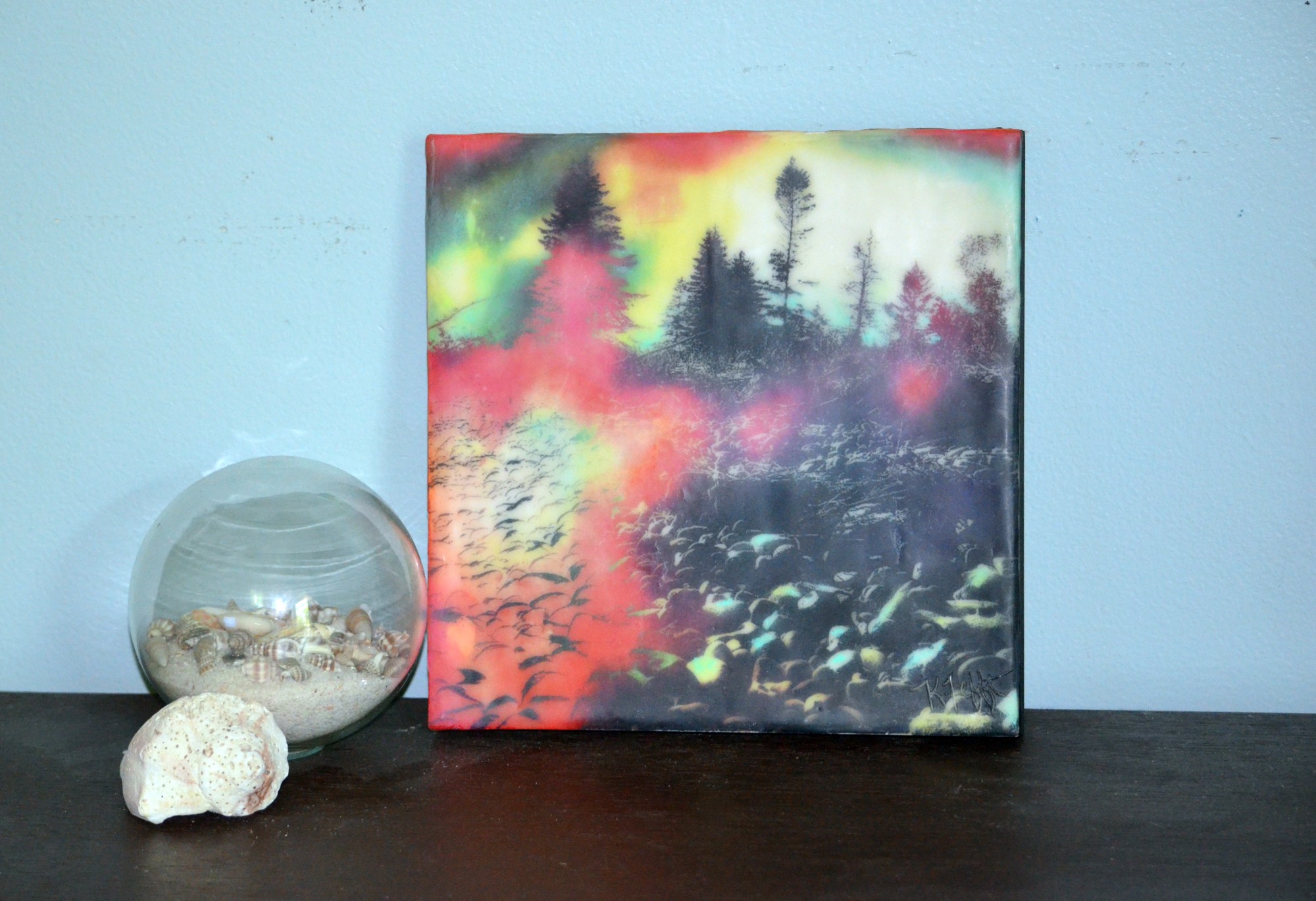 This piece was inspired by the effects of chemicals on nature. This artwork was created by torch fusing clear encaustic medium, white encaustic paint, oil pastels and then burnishing a digitally edited image of trees taken in Detour, MI.