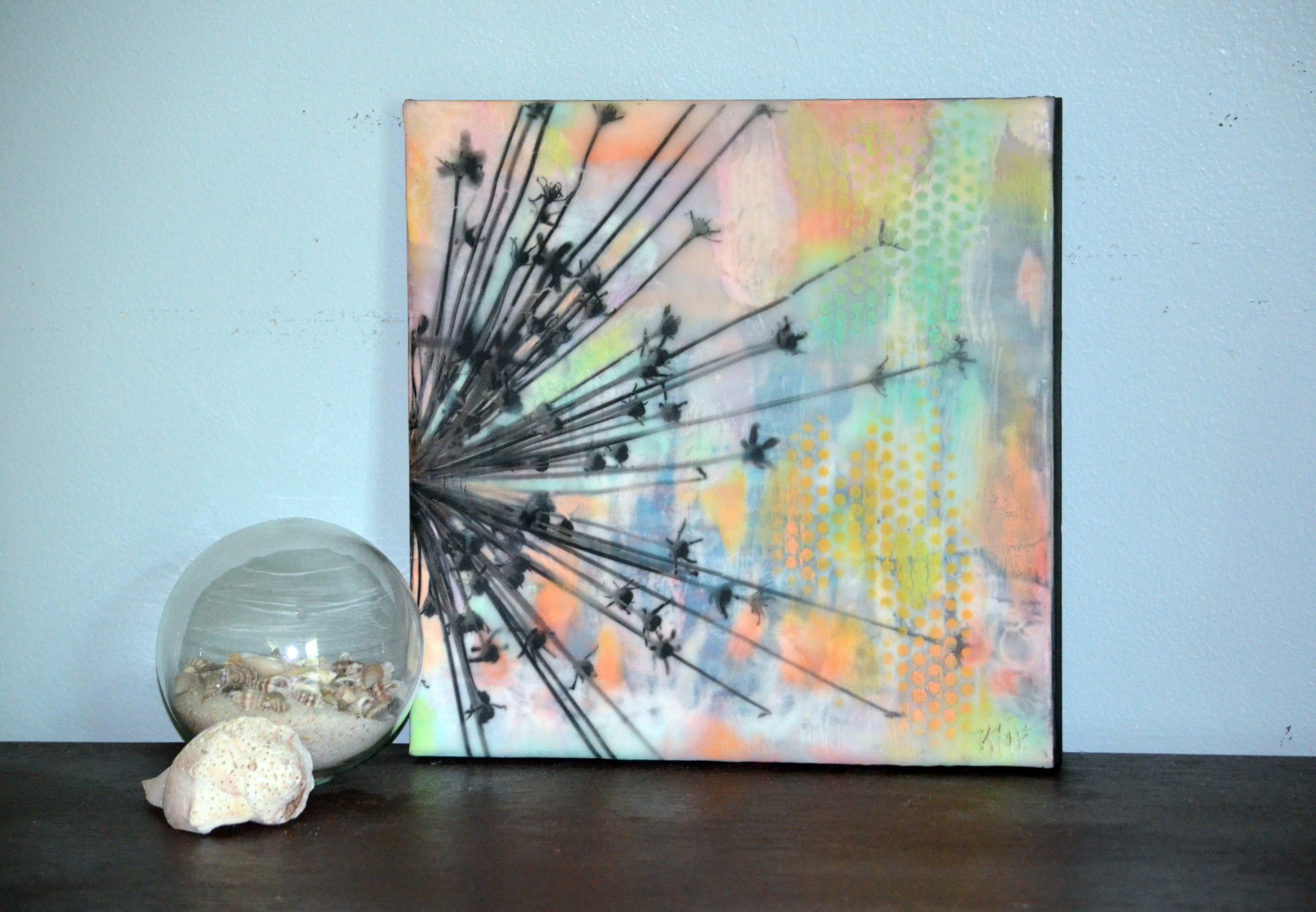 This fun little piece has it all, texture, color and a bold graphic image. This artwork was created by torch fusing and layering clear encaustic medium, encaustic paints, pan pastels and by burnishing an image of a flower taken in Midland, MI.