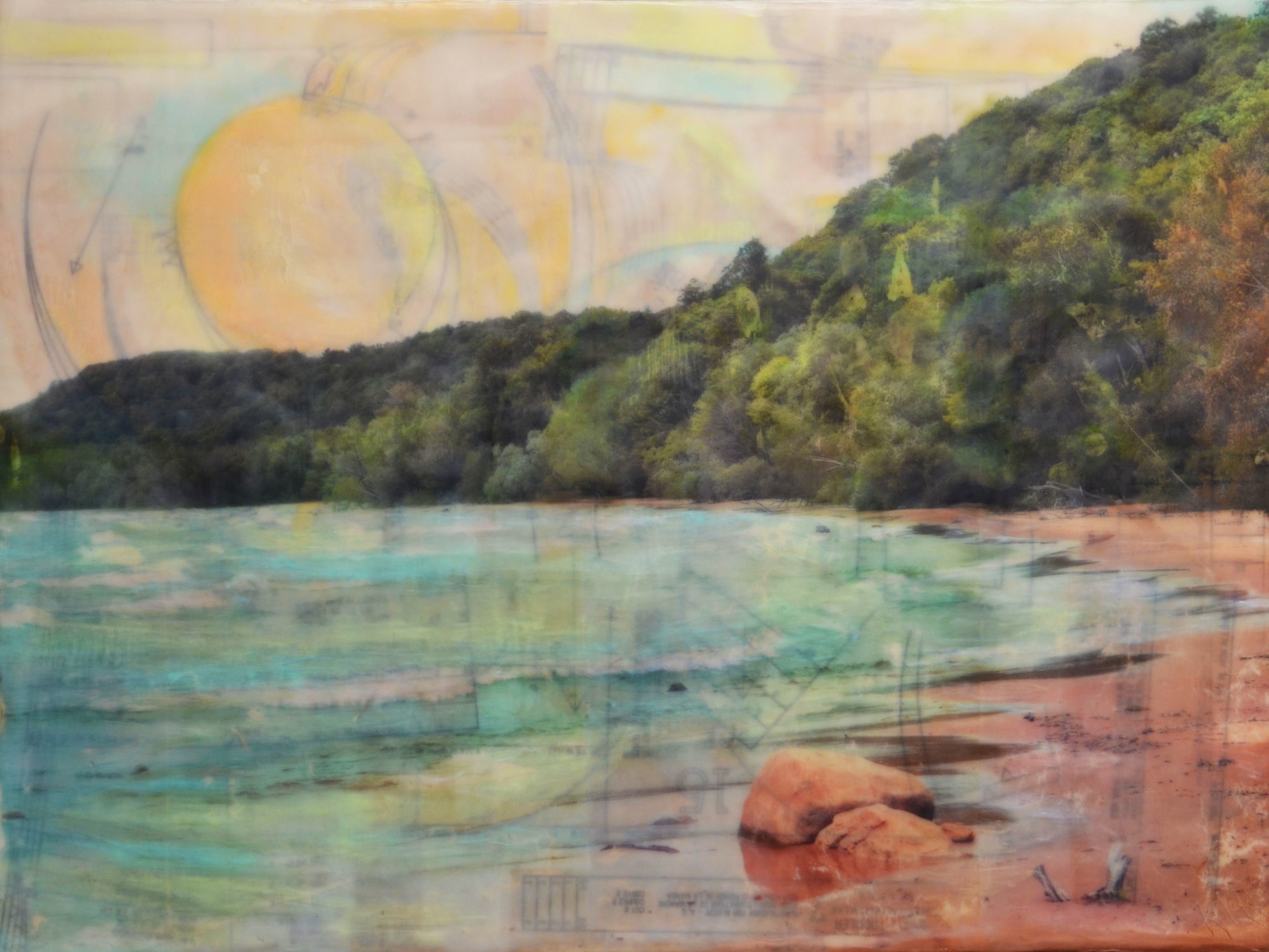 This artwork was created by torch fusing clear encaustic medium, various encaustic paints, oil pastels, oil paints and pan pastels. There is also an image burnished into the wax of this painting, layered on top of various collage materials. The image was taken in St. Ignace, Michigan.