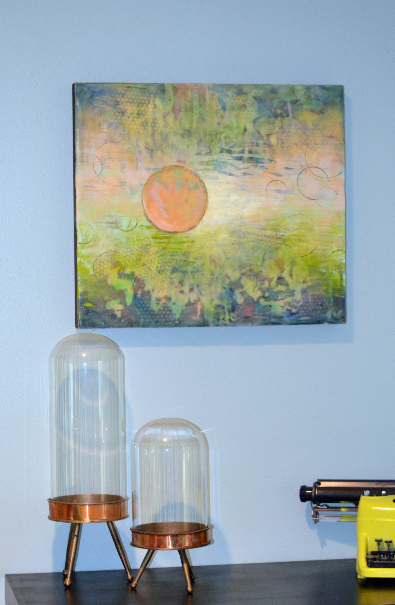 This piece was inspired by a marshy wonderland, during sunset. This artwork was created by torch fusing clear encaustic medium, various encaustic paints, oil pastels, oil paints and pan pastels. There are also several images burnished into different layers of this painting.