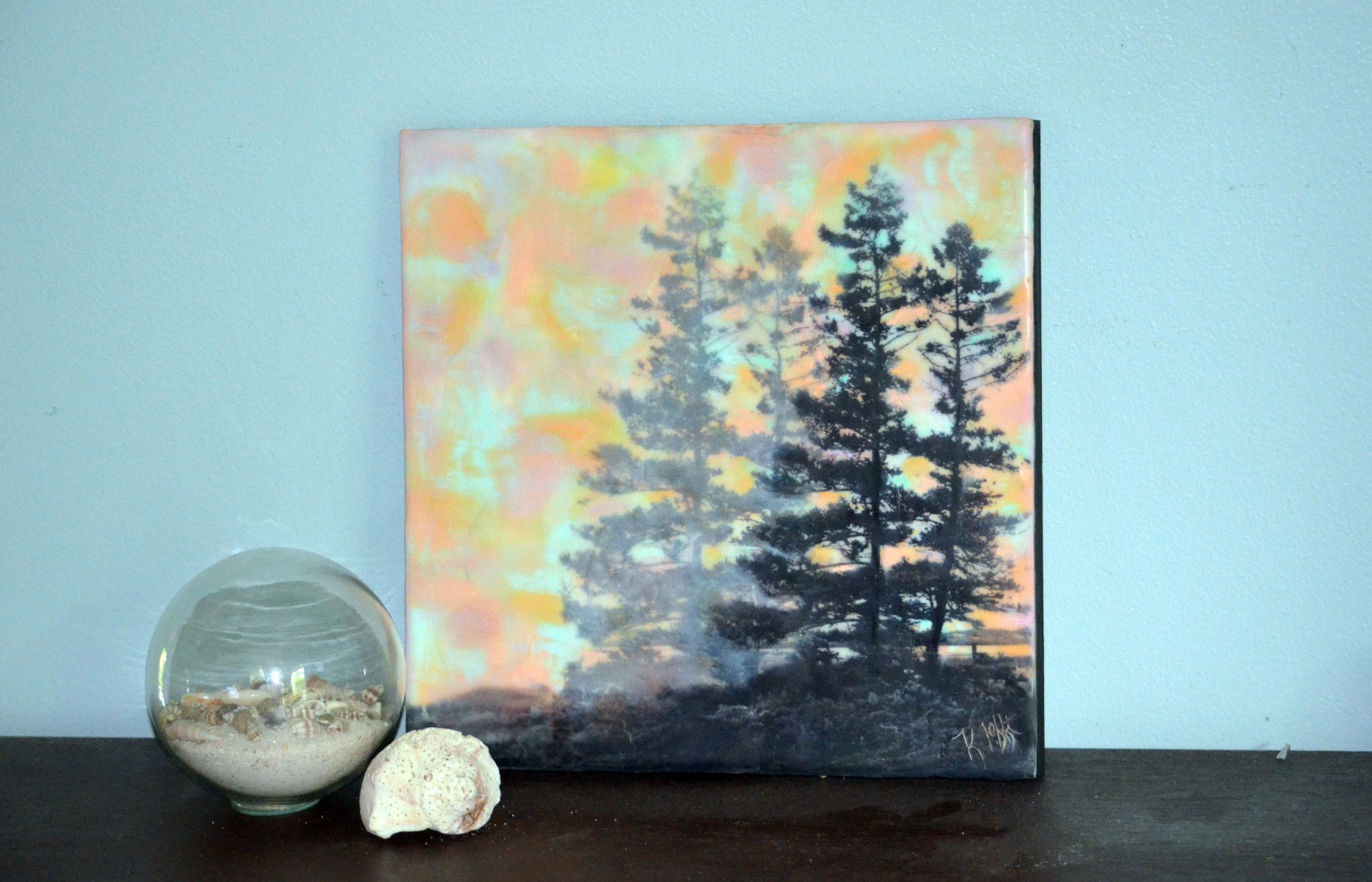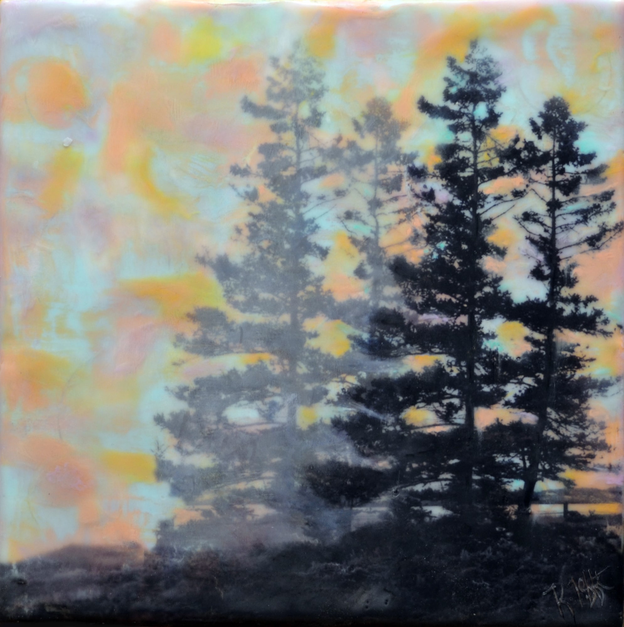 These trees stand on their own and won’t retreat into the background. This artwork was created by torch fusing and layering clear encaustic medium, encaustic paints, and by burnishing images of trees taken in Detour, MI.