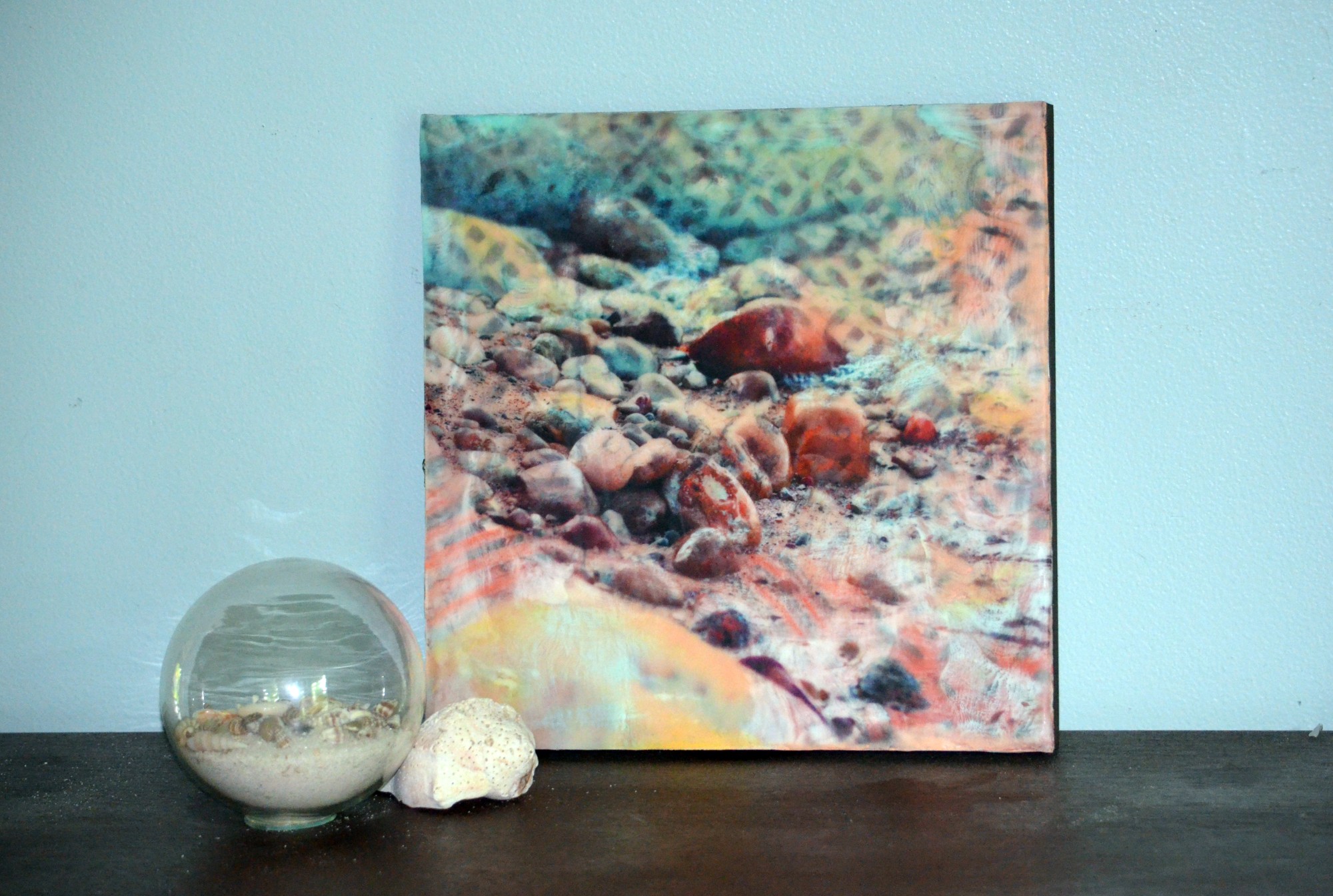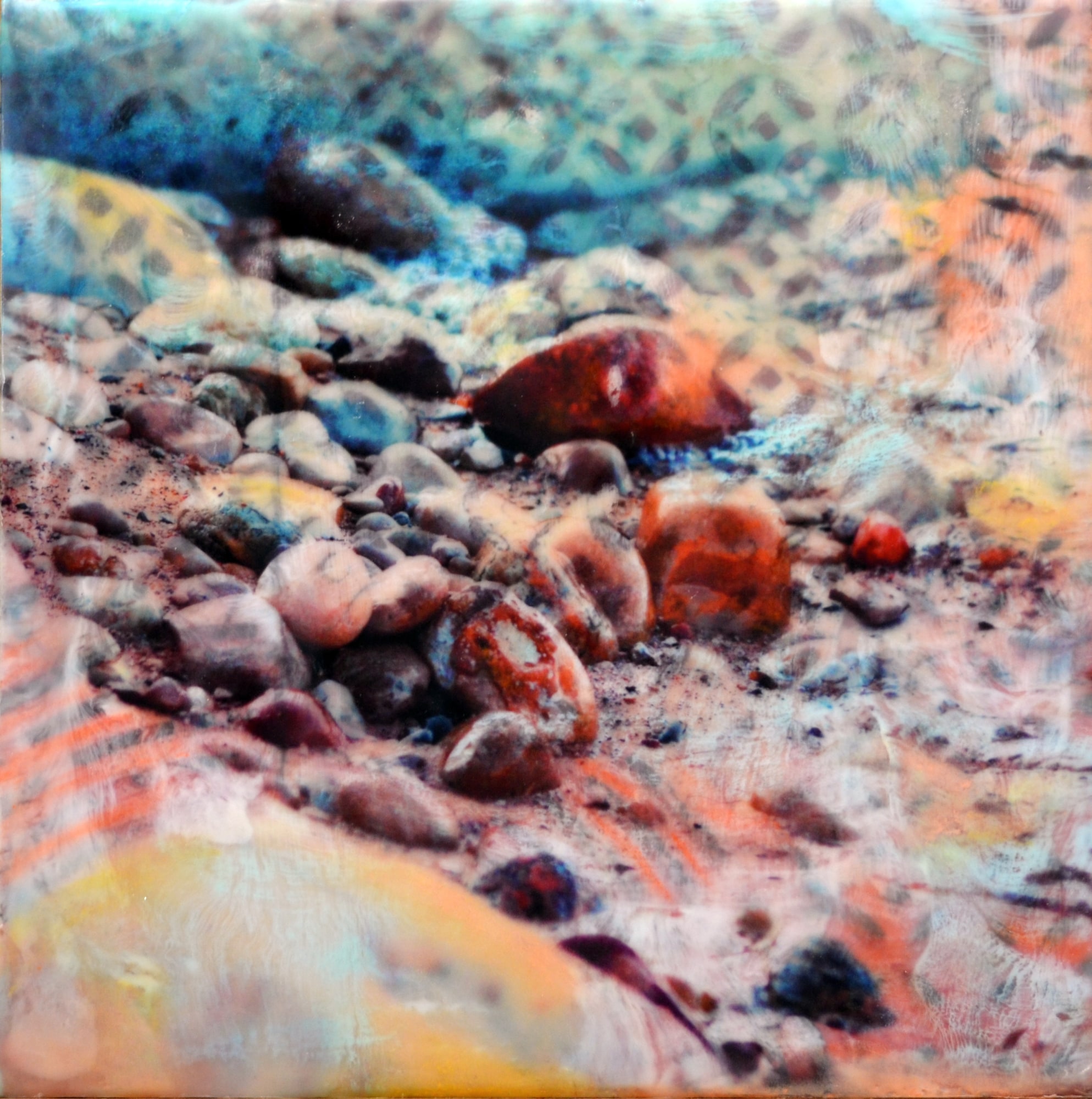This artwork was created by torch fusing and layering clear encaustic medium, encaustic paints, pan pastels and by burnishing an image of rocks taken in Detour, MI.