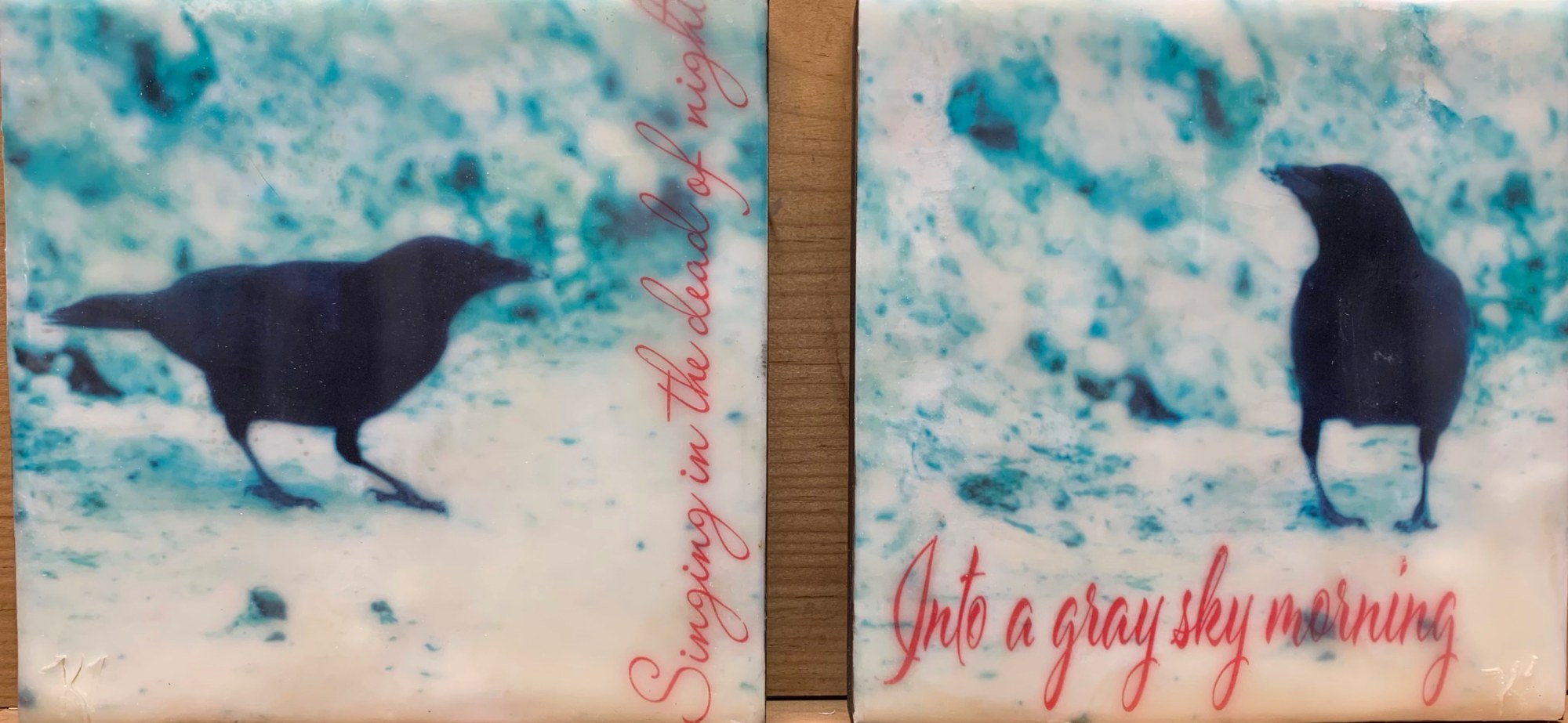 This matching pieces were created by torch fusing clear encaustic medium, various encaustic paints and oil pastels. There are also images burnished into the wax of these paintings, layered on top of various collage materials.