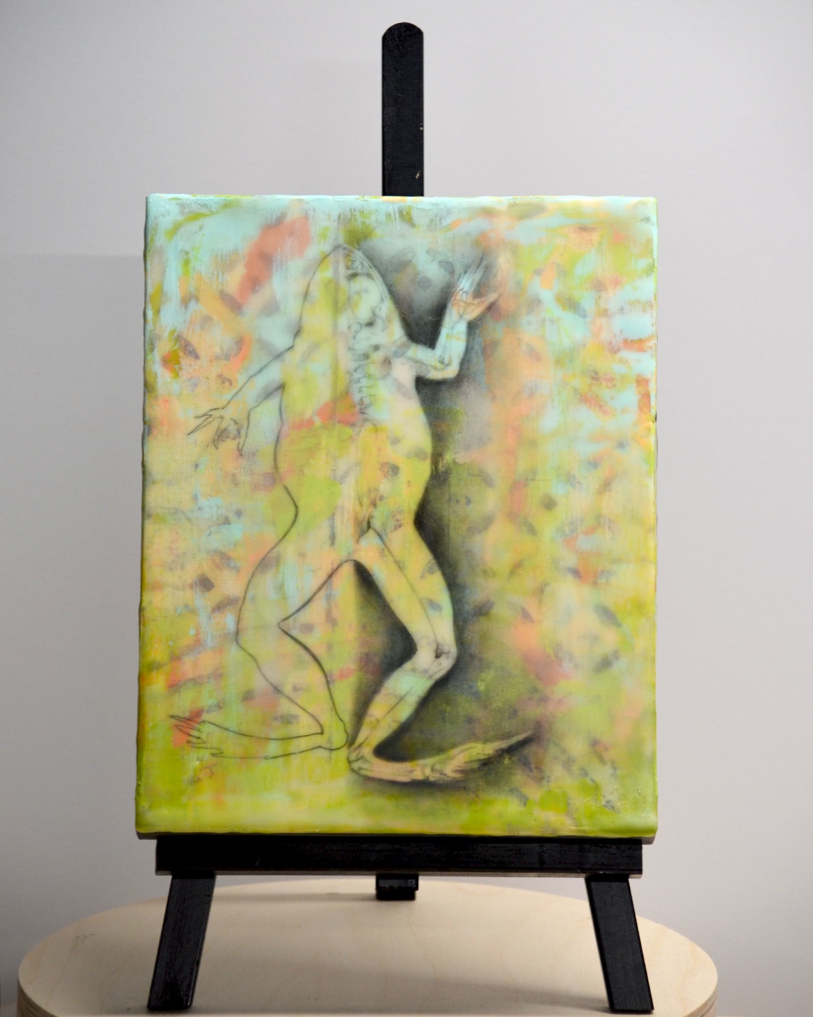 This artwork was created by torch fusing clear encaustic medium, various encaustic paints, oil pastels, and pan pastels. There are also several images burnished into different layers of wax. The main image was an anatomy drawing I completed several years ago.