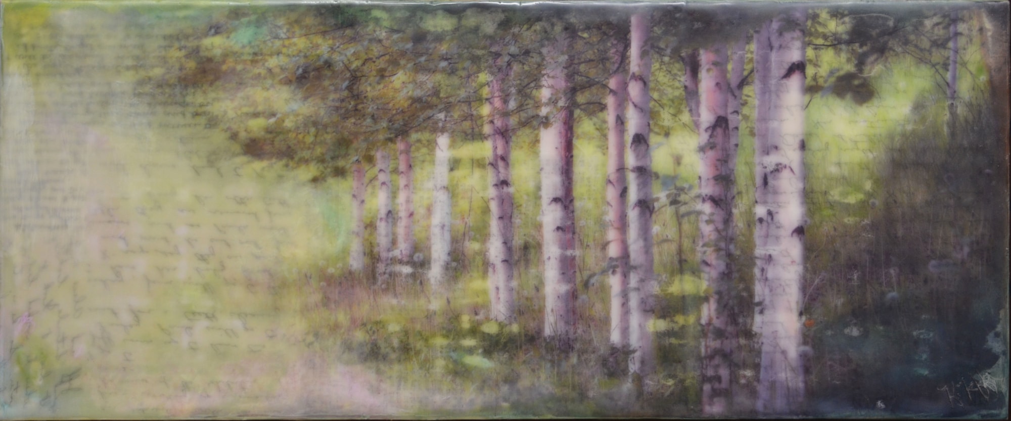 This artwork was created by torch fusing clear encaustic medium, various encaustic paints, oil pastels, oil paints and pan pastels. There are also several images burnished into different layers of this painting. One of these images is of a beautiful line of birch trees taken in Alaska.
