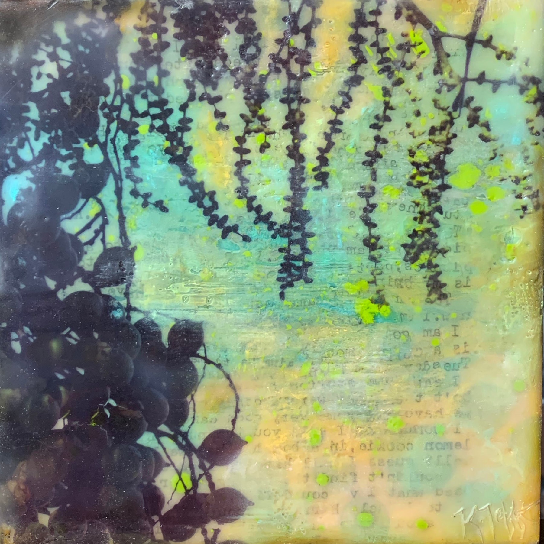 A warm and tropical vibe created with collage materials, oil pastels and several layers of encaustic wax.