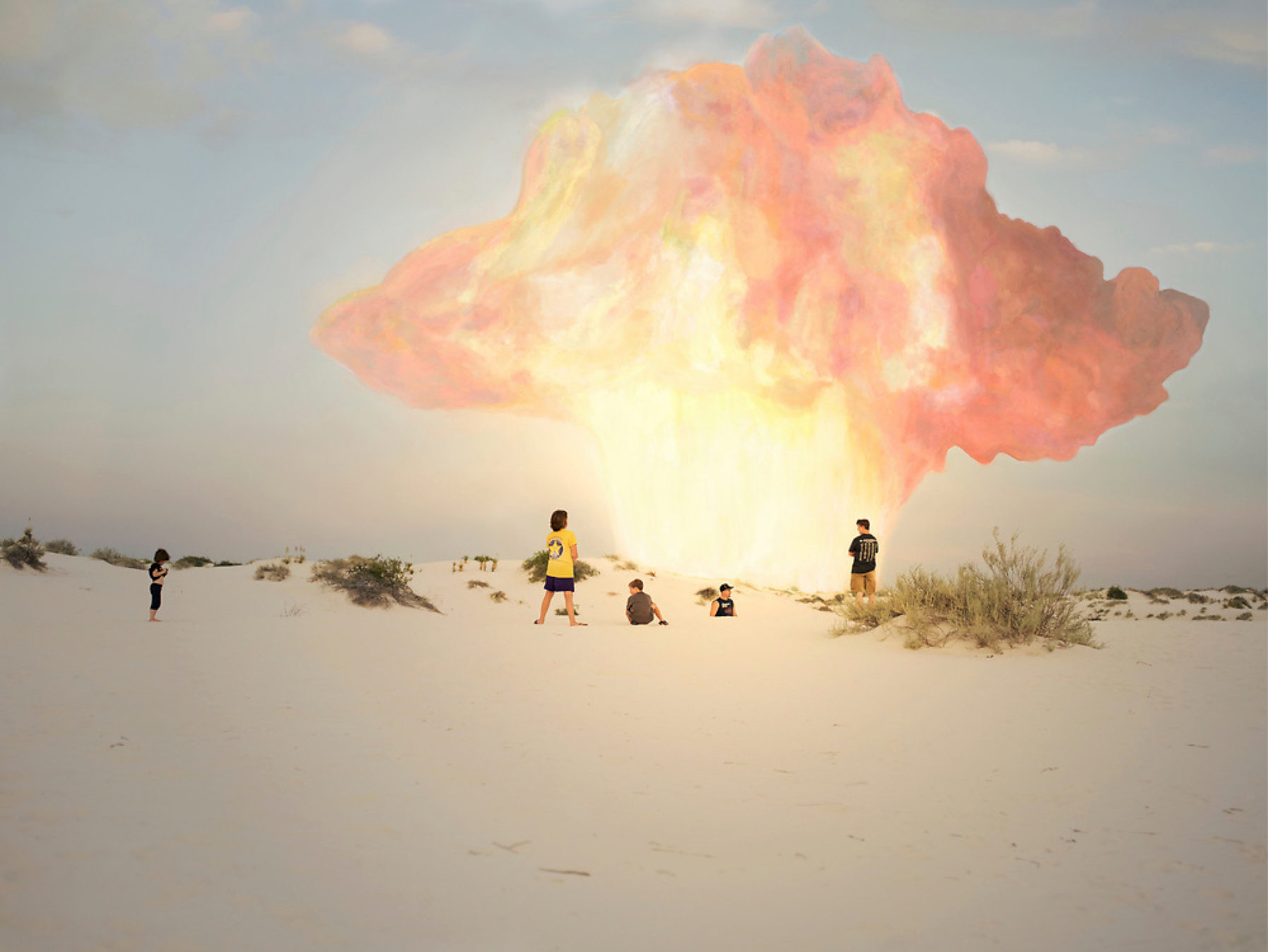The image is intended to collapse the temporal distance between the present day and July 16, 1945—the date of the world’s first nuclear detonation at the Trinity Site. The figures in the frame are strangers, passing through the scene at a distance.