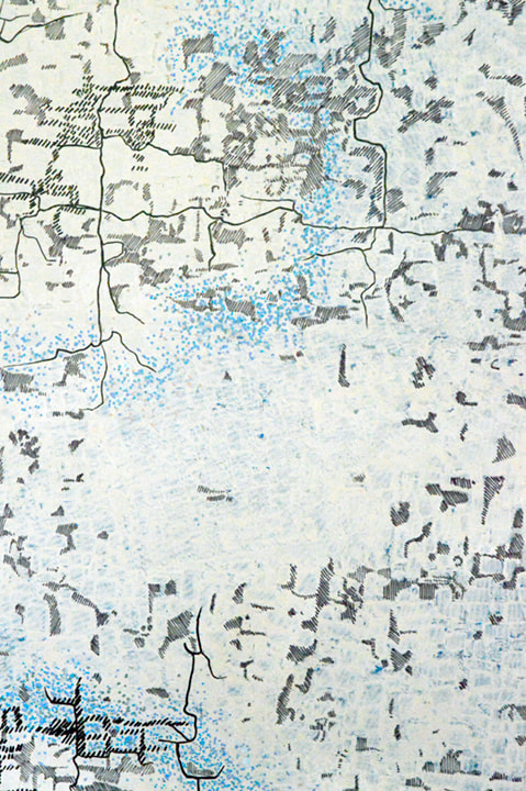 Two semi-transparent vellum panels with layers of marks, patterned acrylic and gouache creating imagined landscapes. Can be hung together or viewed/bought separately. $850 price is per panel.