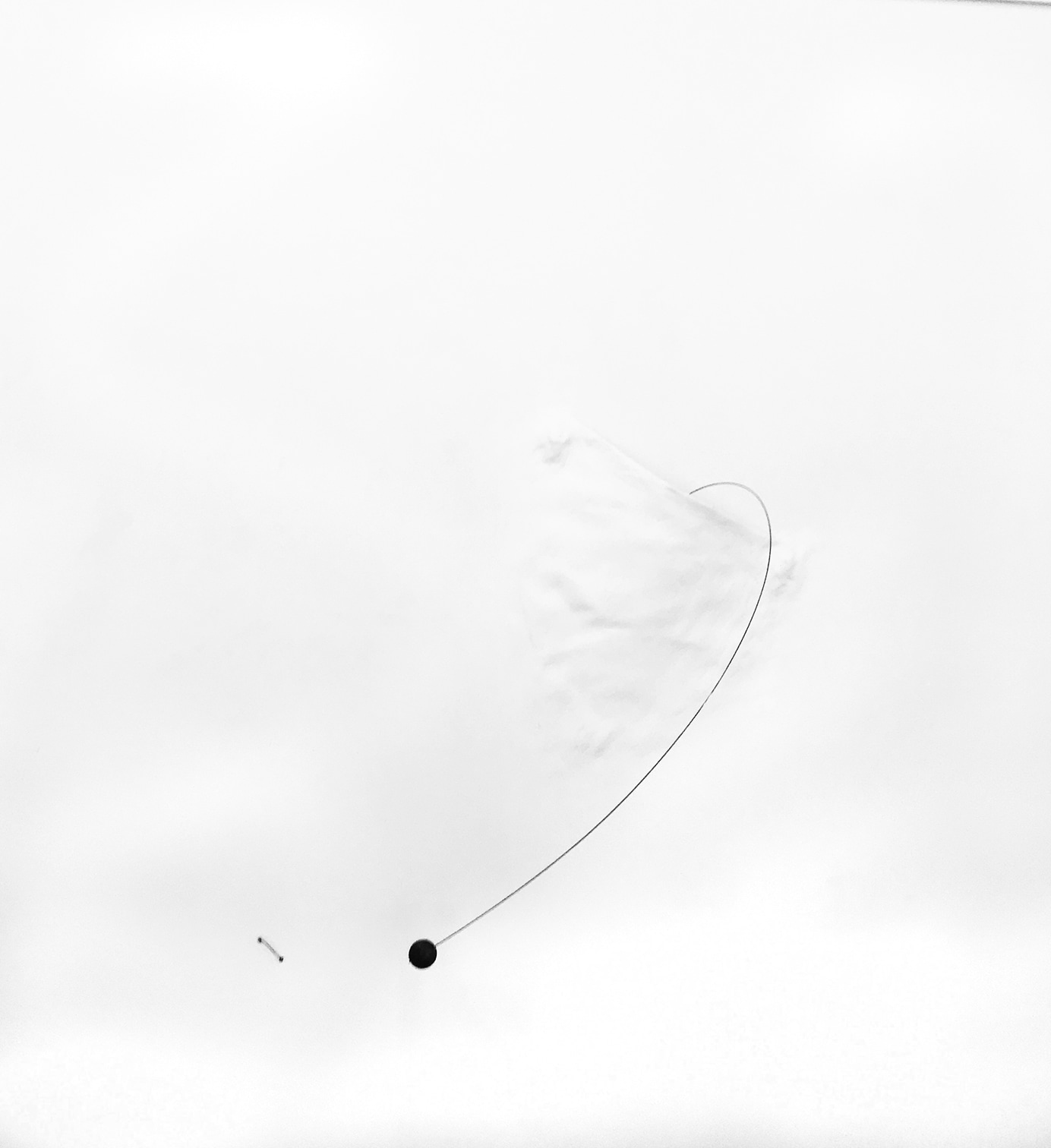 Steel wire coming out of a plaster pocket emerging from the wall. A rubber orb is at the end of the steel wire and has a monofilament line and fish hook embedded in the wall.