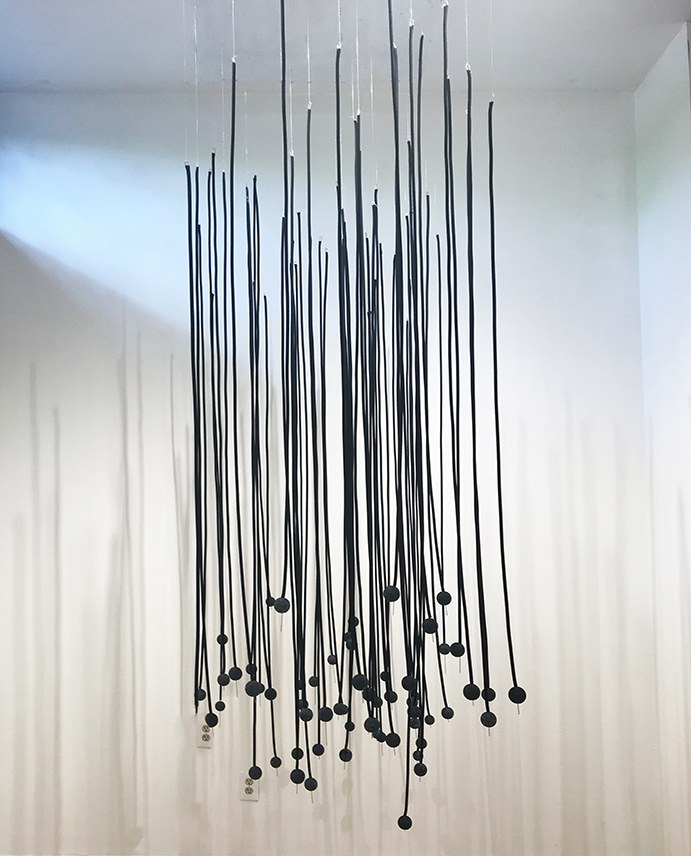 Interactive installation on suspended steel wire encased in rubber with rubber orbs at the end of each line. Kinetic energy created by air movement and touch by moving through through the lines.