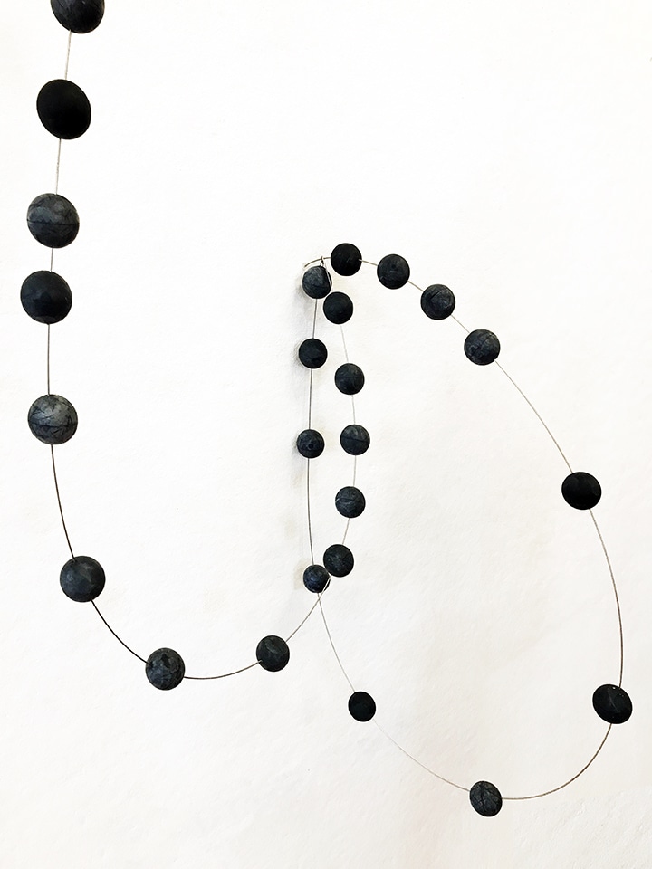 Looping steel wire with intermittent rubber orbs along it's length. The loop emerges from the wall in one place and returns into the wall after a circuitous path.